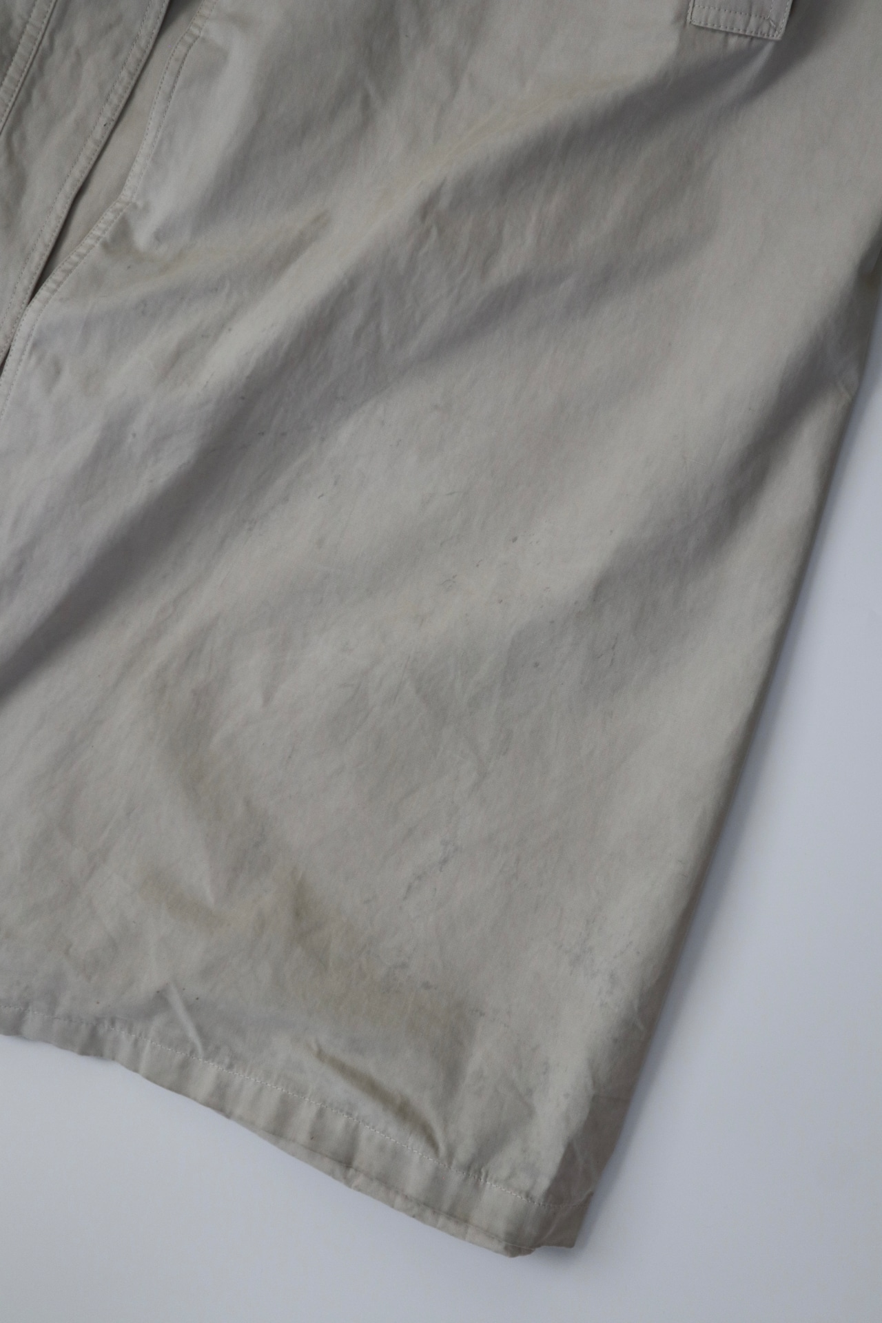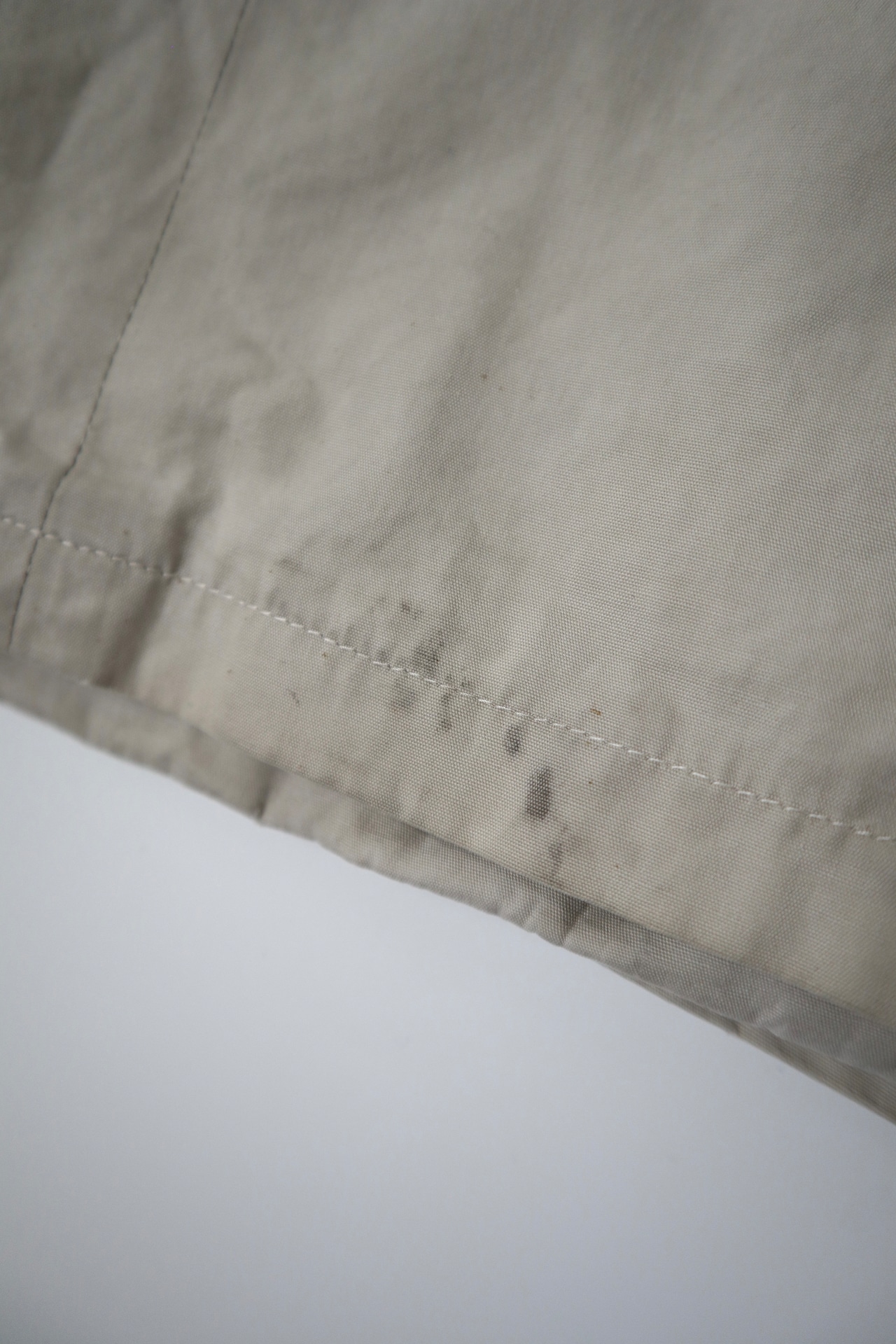 破れなどの大きなダメージは見当たりませんが、裾近くや袖先付近に黒いシミが多く見られ、