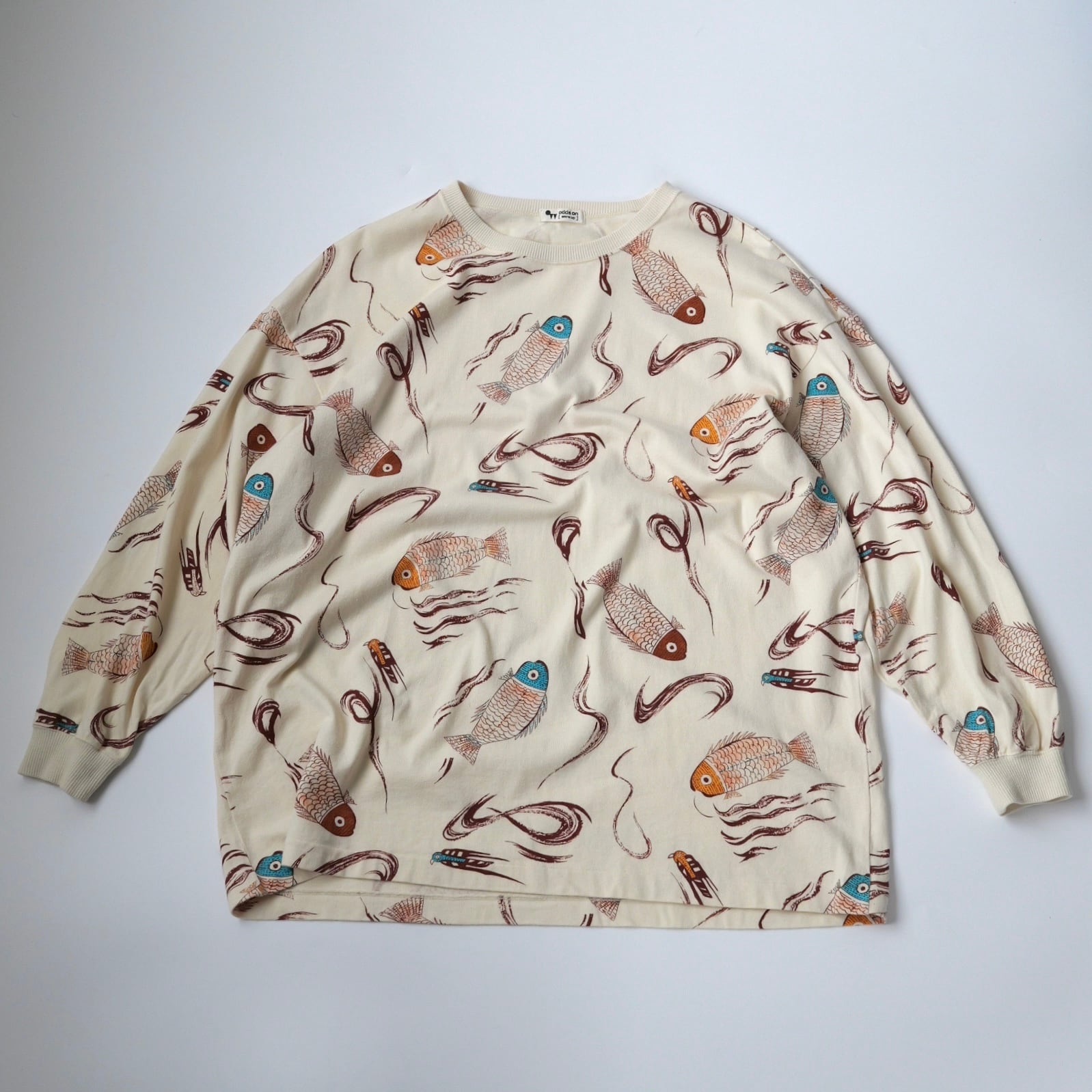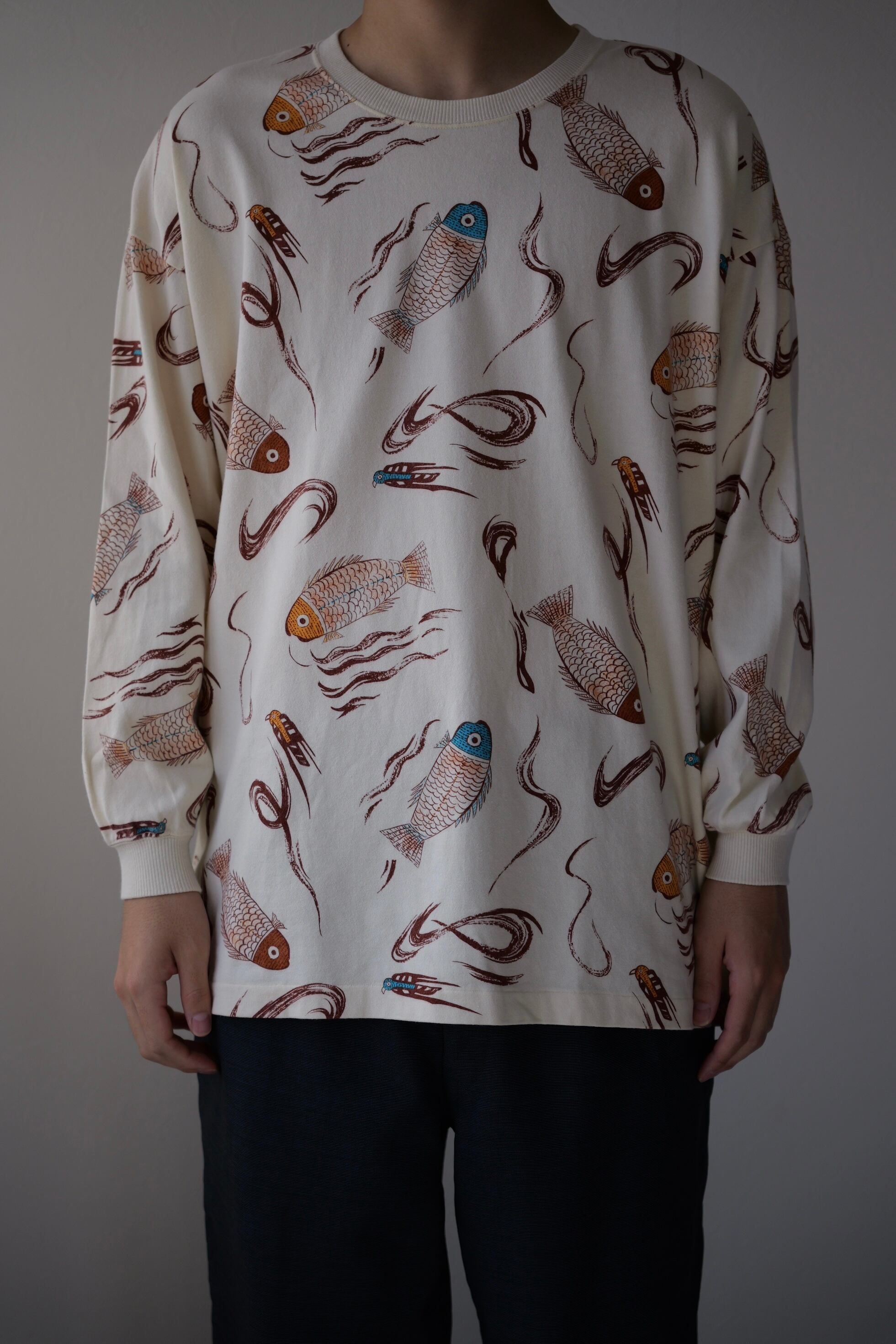 背景は薄いクリーム色、鯉はオレンジと水色の配色