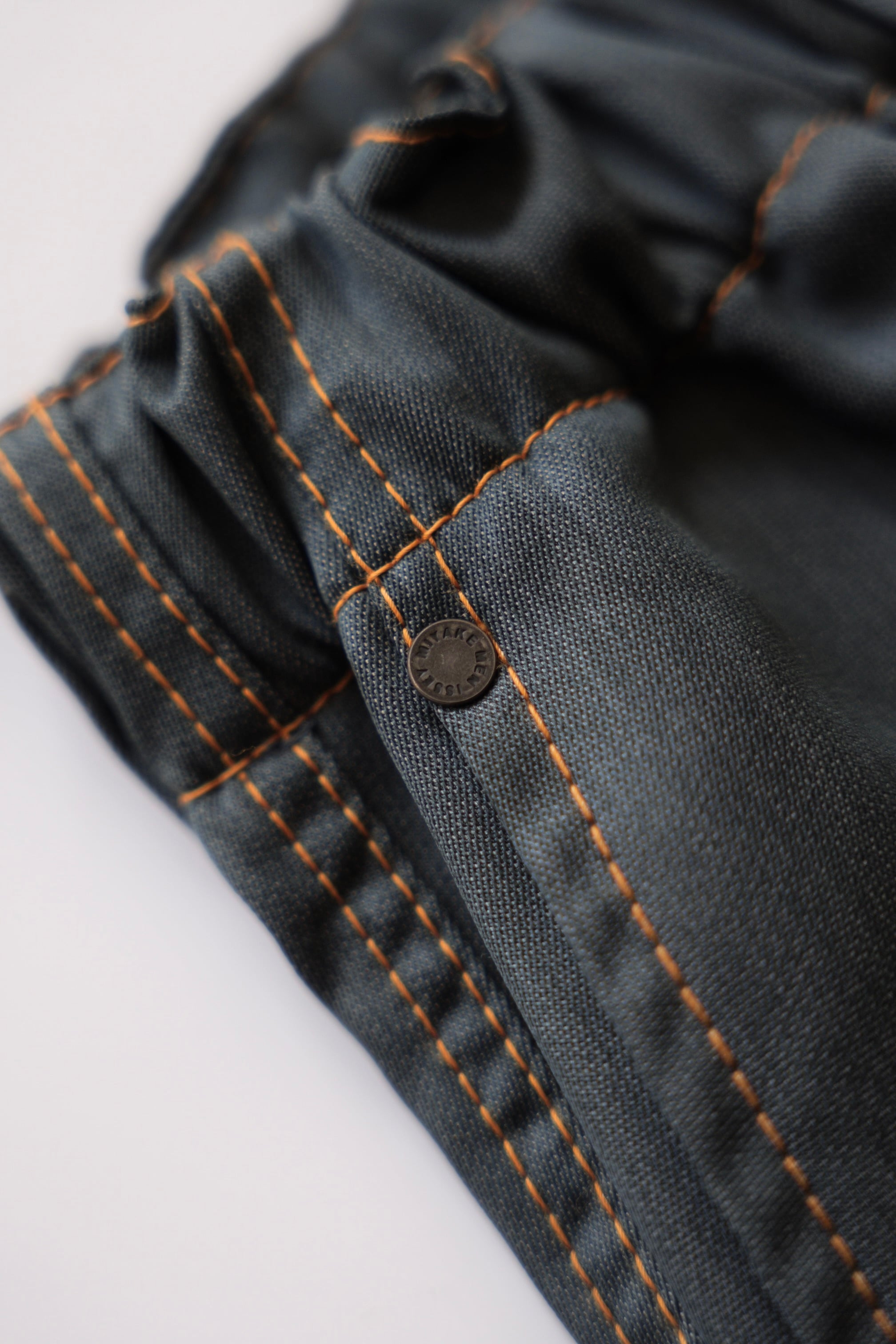濁ったブルーの生地に、ジーンズのようなオレンジステッチ