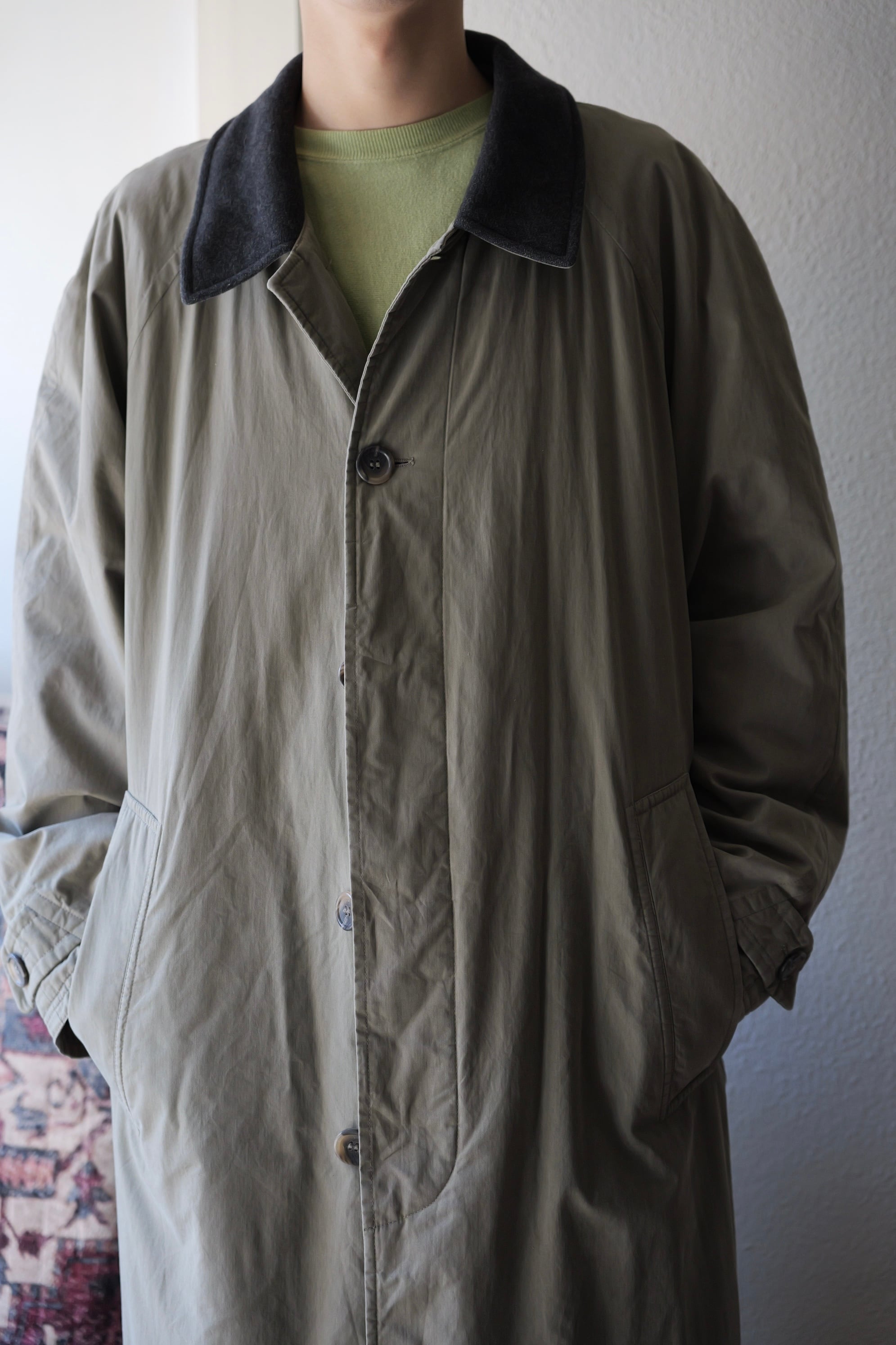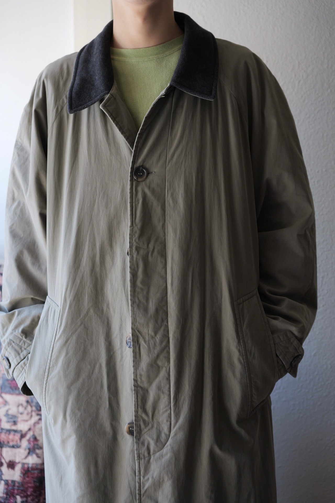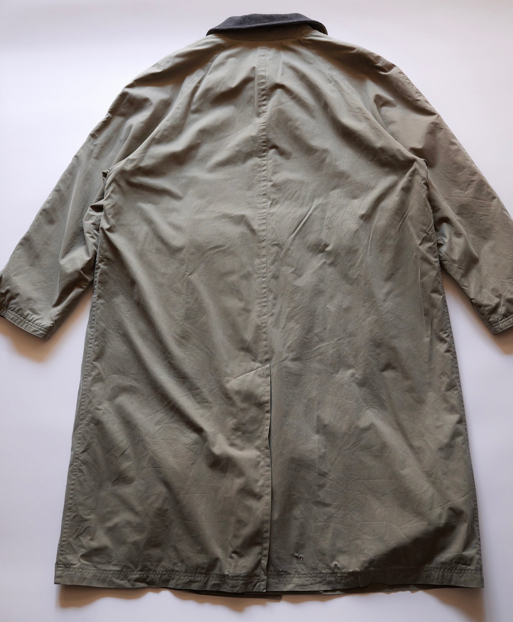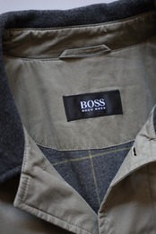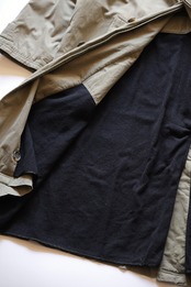 腰より上の位置に中わた、下の位置にフリースの裏地が施されたロングコート
