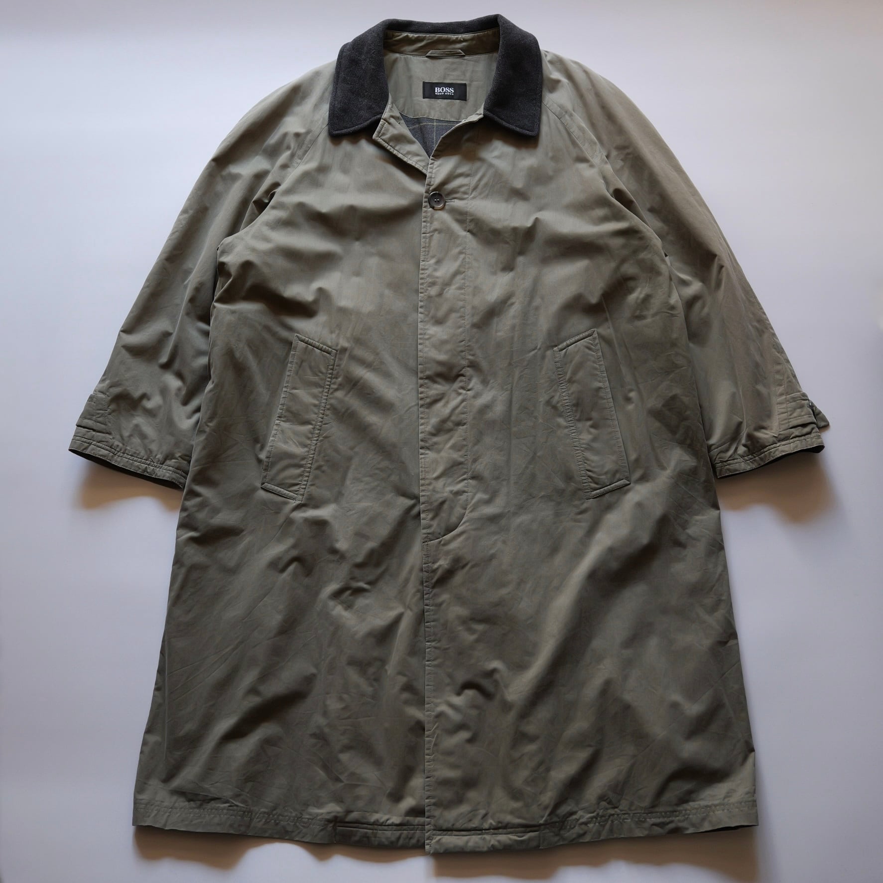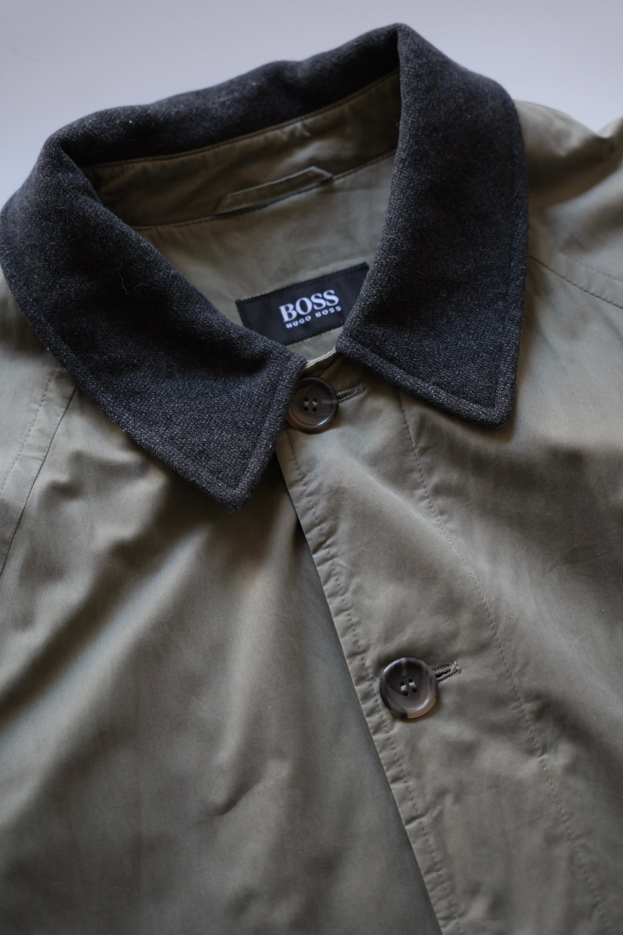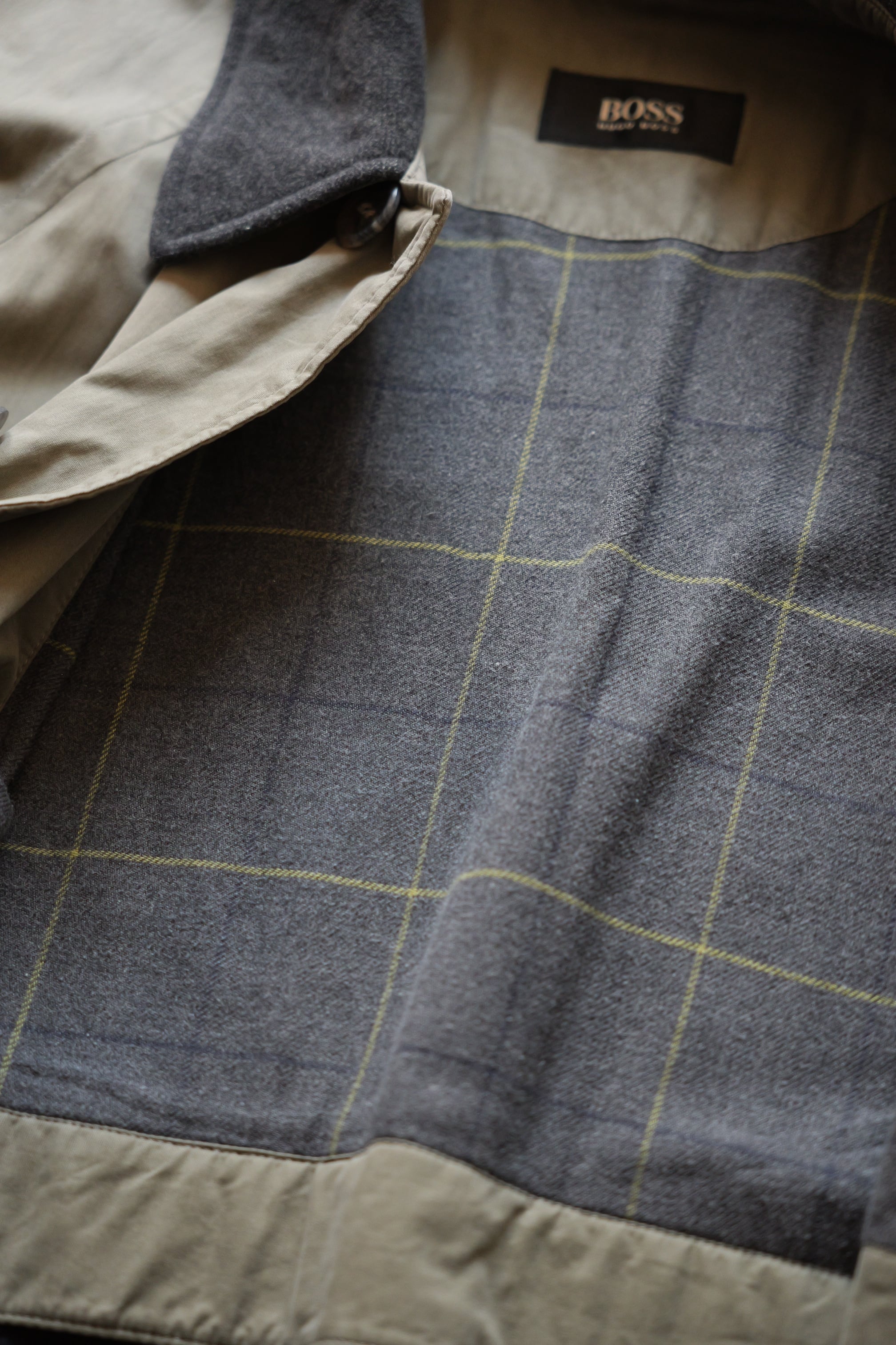 腰より上の位置に中わた、下の位置にフリースの裏地が施されたロングコート