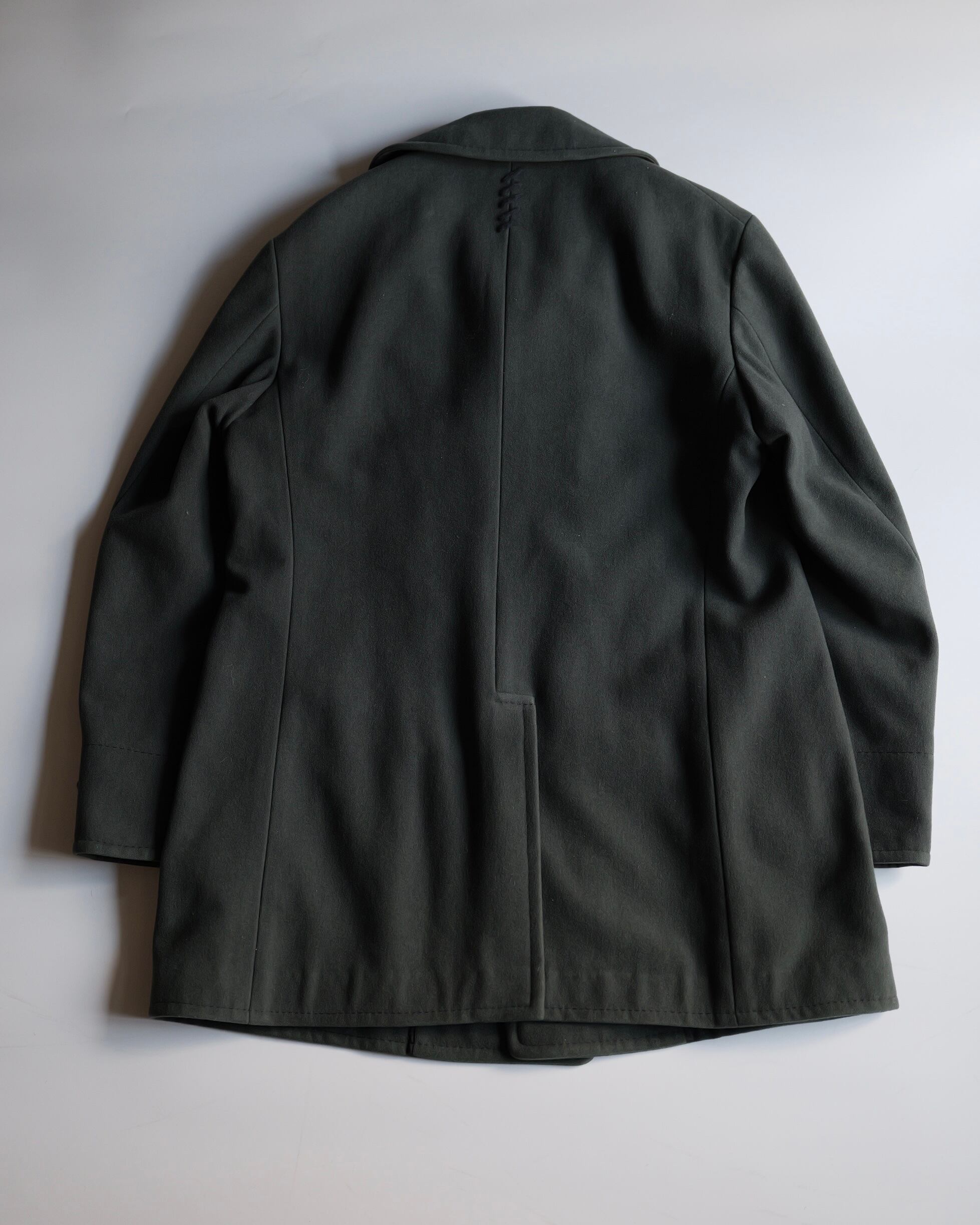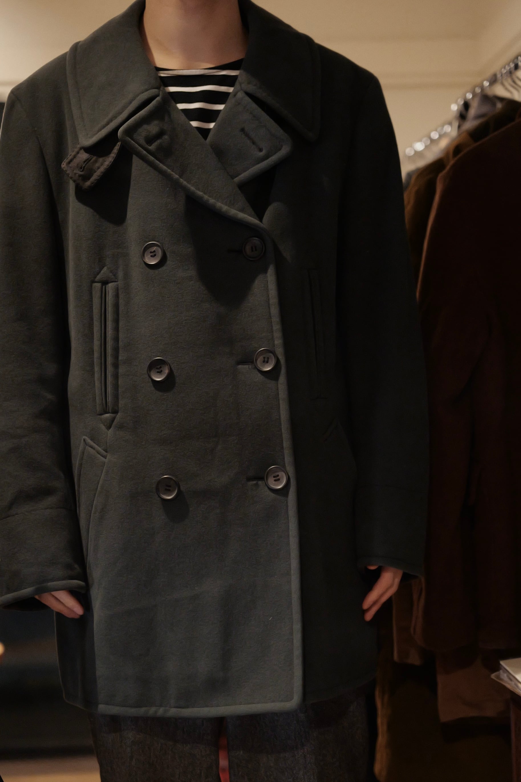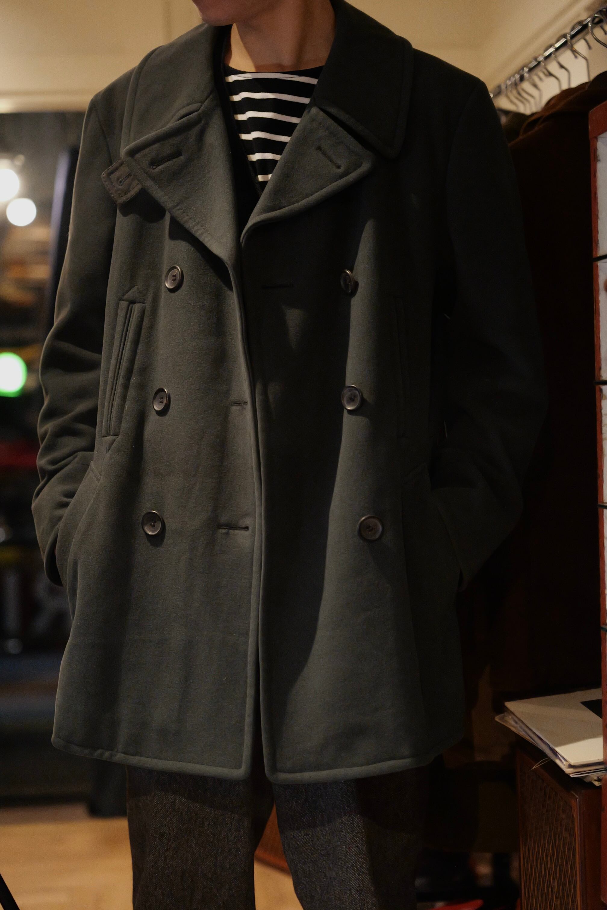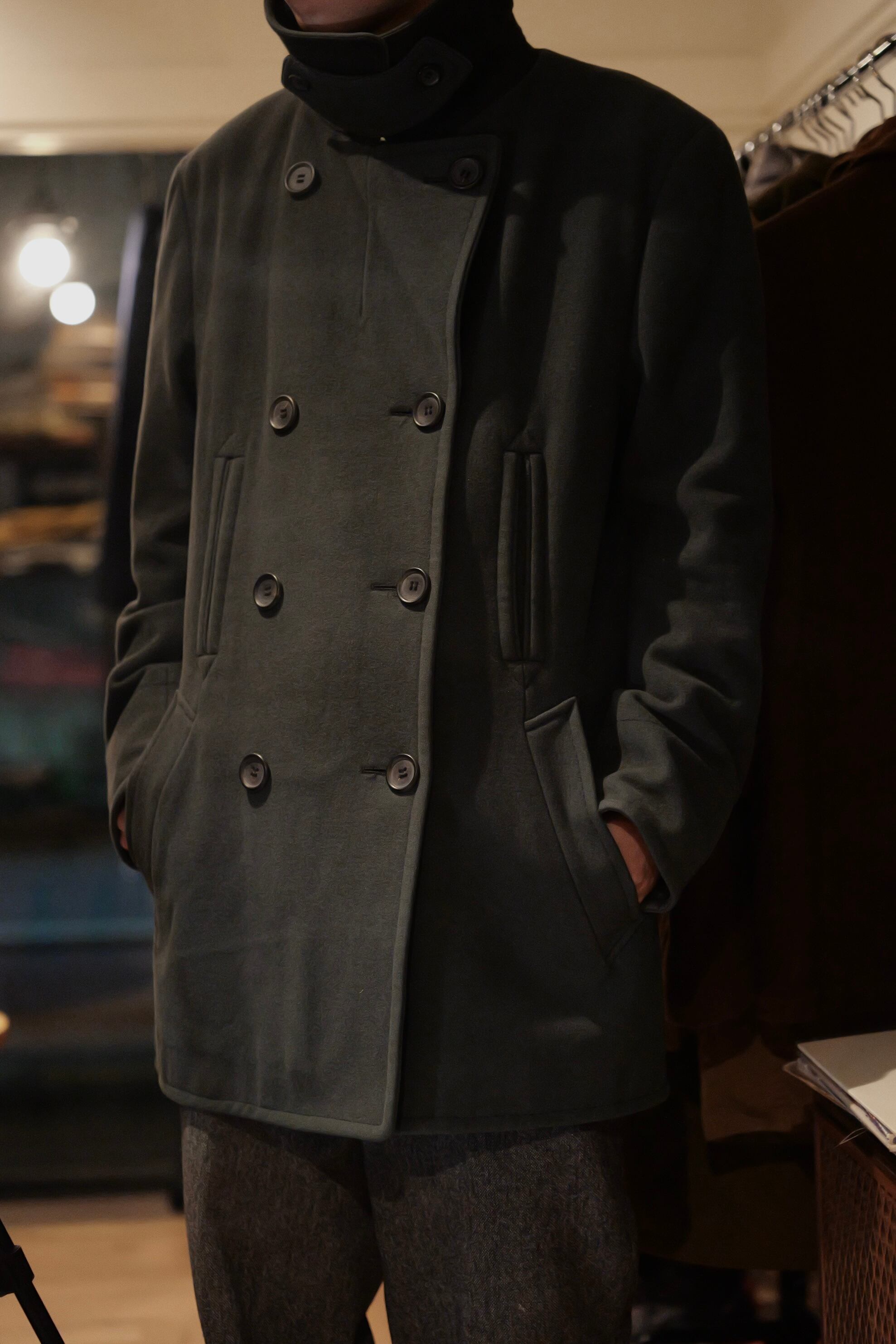 暗いオリーブグリーンのピーコート