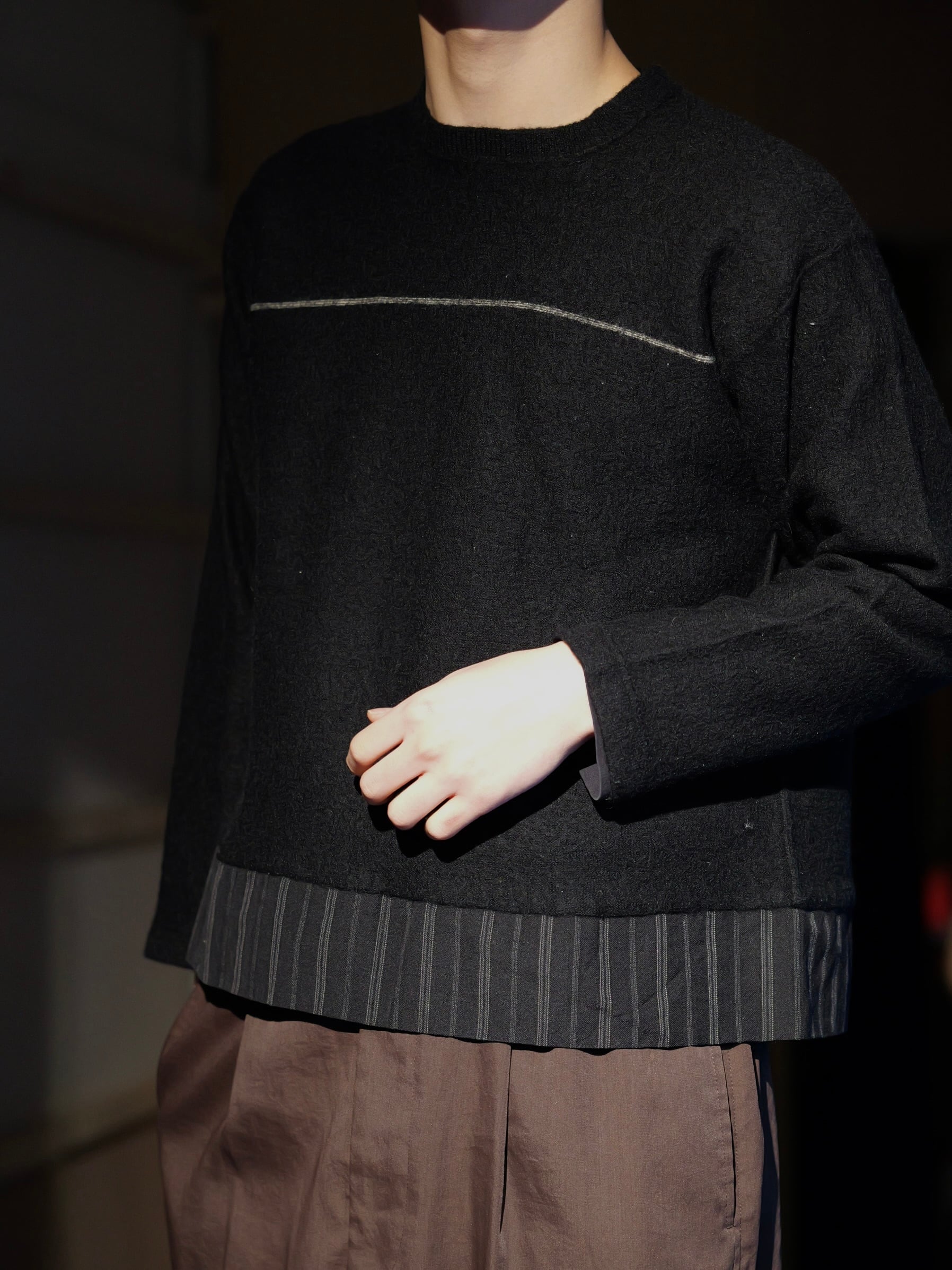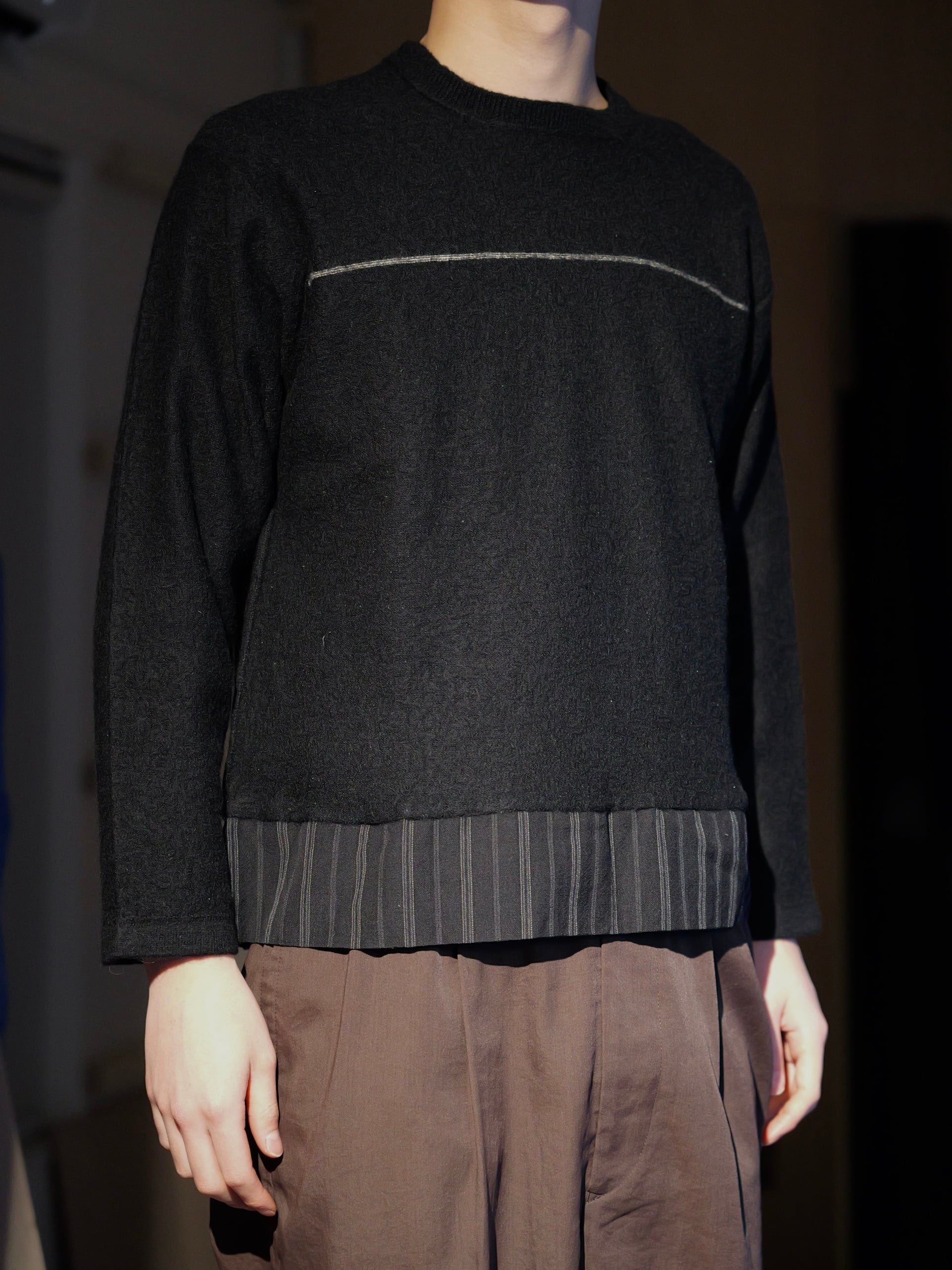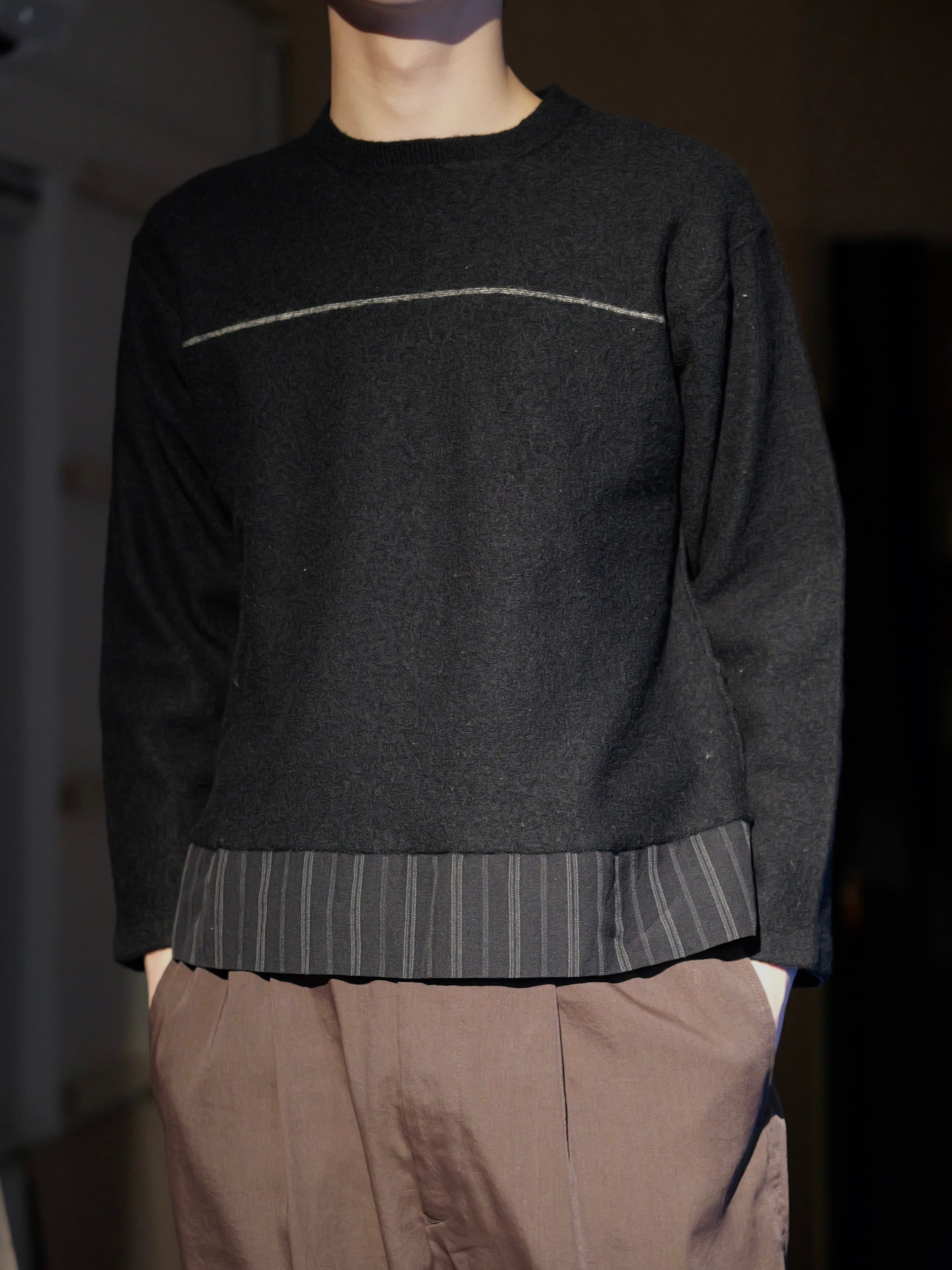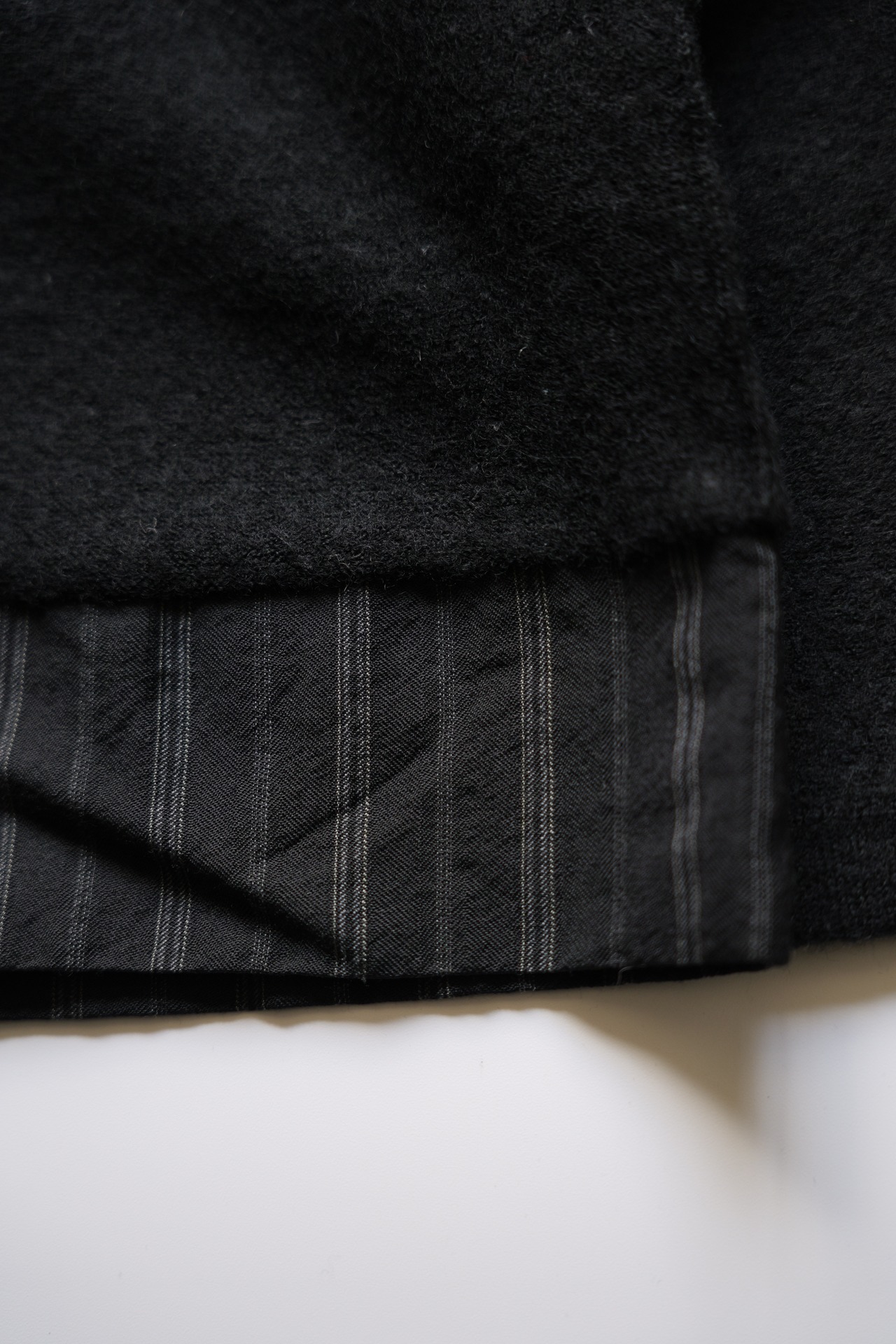 裾でピンストライプのスーツ地に切替