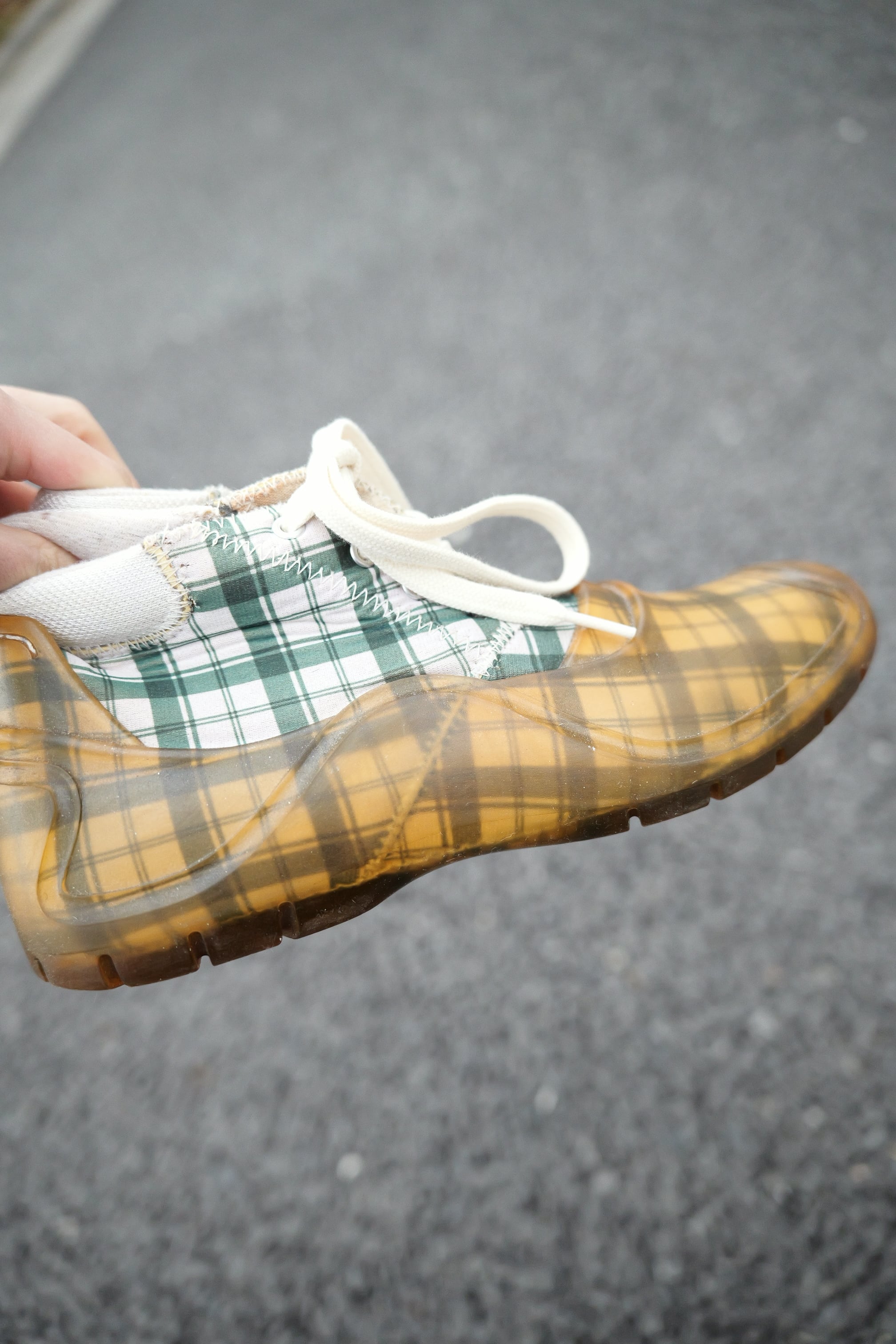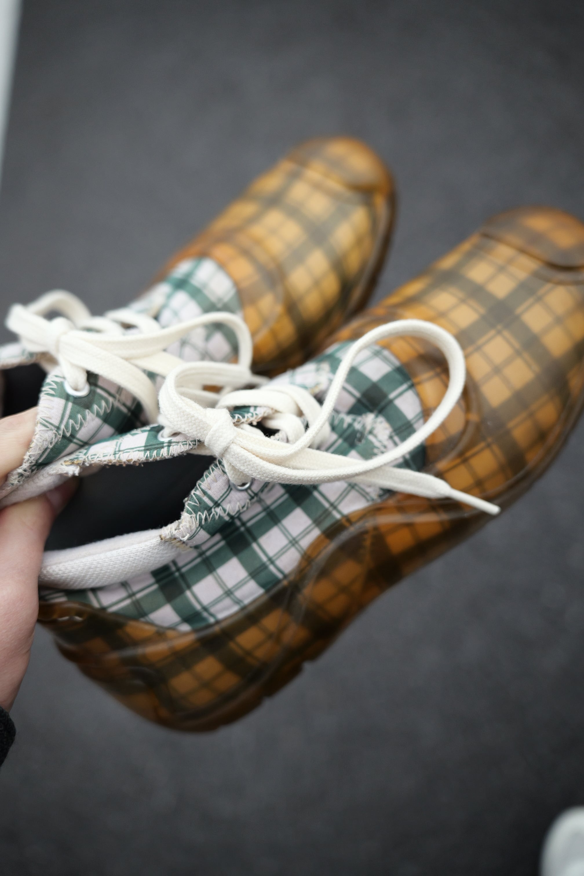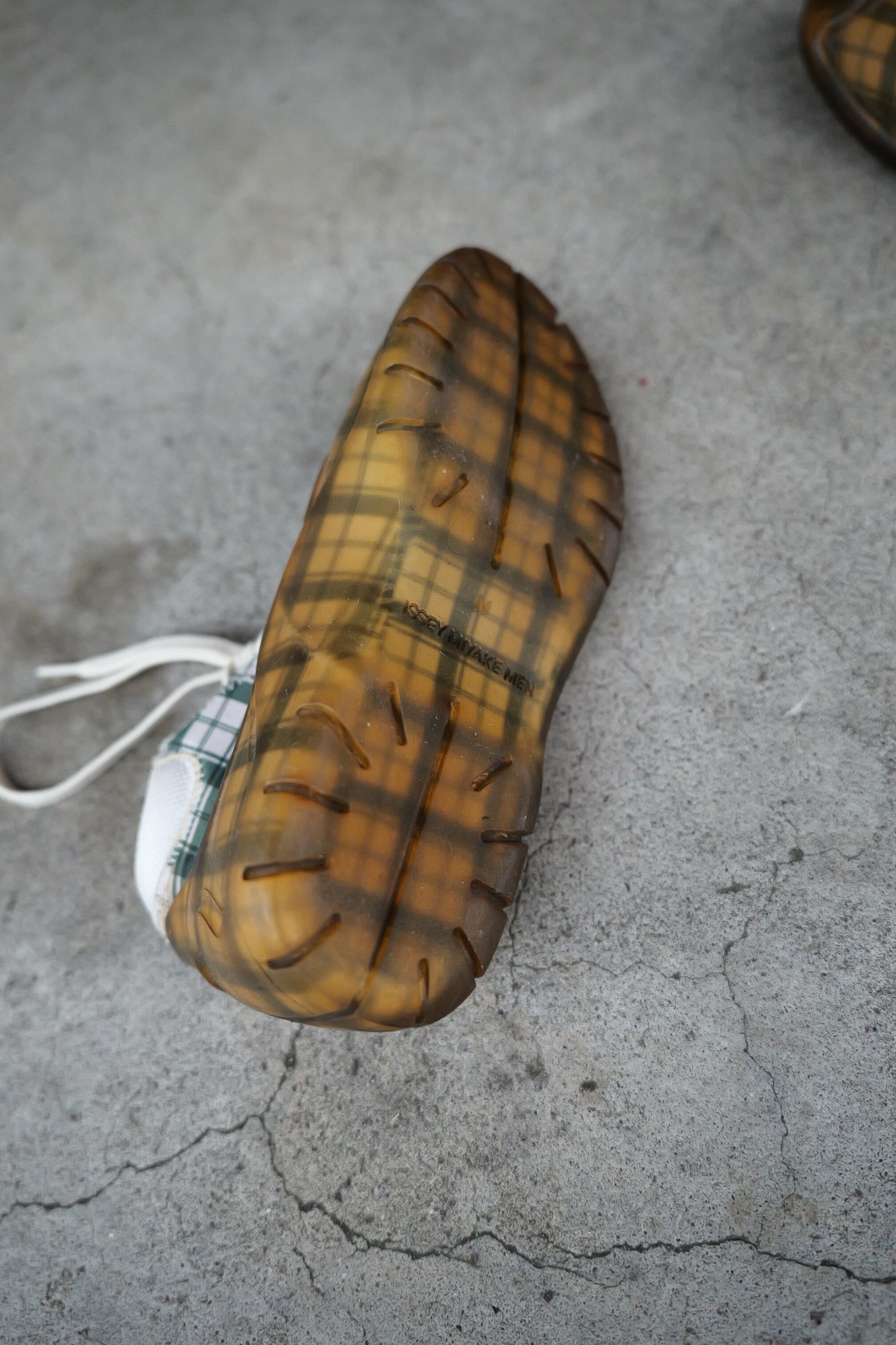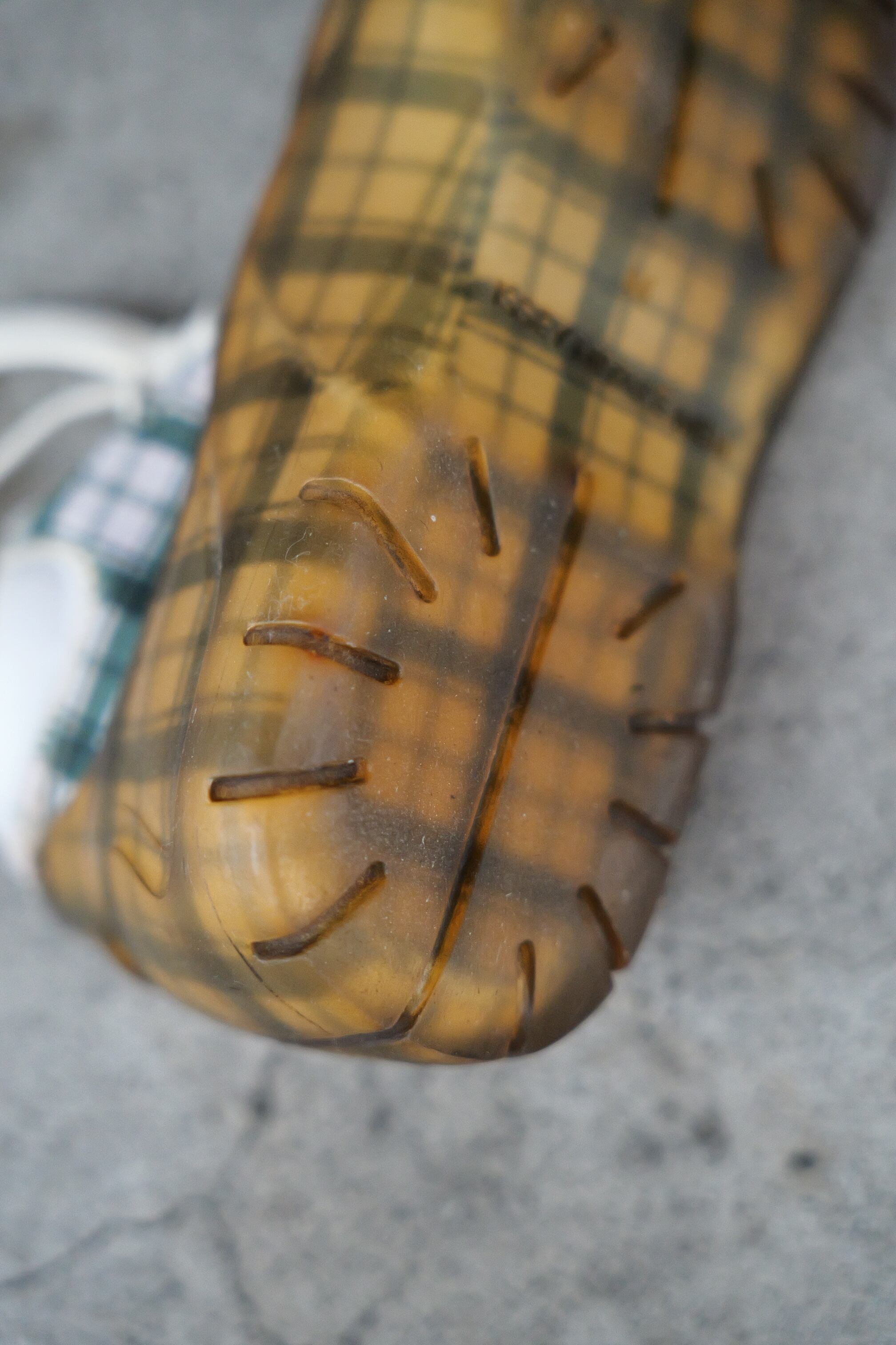 チェック地のアッパーはウェットスーツの生地のような、もちっとしたウレタンのような素材