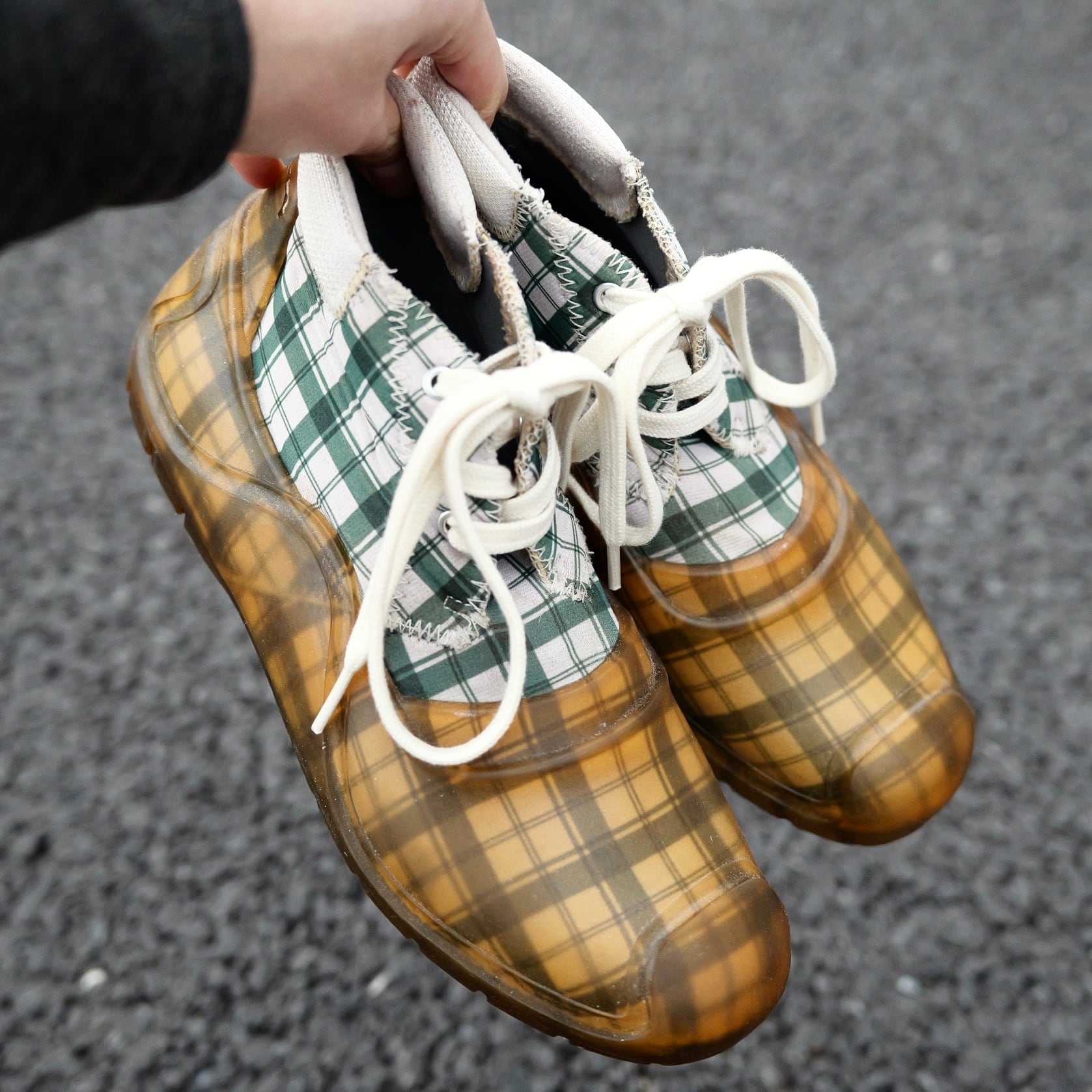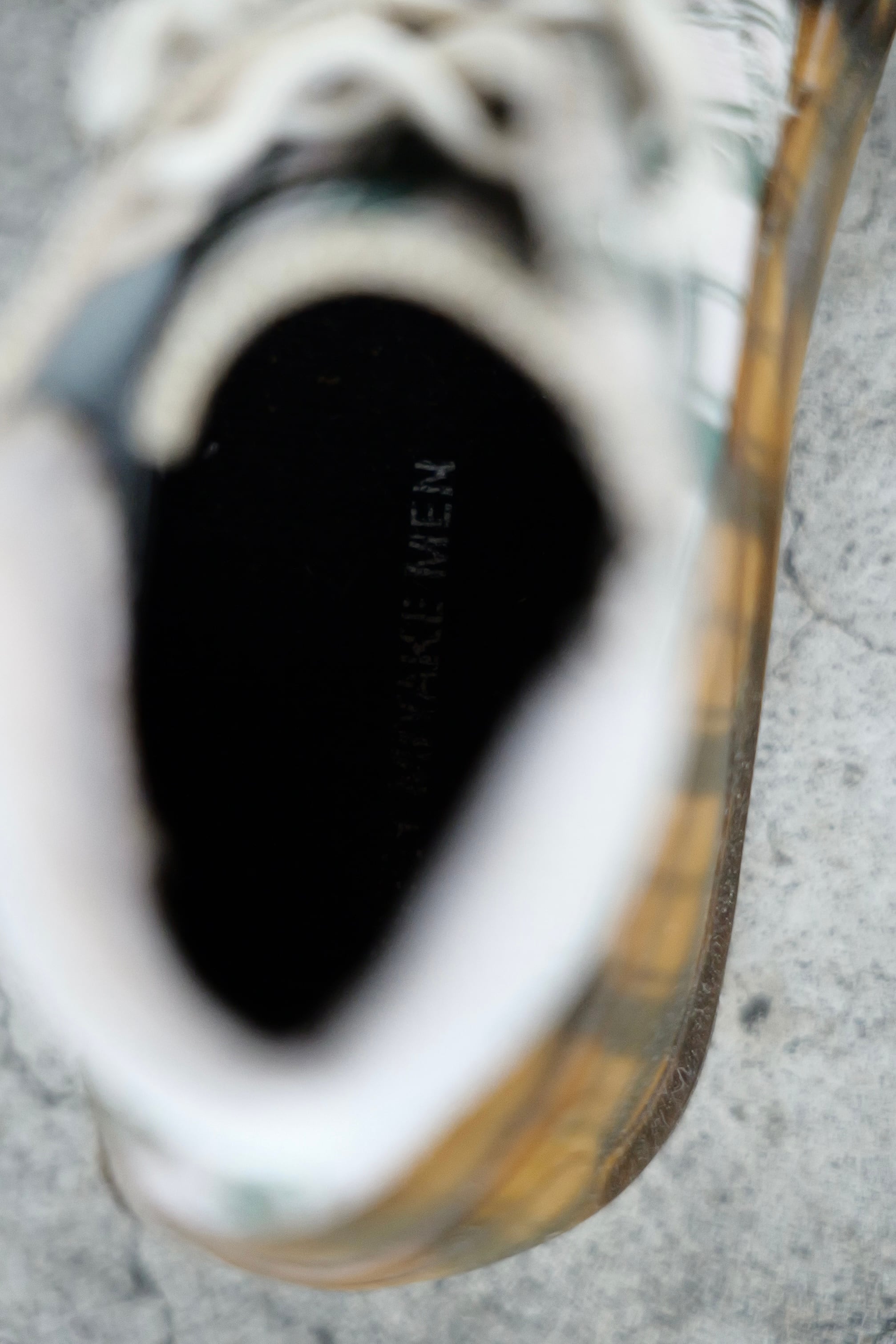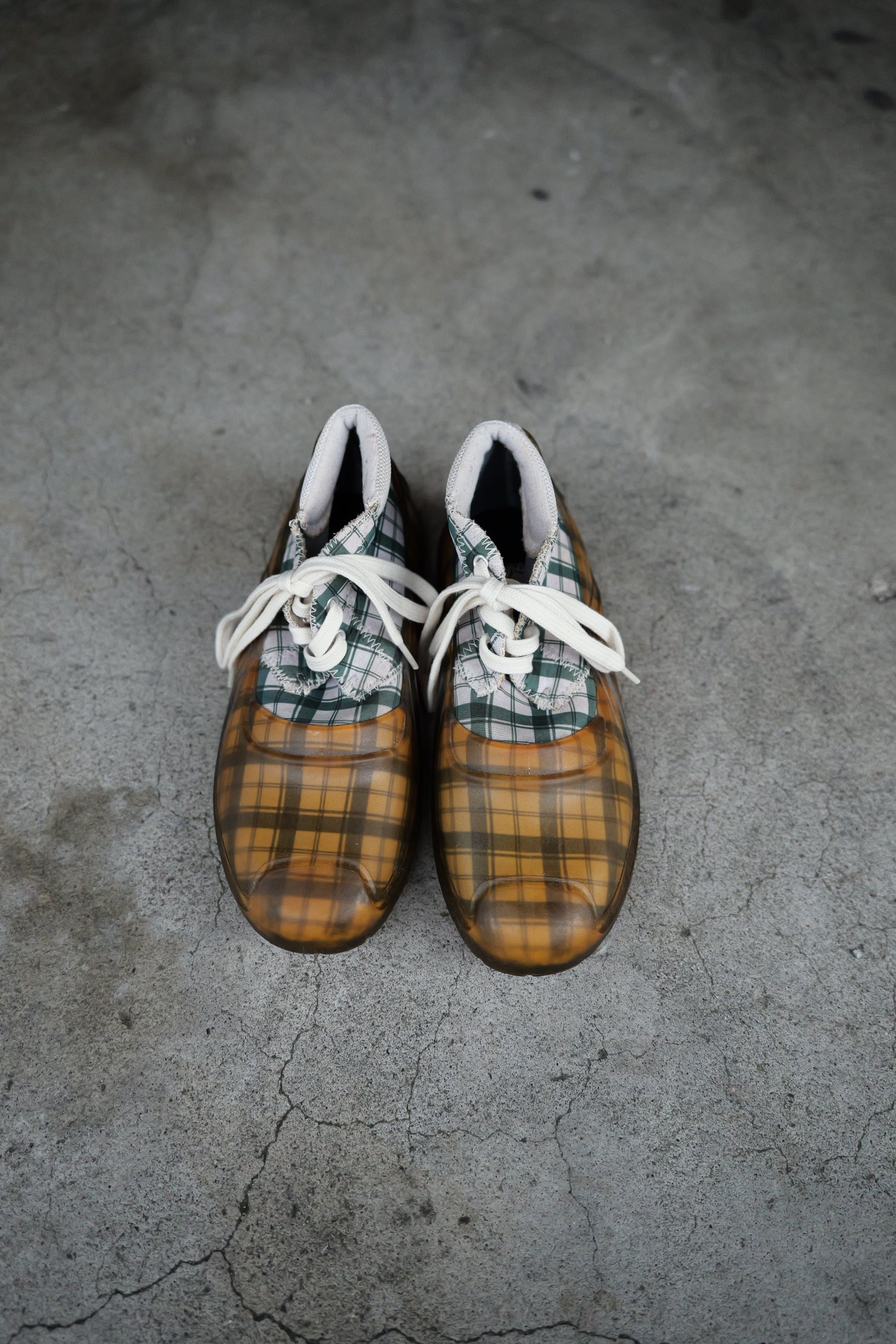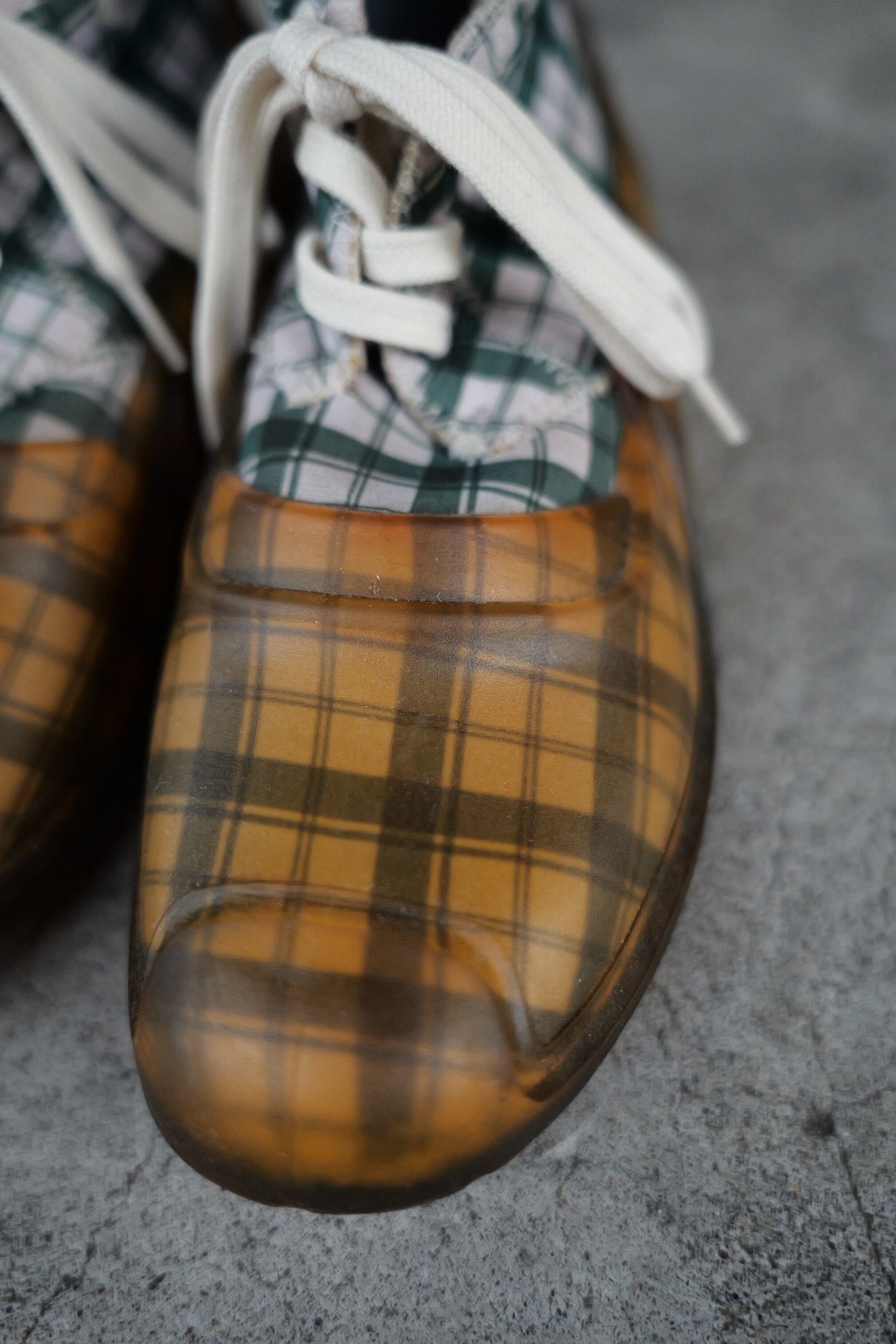 チェック地のアッパーはウェットスーツの生地のような、もちっとしたウレタンのような素材