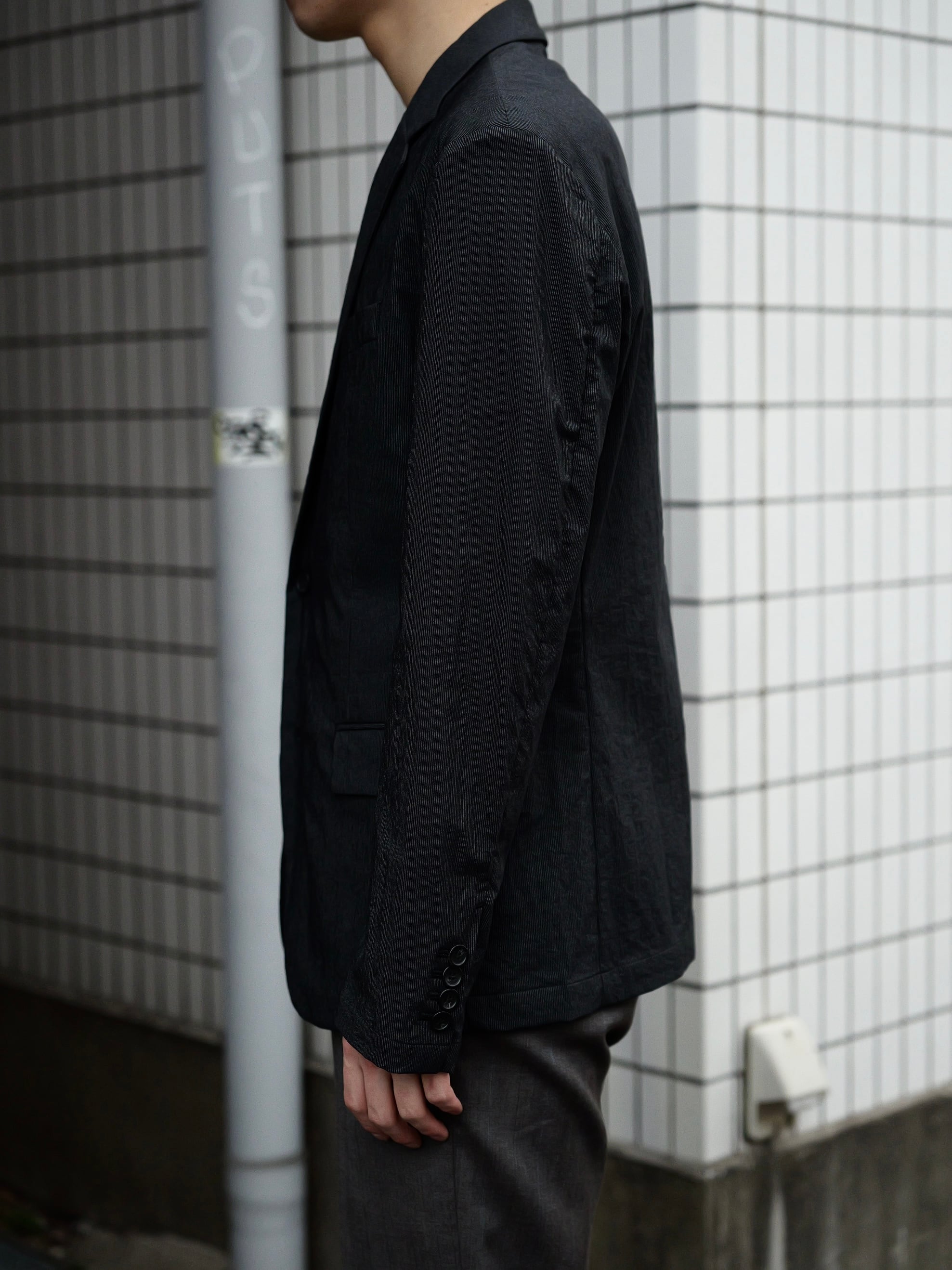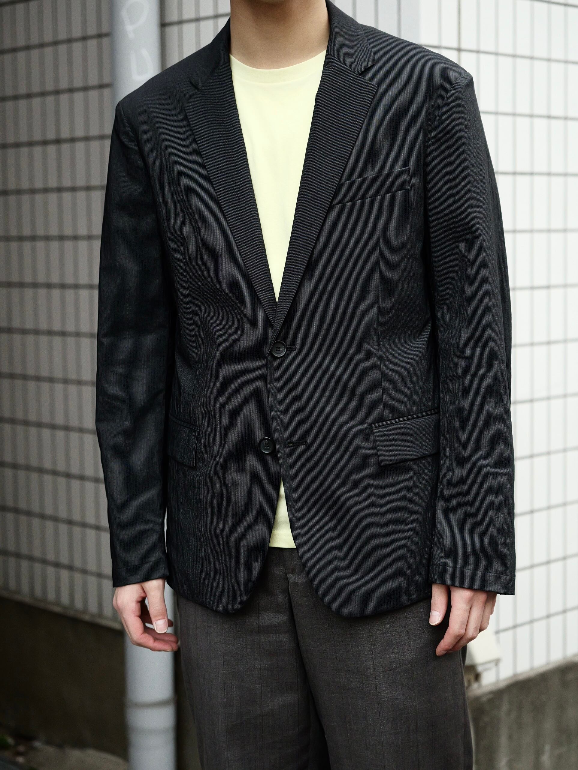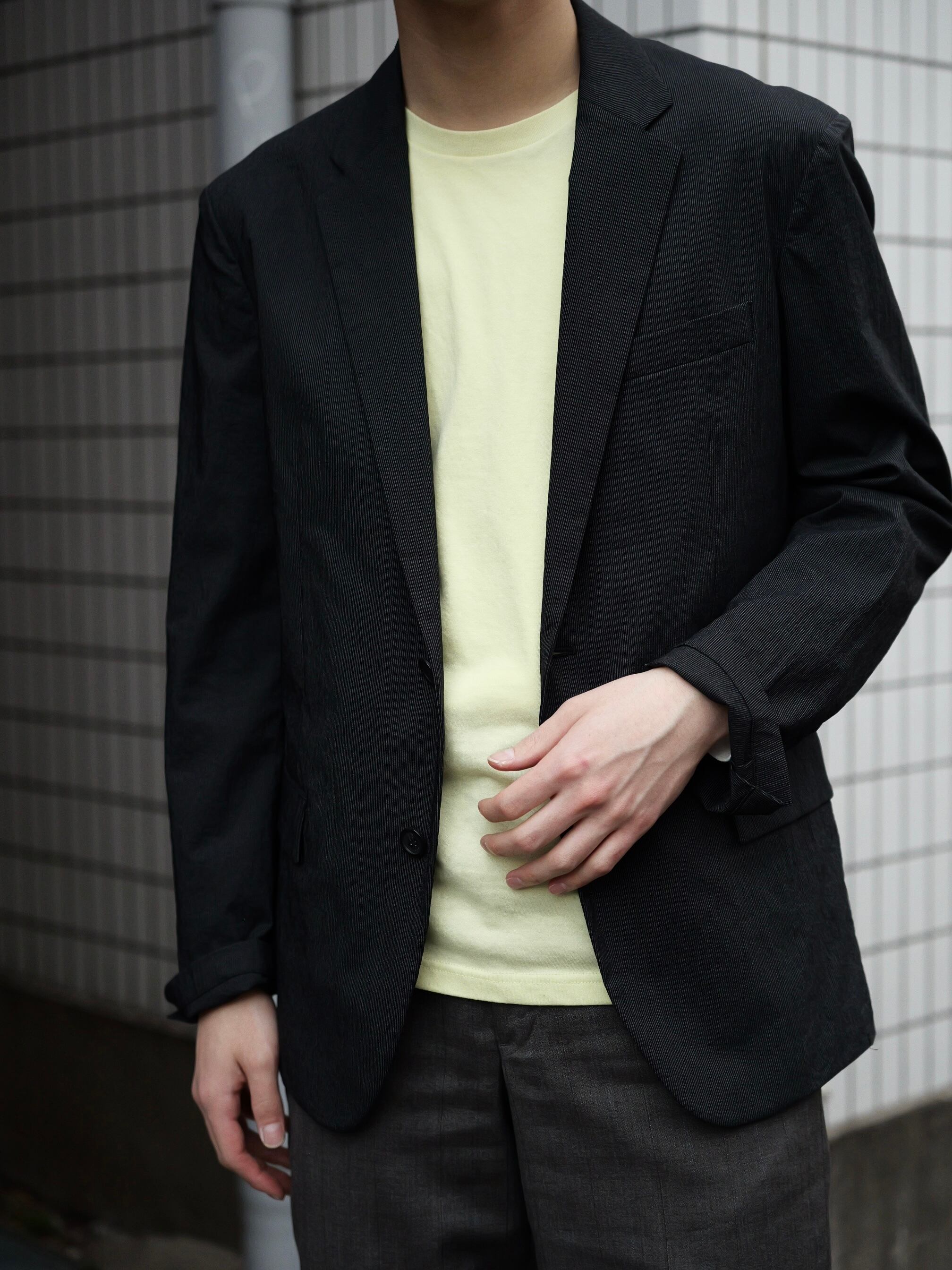 ジャストめなシルエットながら、生地感によって程よく力の抜けた印象に仕上がっています
