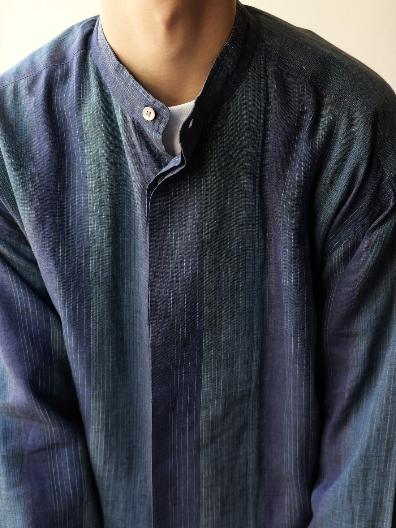 淡くトーンの異なる2色のブルーで構成された大判のストライプに、その上から繊細なホワイトのピンストライプを重ねたテキスタイル