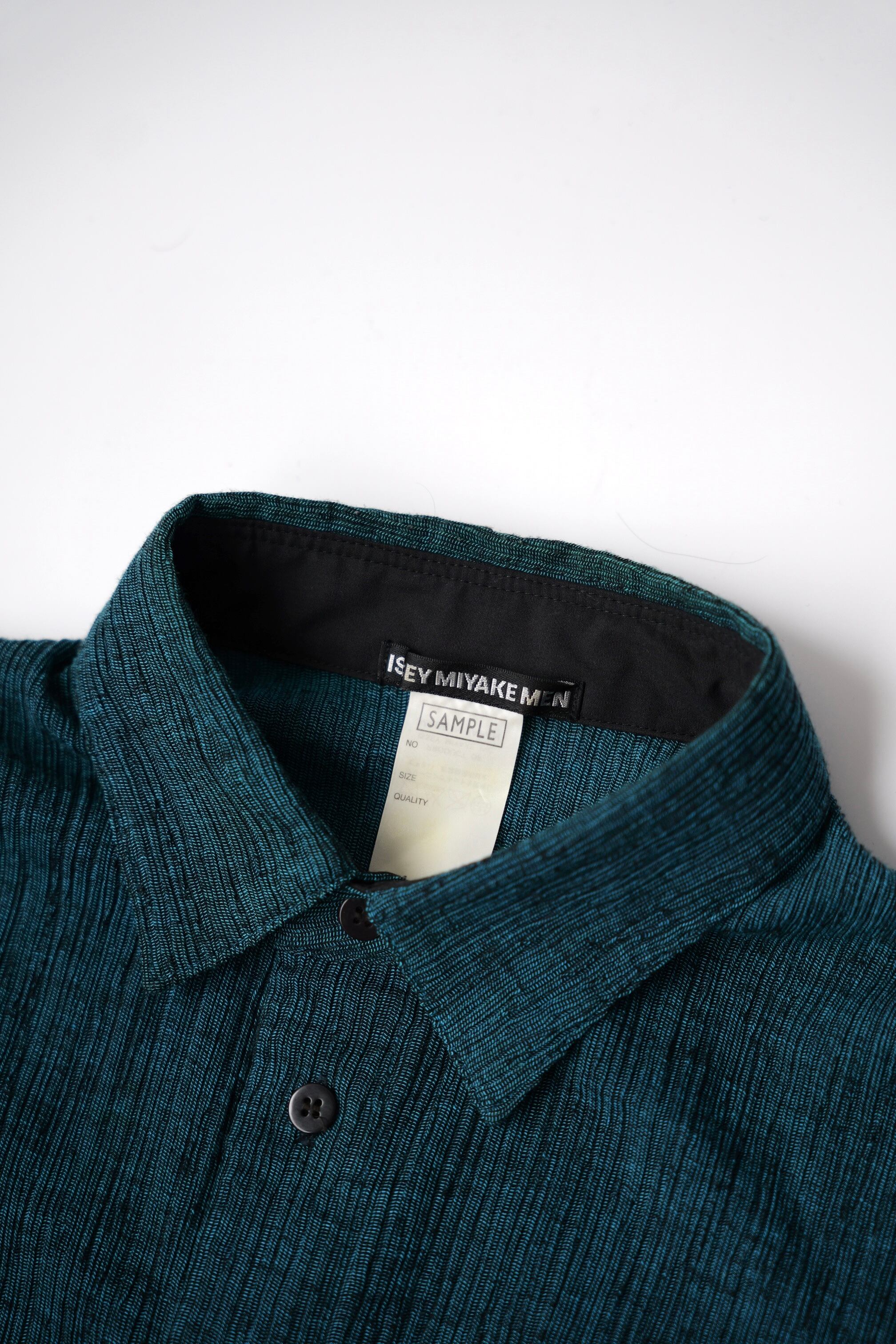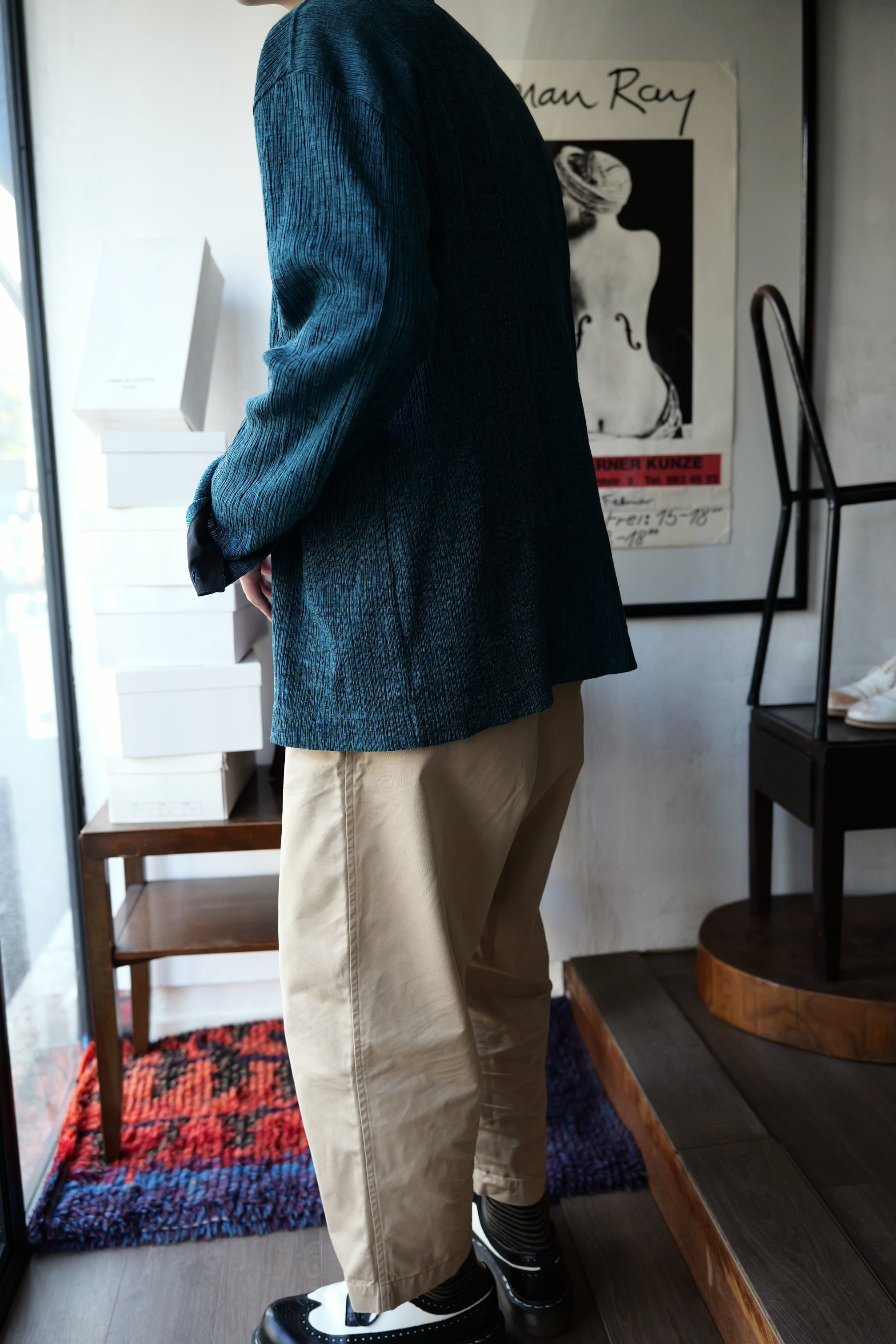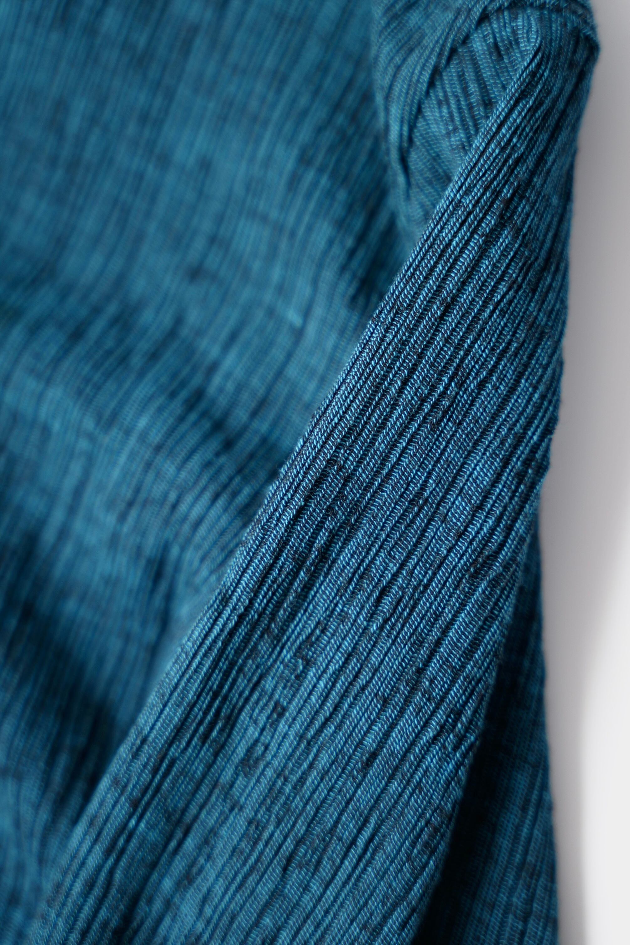 エメラルドブルーを基調に、地にはブラックの糸が走る奥行きのある見え方をします