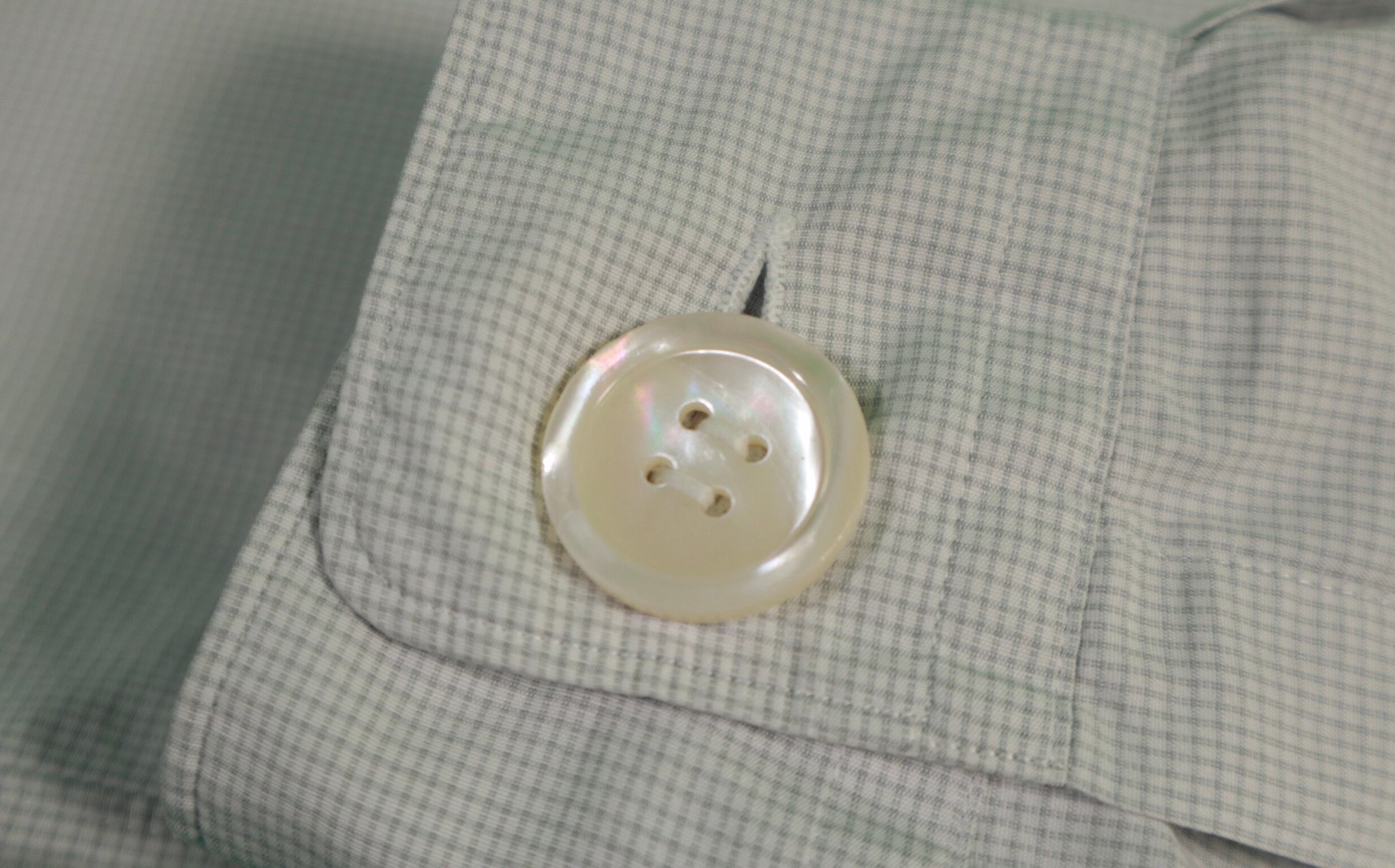 1番下のボタンから上に向かって段々ボタンが大きくなっていく「グラデーションボタン」の開襟シャツ。
