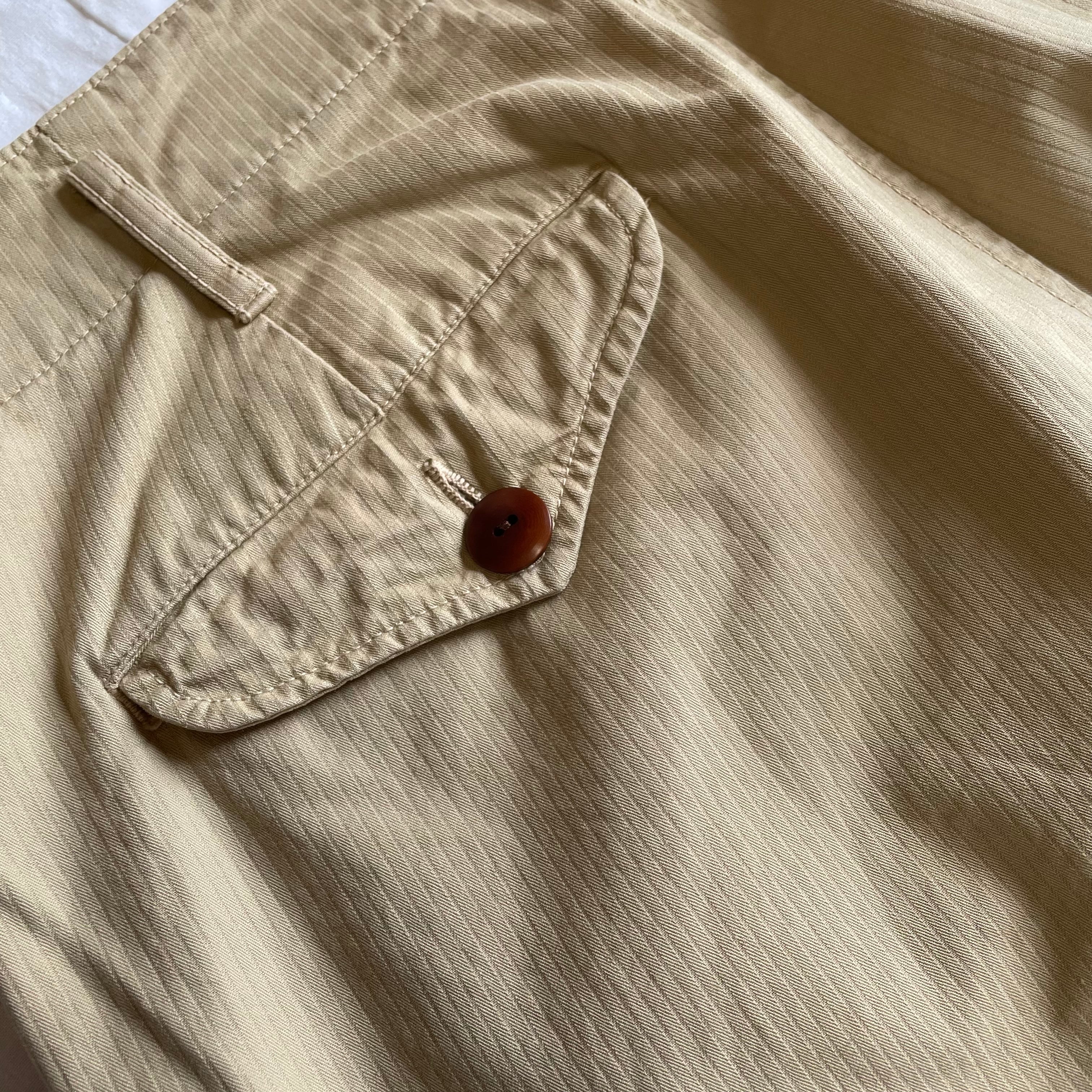 張り感のあるクリーンなベージュチノを、コーデュロイの様な畝とブラウンのボタンでミリタリーに落とし込んだアイテム