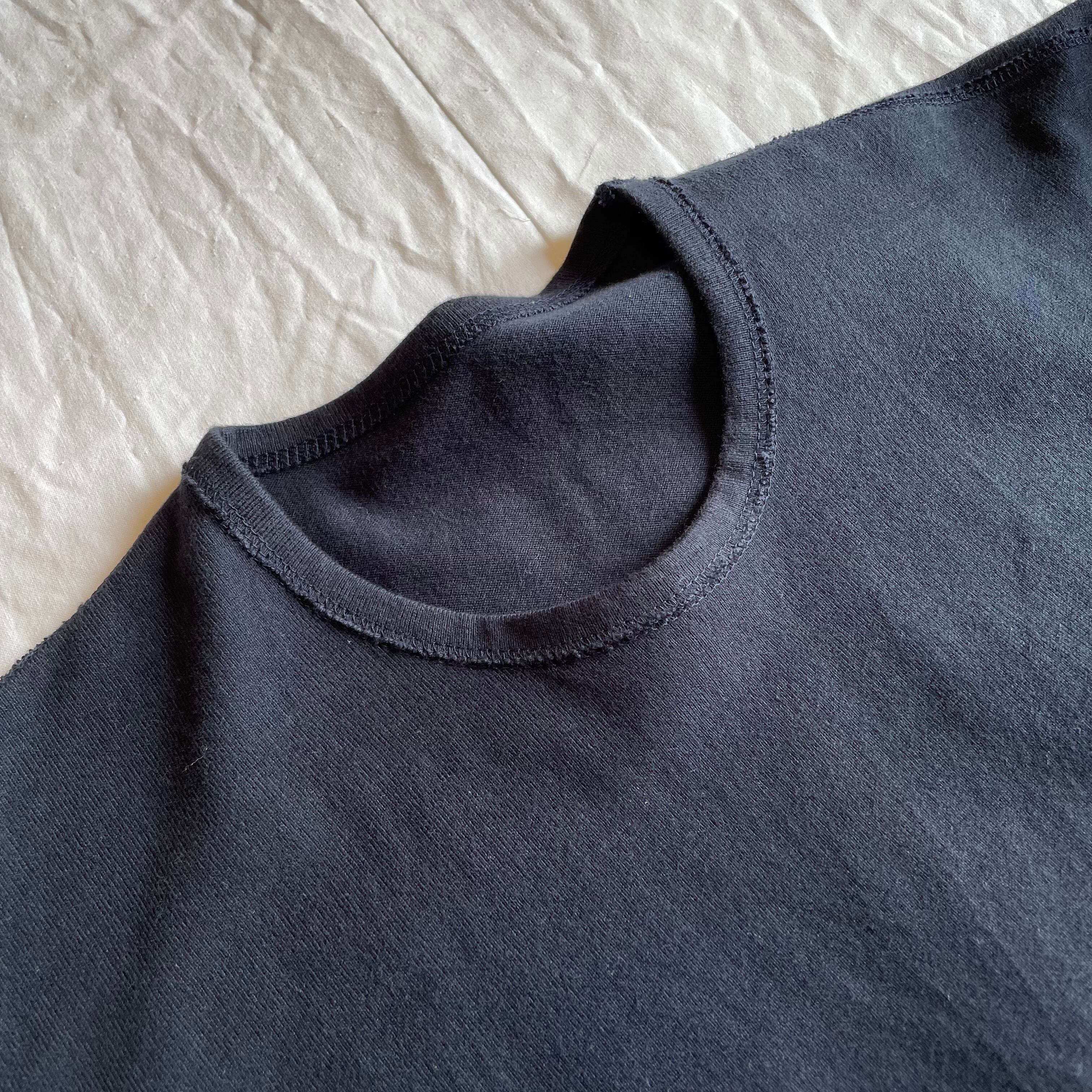 ネック、裾などのシームが裏返しになってるようなデザイン