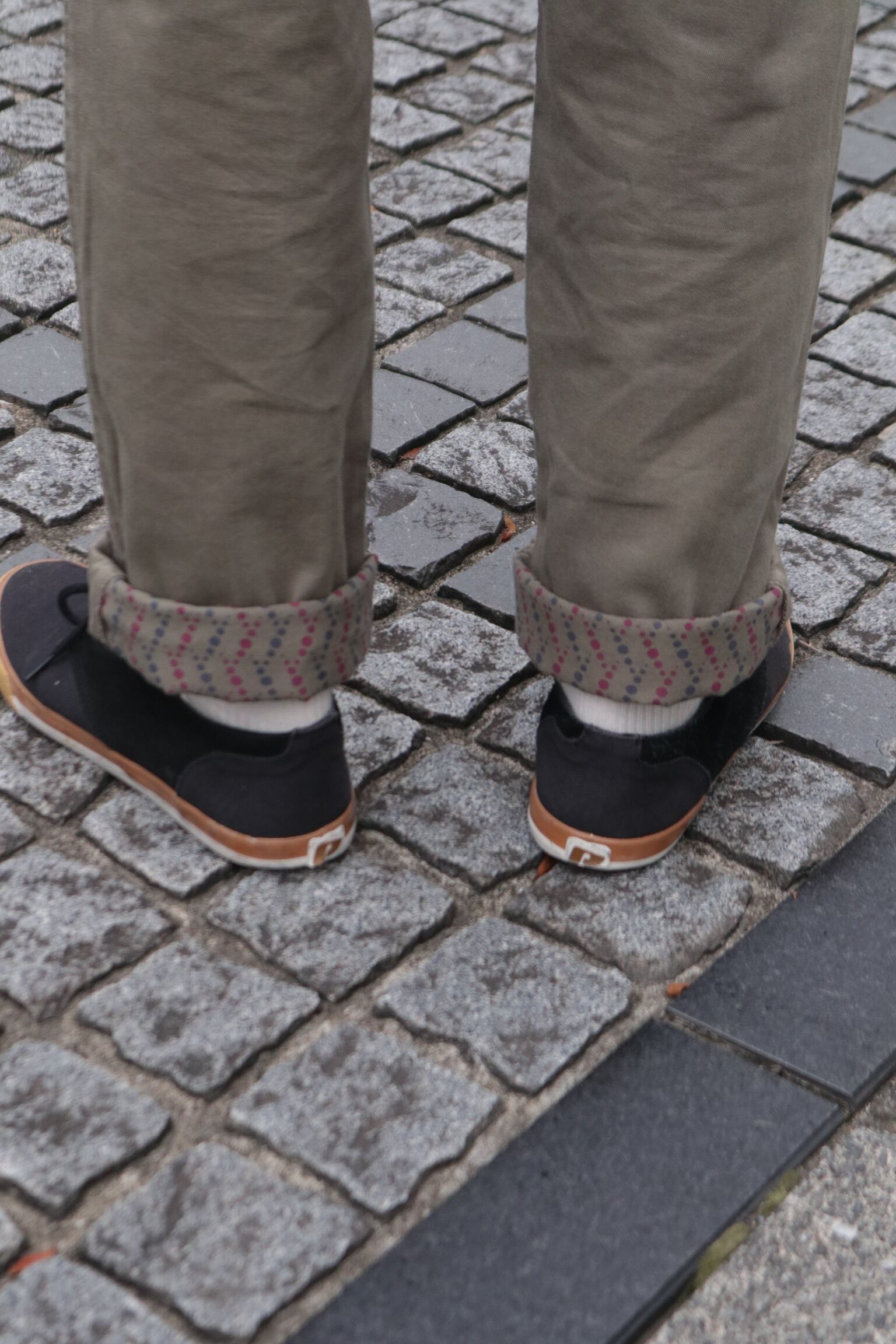 フロントの表地と、バックの裏地(ふくらはぎが当たってる所)の生地が幾何学柄で、ロールアップすると見える感じも可愛いです