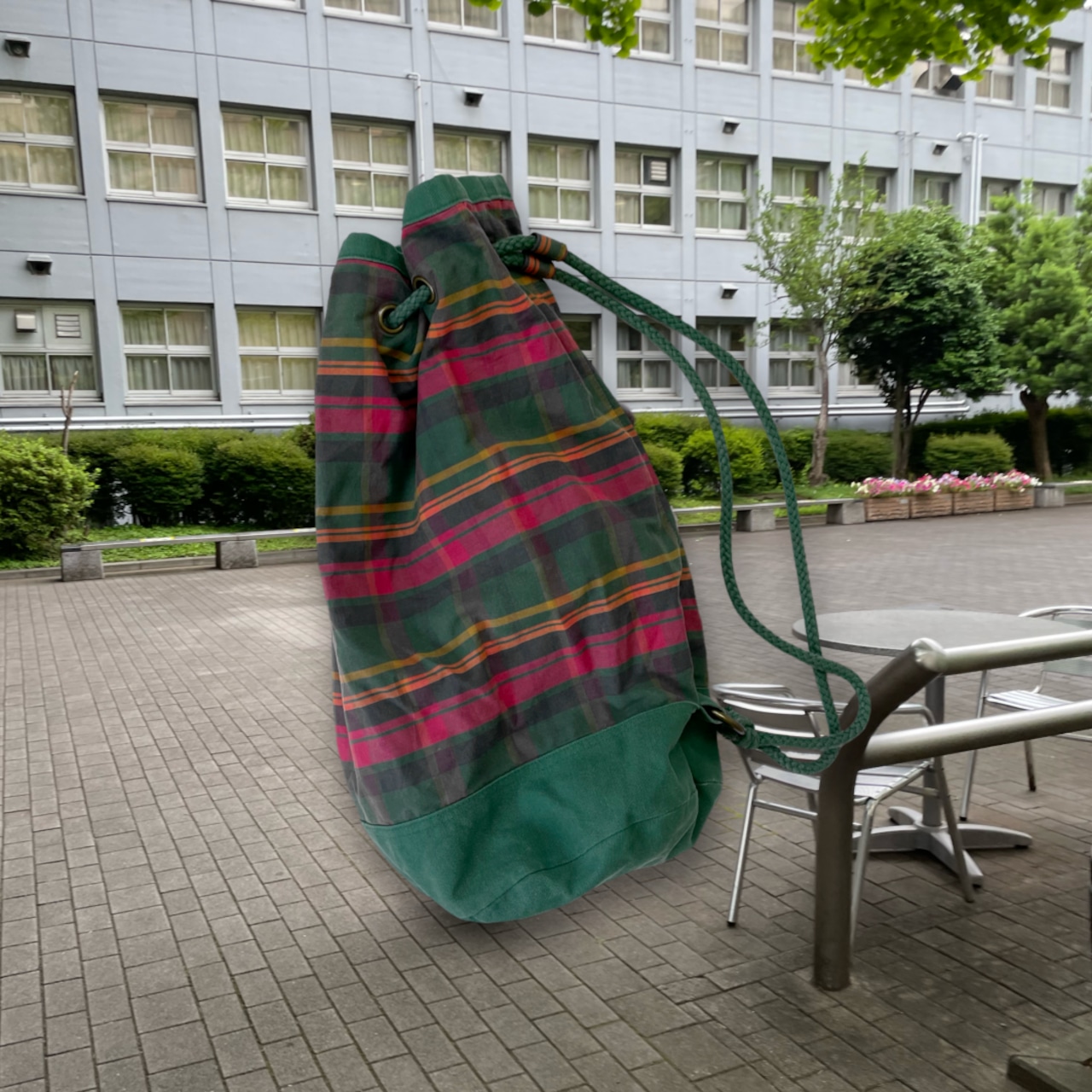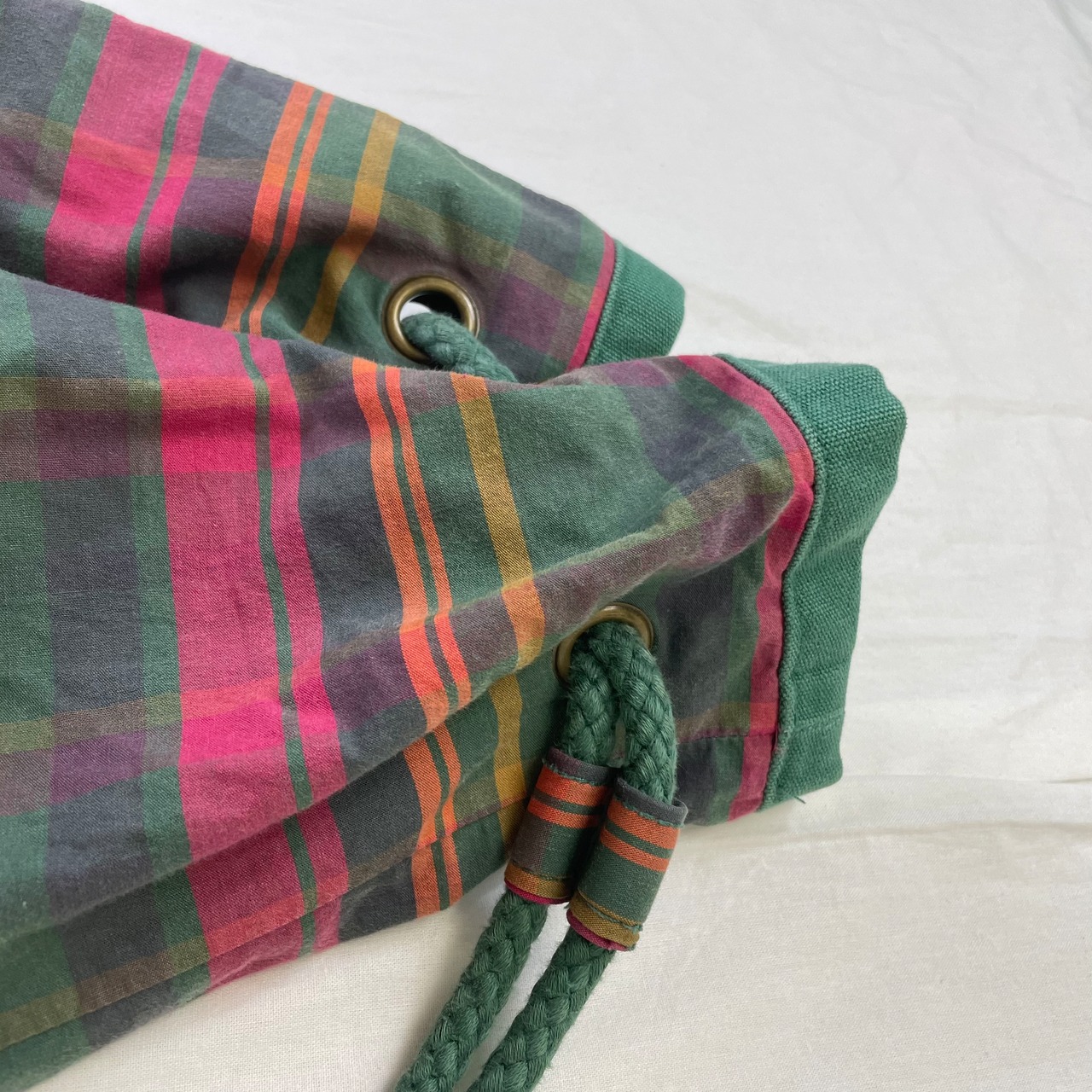 緑地に赤っぽいピンクとオレンジとイエローのチェック