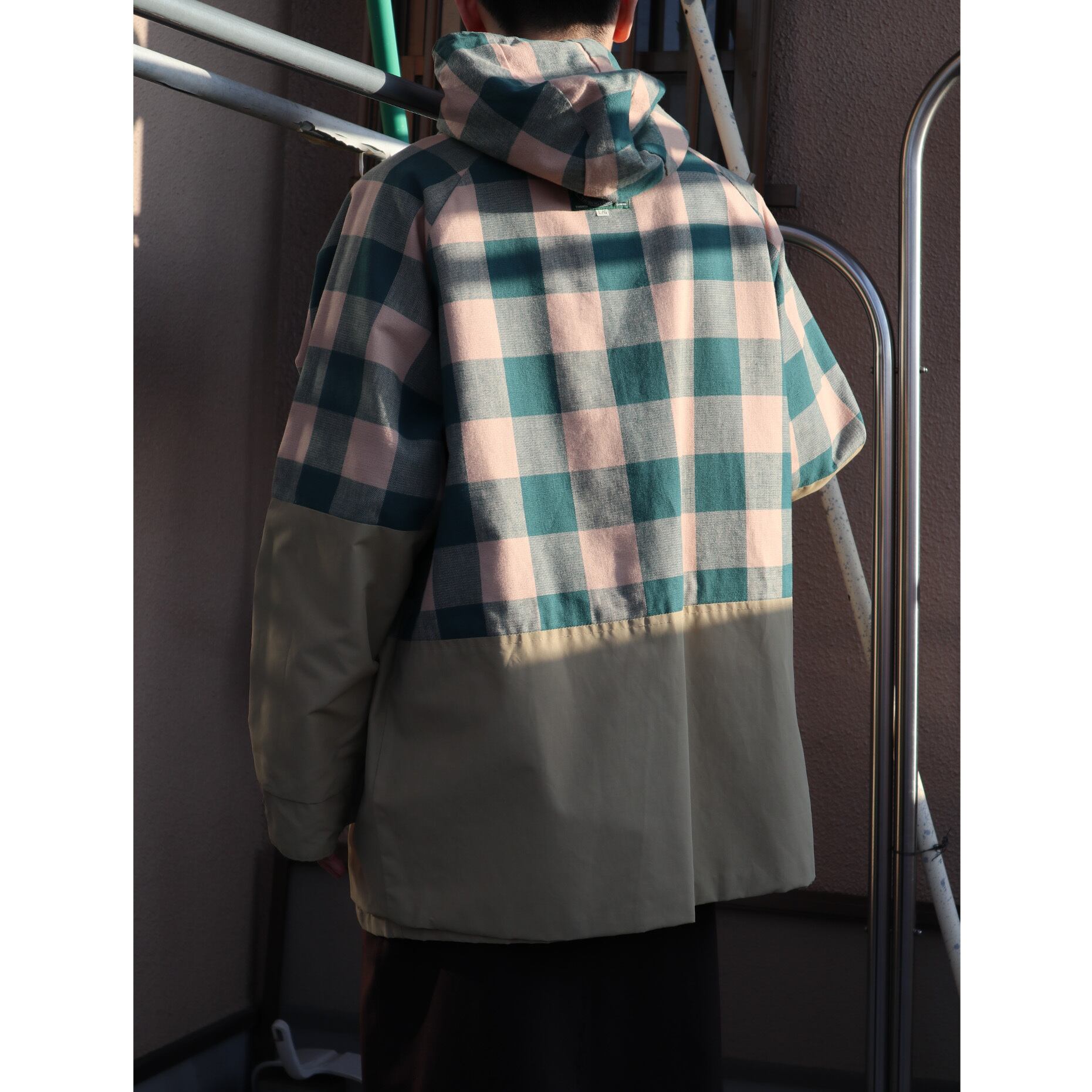 ピンクがかったベージュと緑のチェックが、表で着ても裏で着てもカワイイ