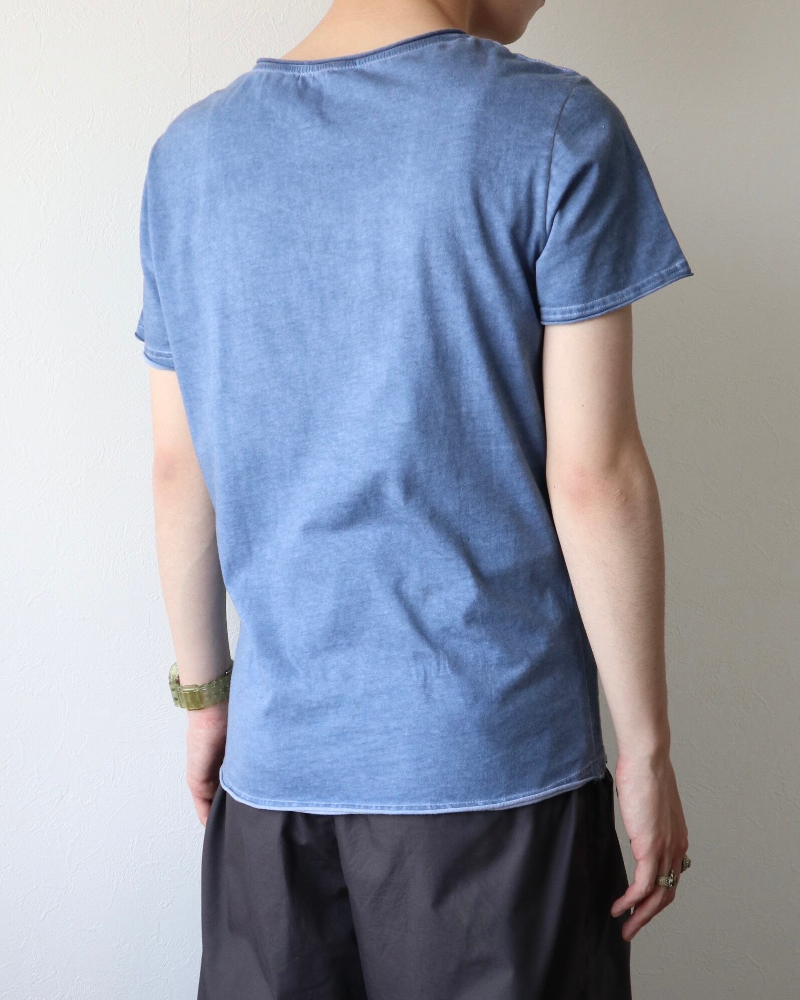 切りっぱなしのディテールで、襟と袖はロールしていて裾はカットオフのフリンジのようになっています