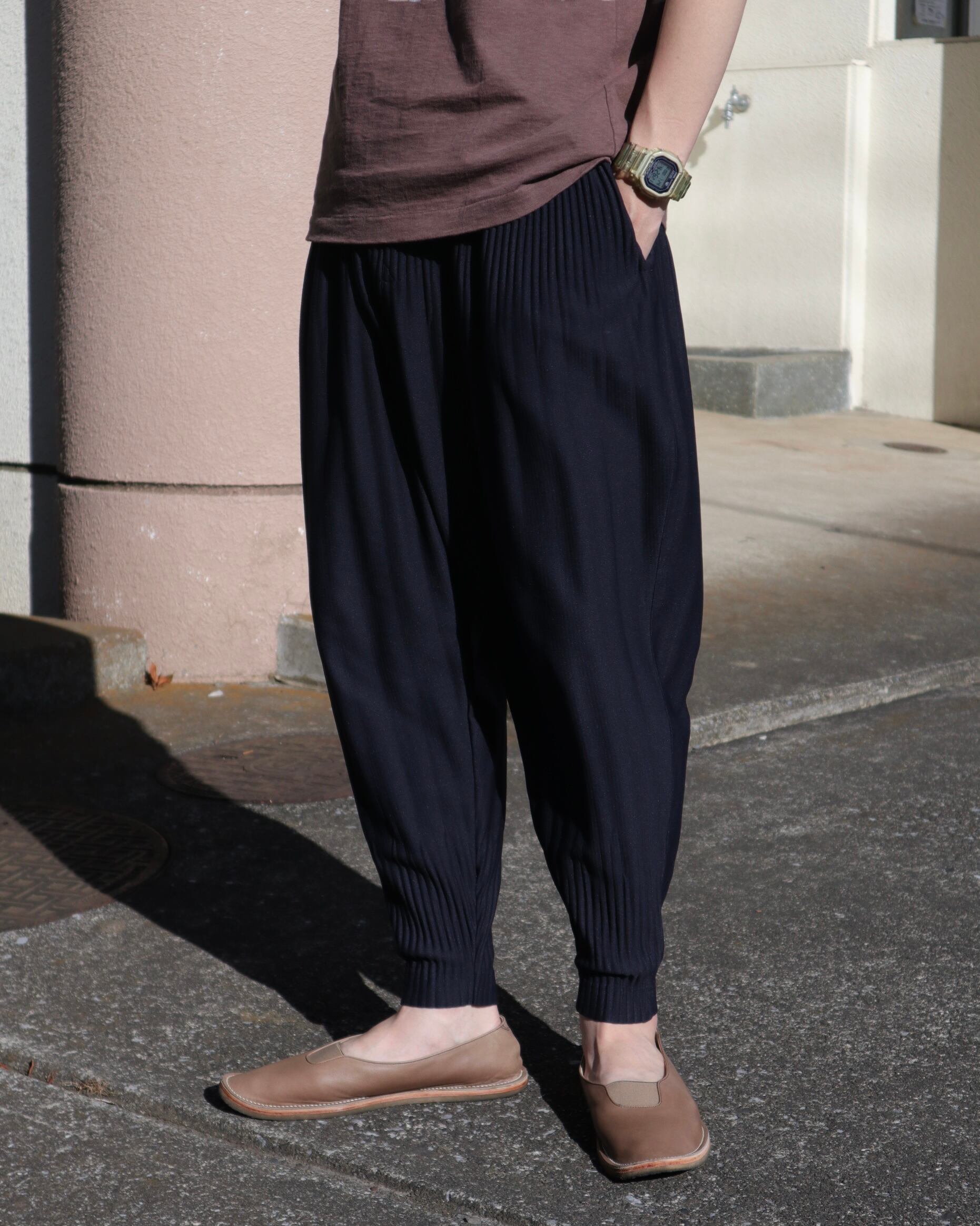 太もも辺りのプリーツを消した「消しプリーツ」パンツ