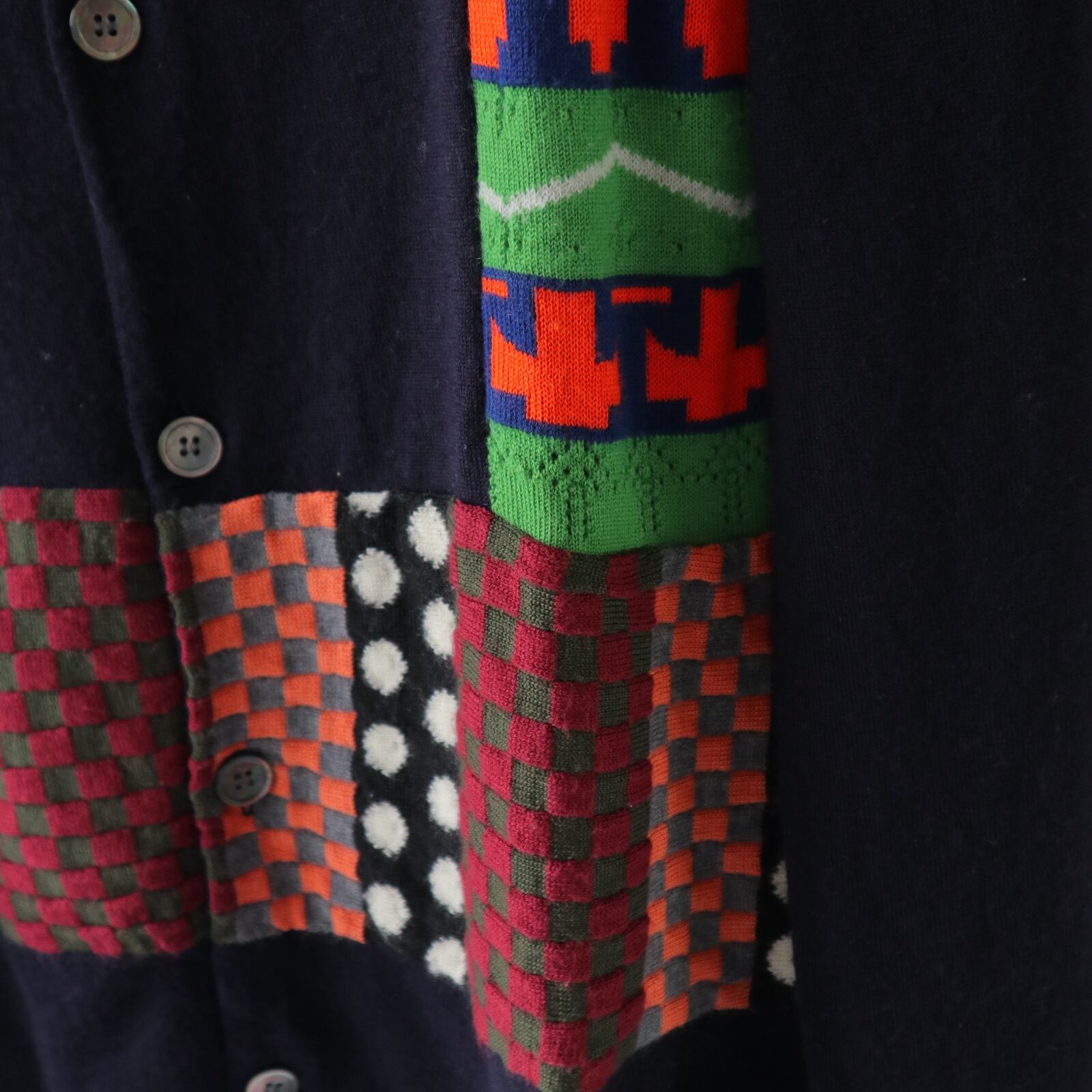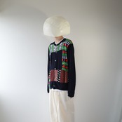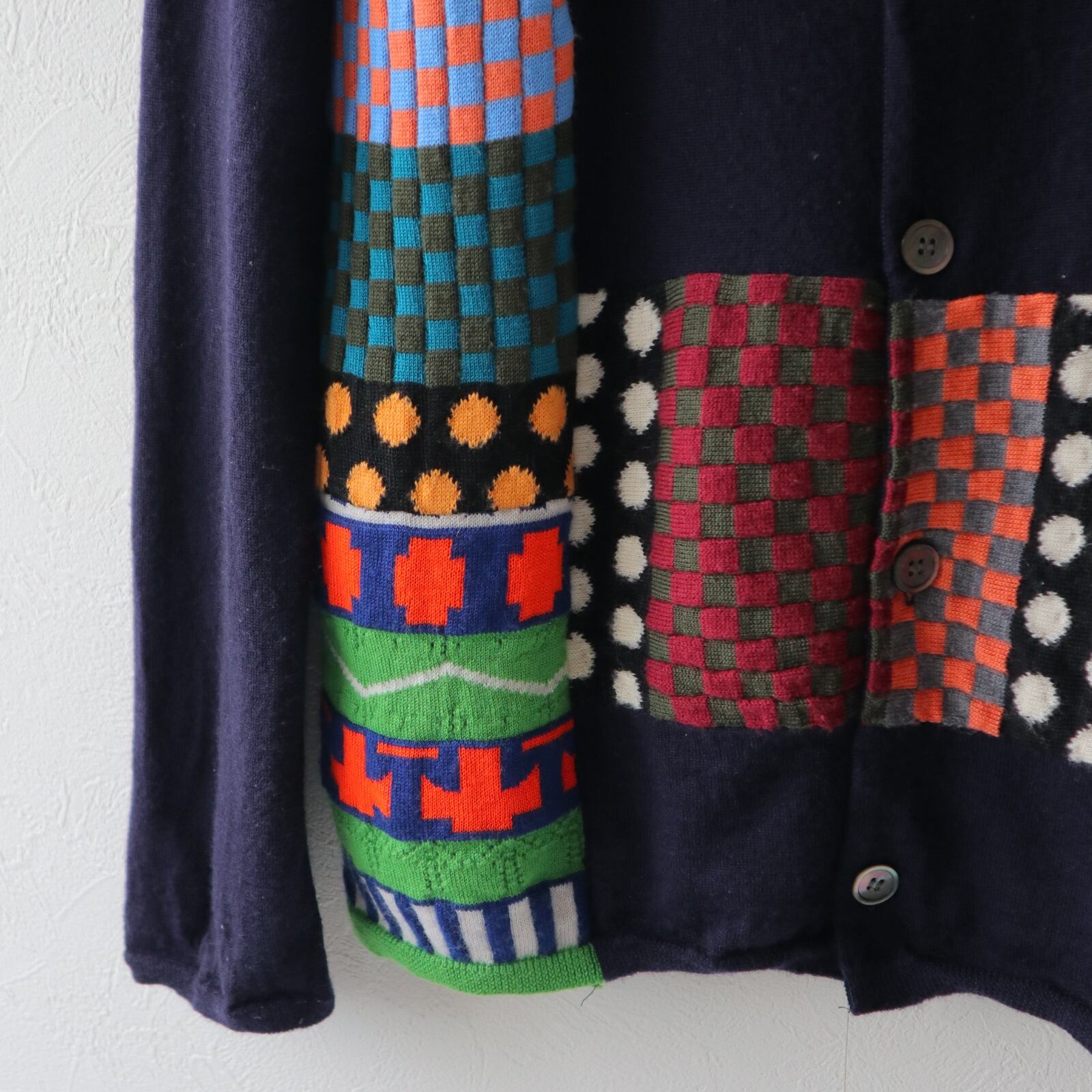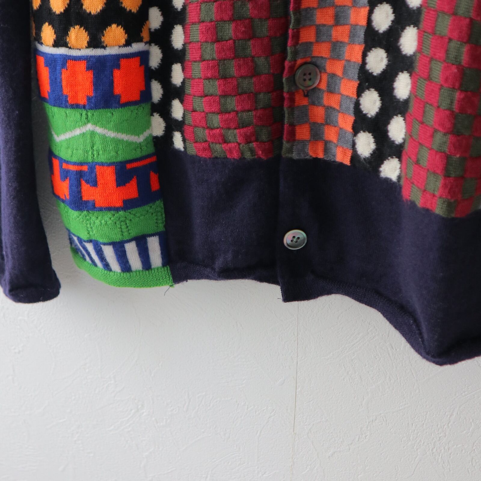 ネイビーのボディにSHIRTラインらしい、ポップで不思議な雰囲気のパッチワークが施された、ニットカーディガン