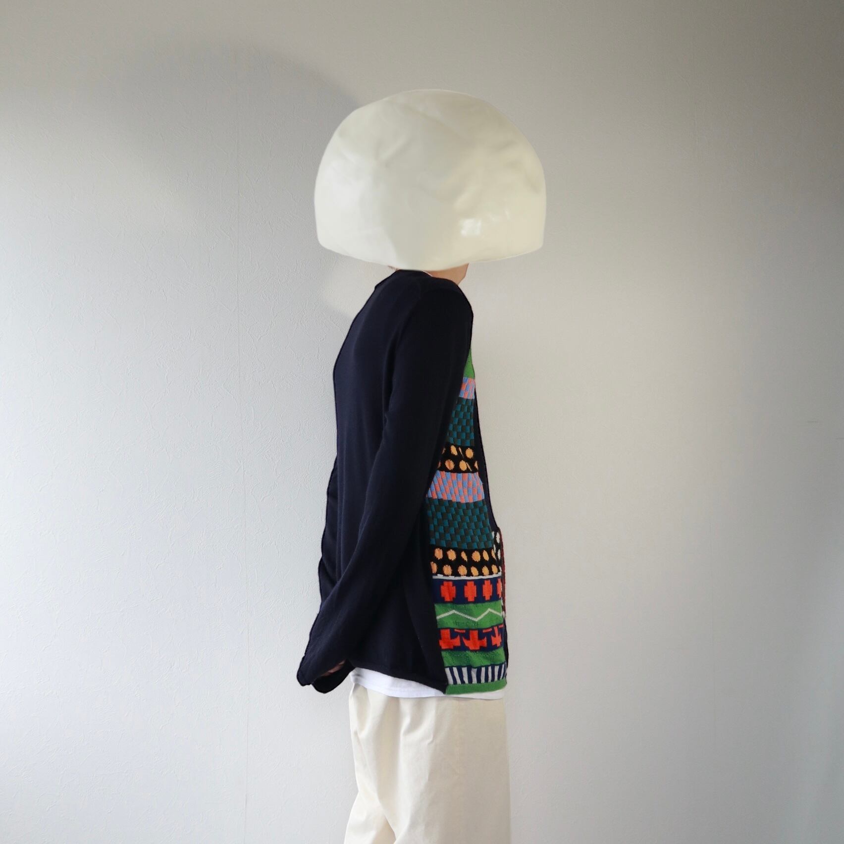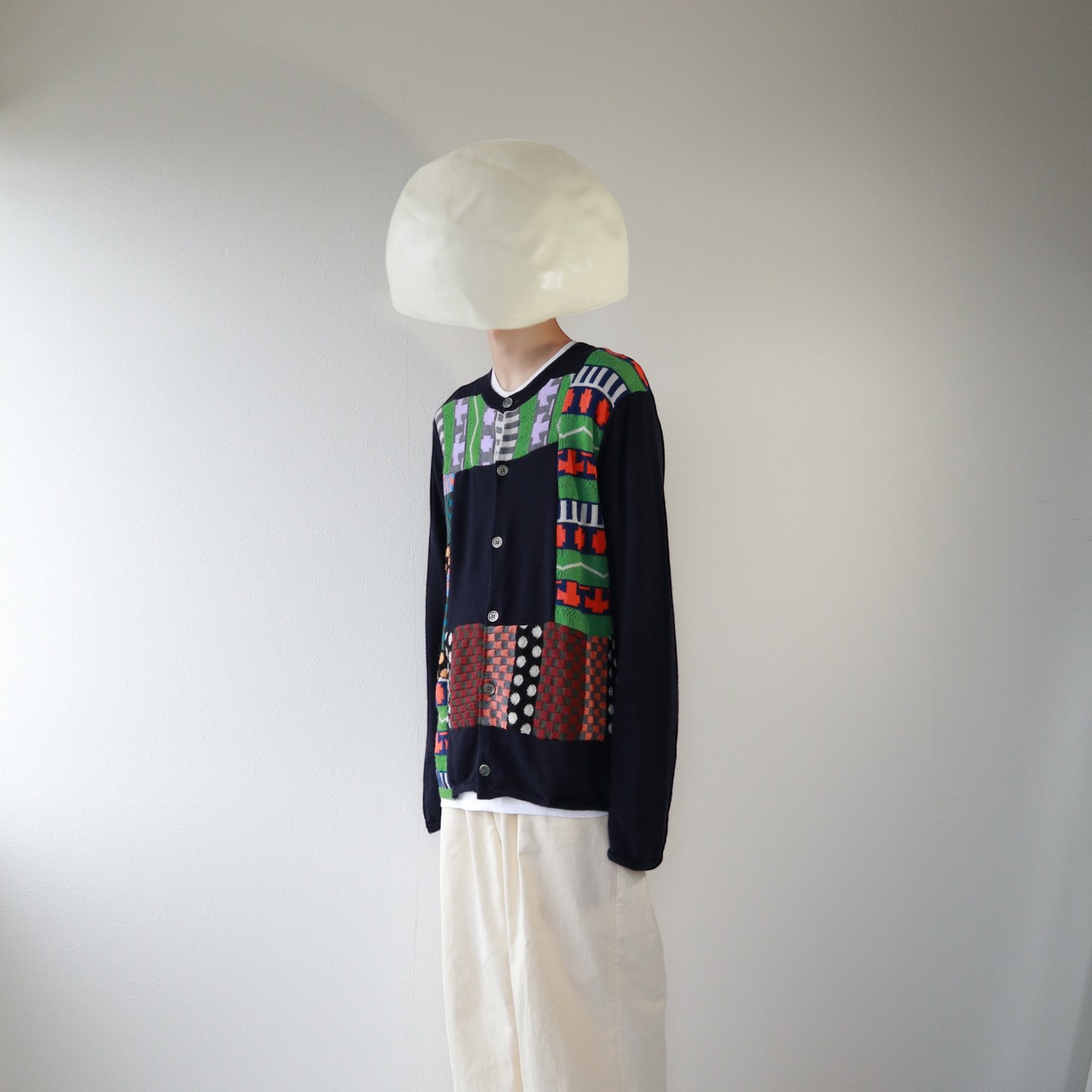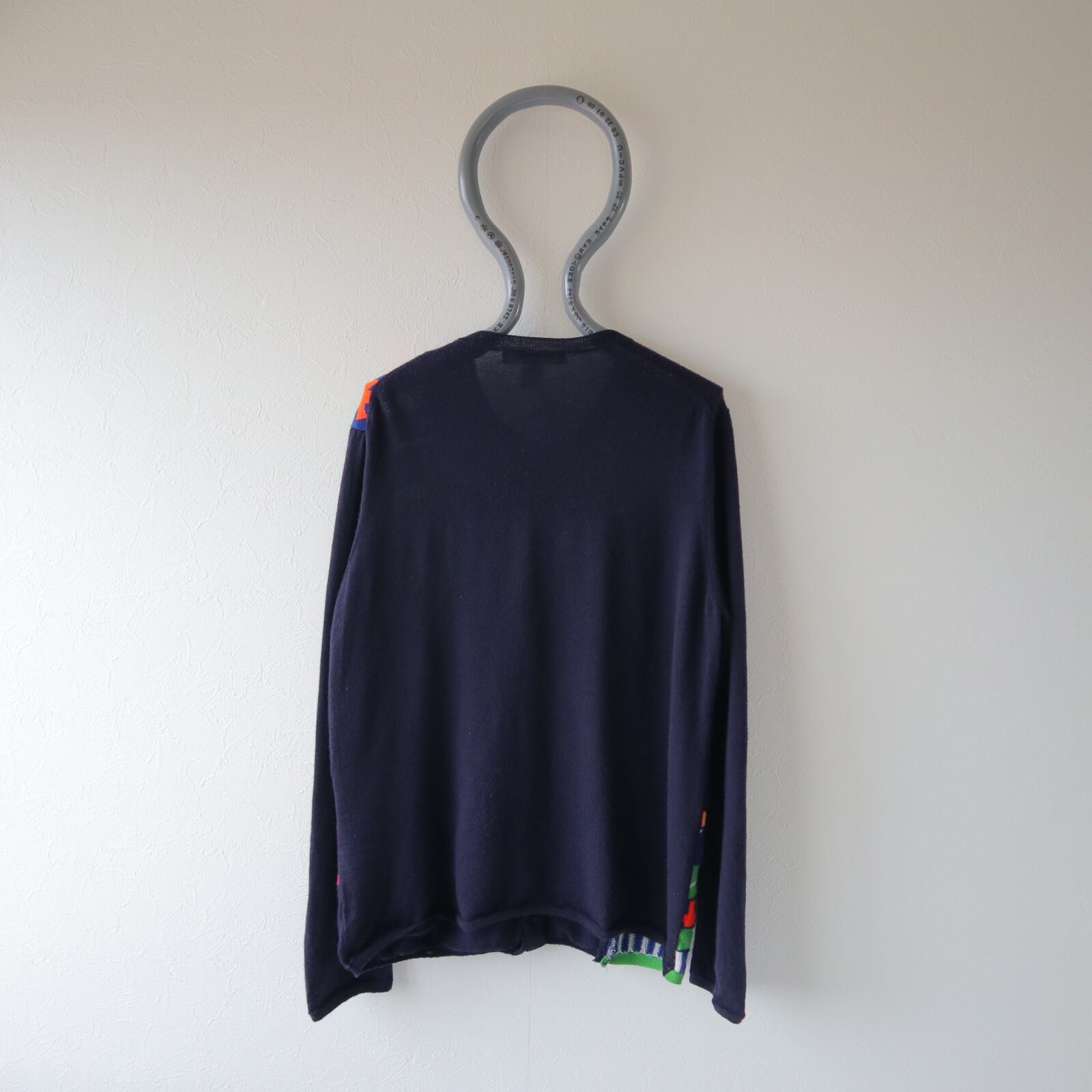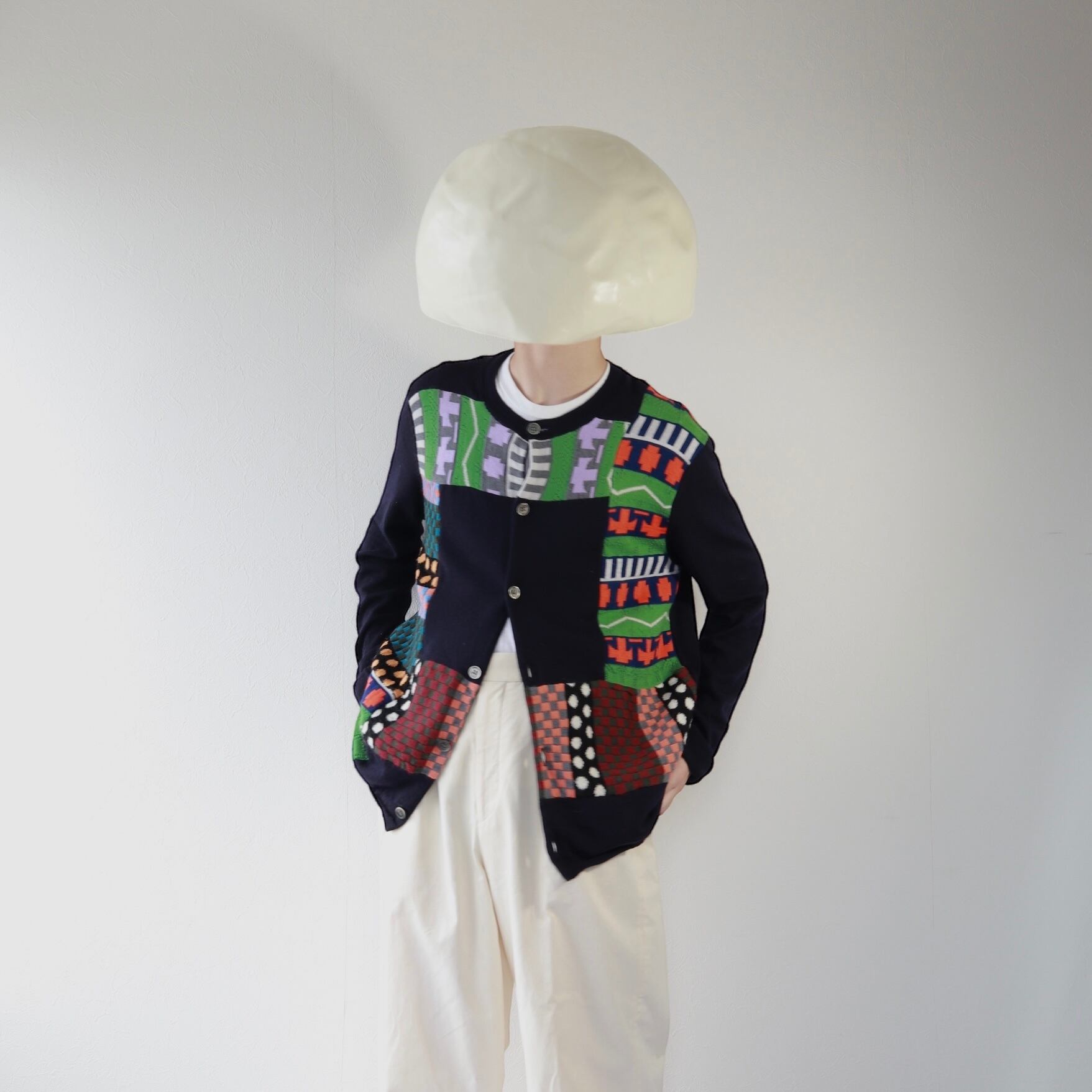 ネイビーのボディにSHIRTラインらしい、ポップで不思議な雰囲気のパッチワークが施された、ニットカーディガン