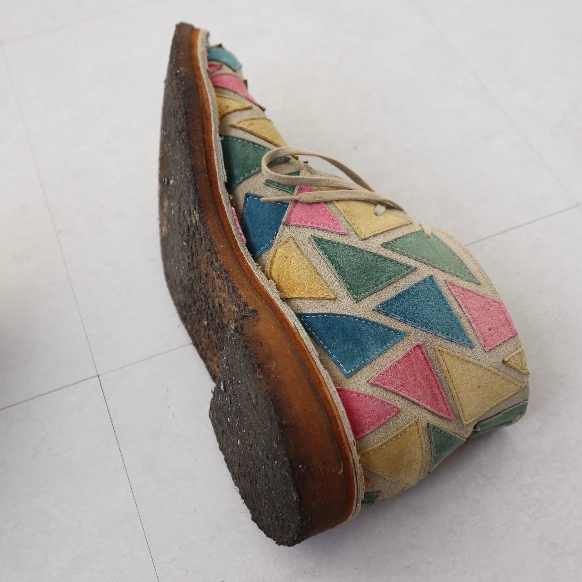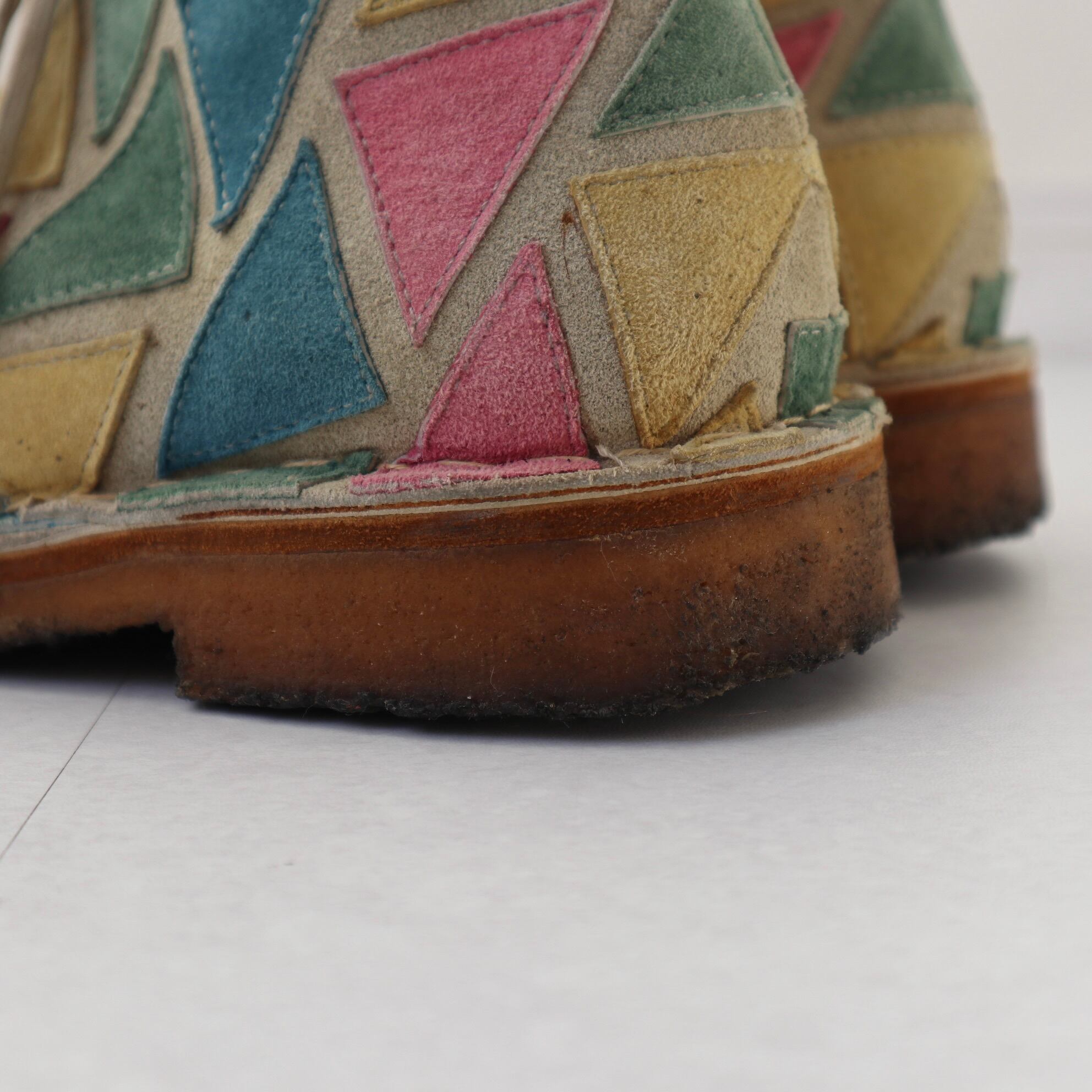 ピンクやブルー、グリーン、イエローの三角形のスウェードレザーパッチが付けられています。