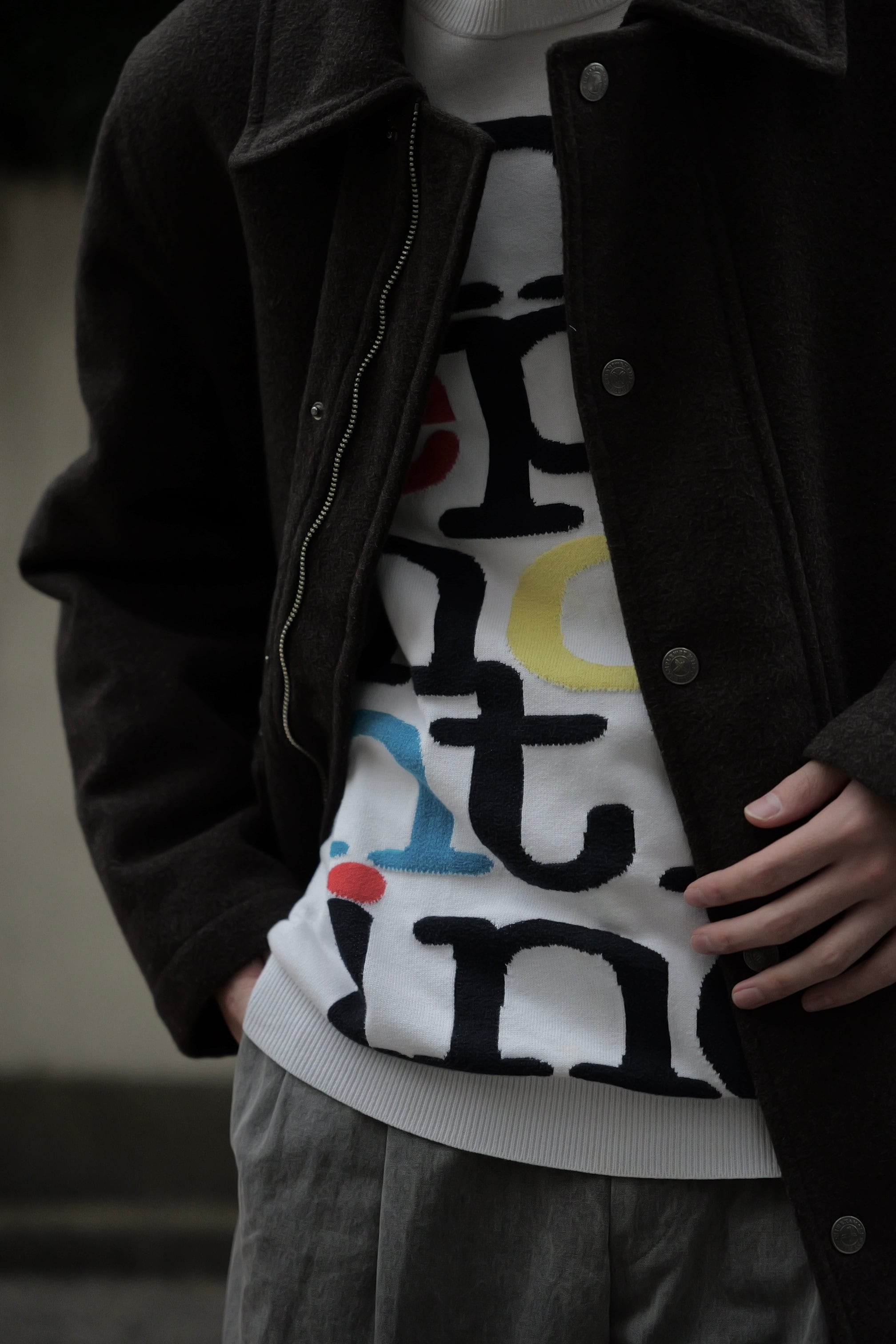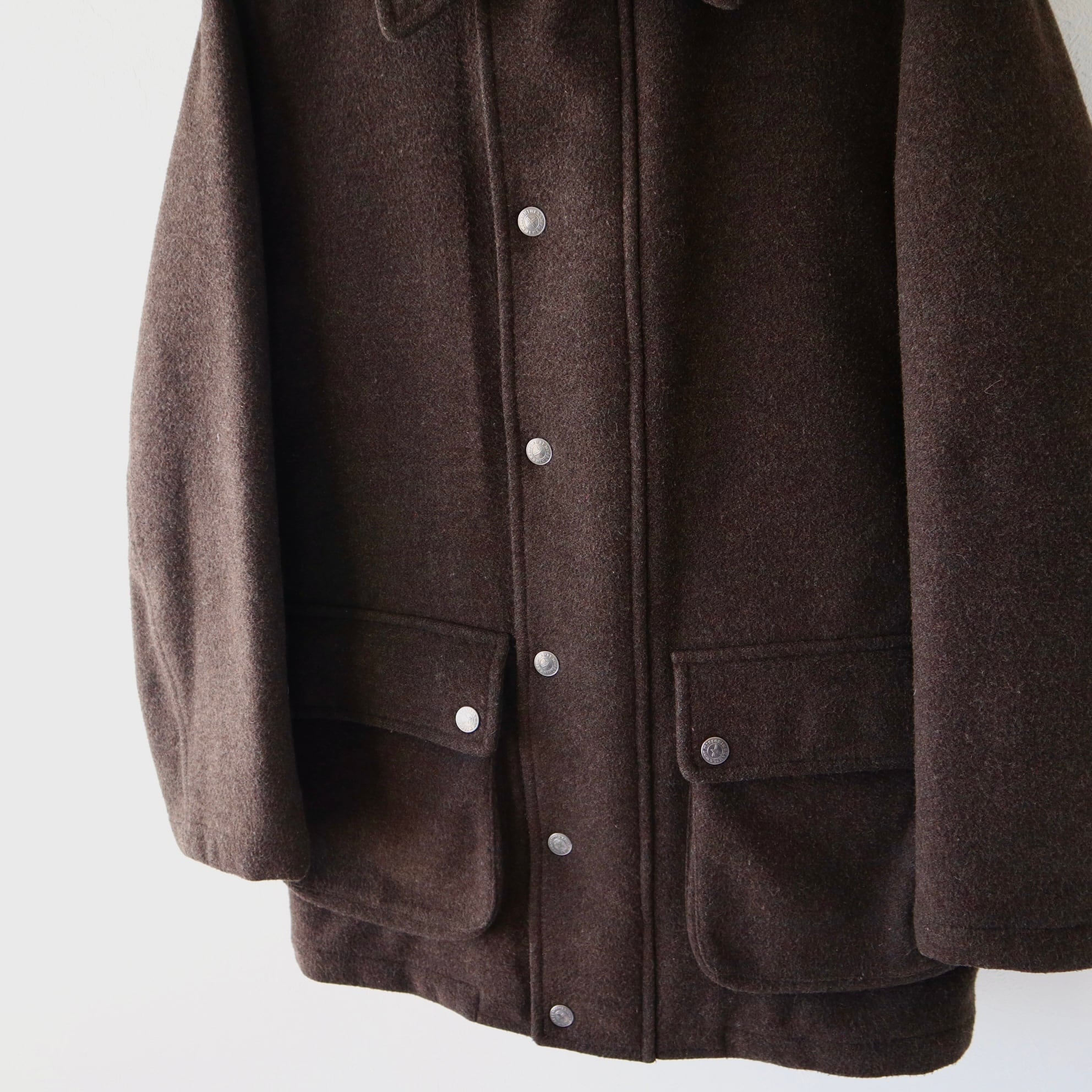 バブアーのような、ハンティング系のジャケットのような形で、クリーンなチャコールブラウンのメルトンってのが格好良いです。