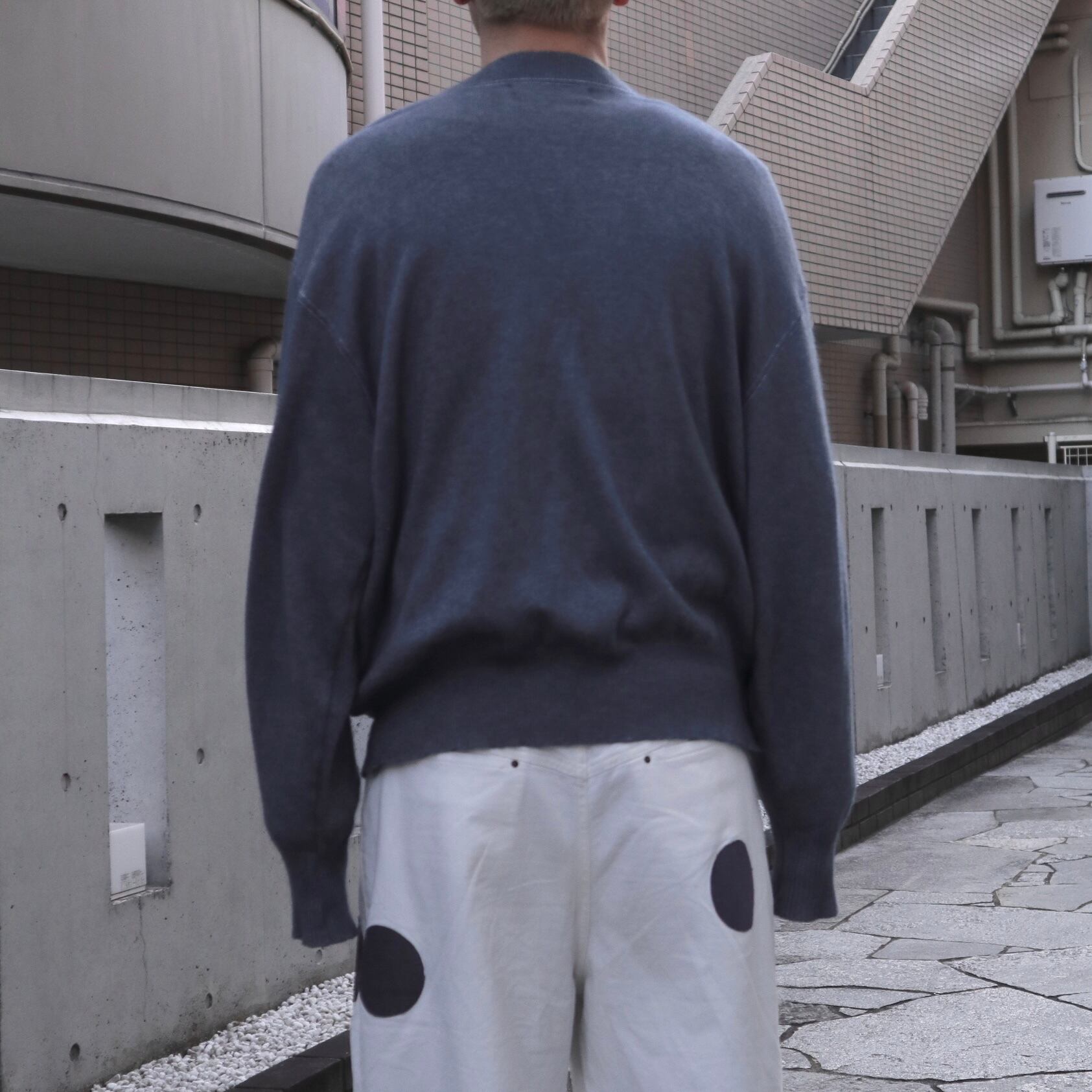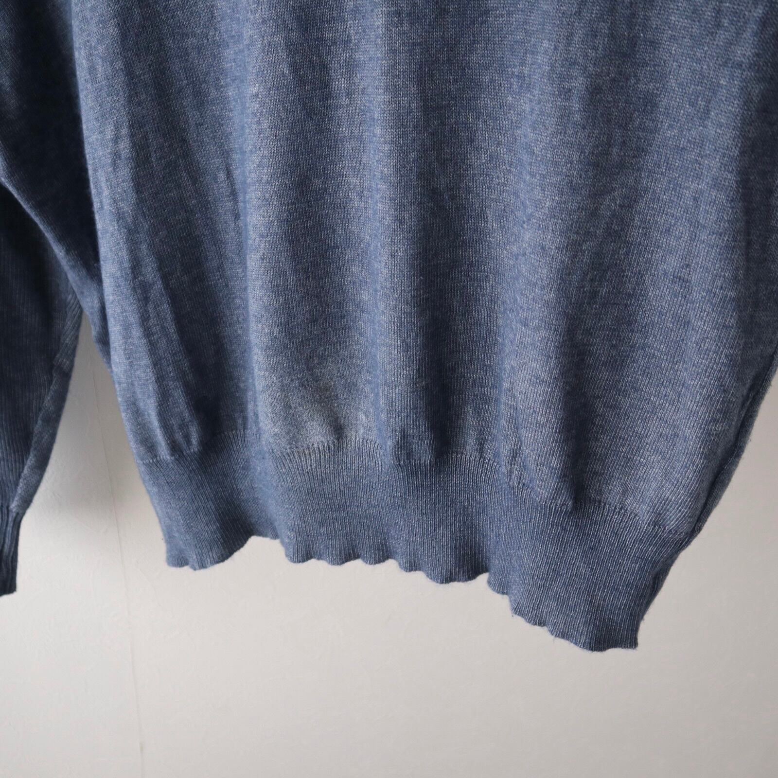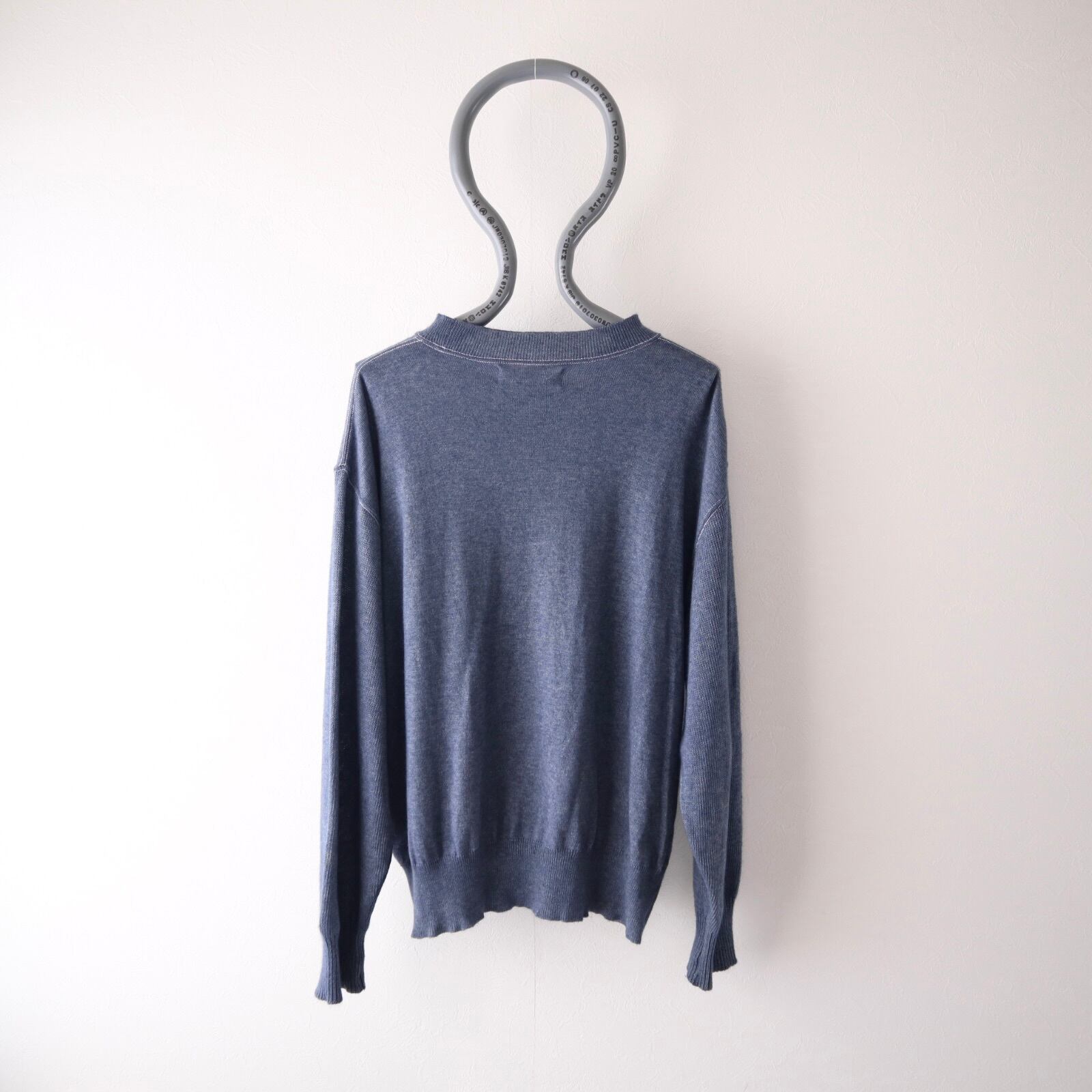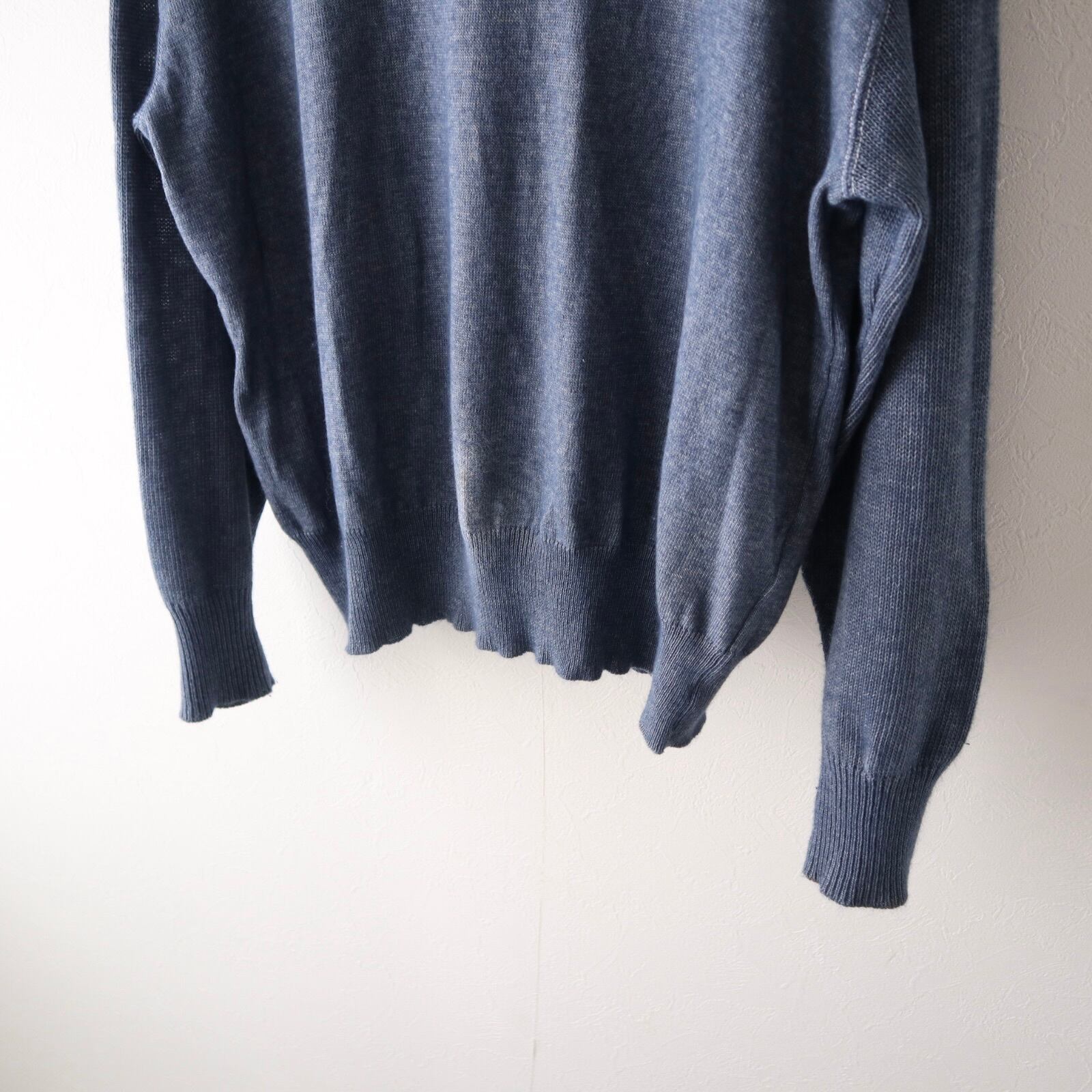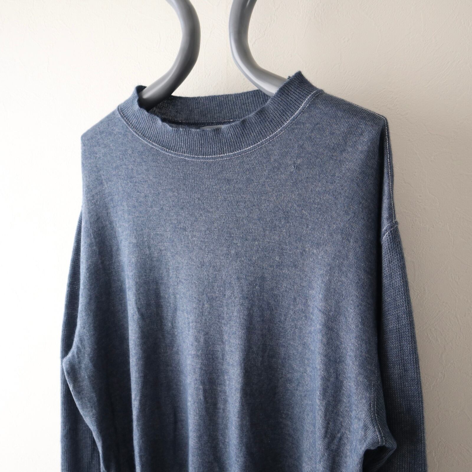 少し緑味の混じったブルーに、白っぽい糸が若干混じっていて、まるでシャンブレーの色味をニットで再現したようなルックスです。