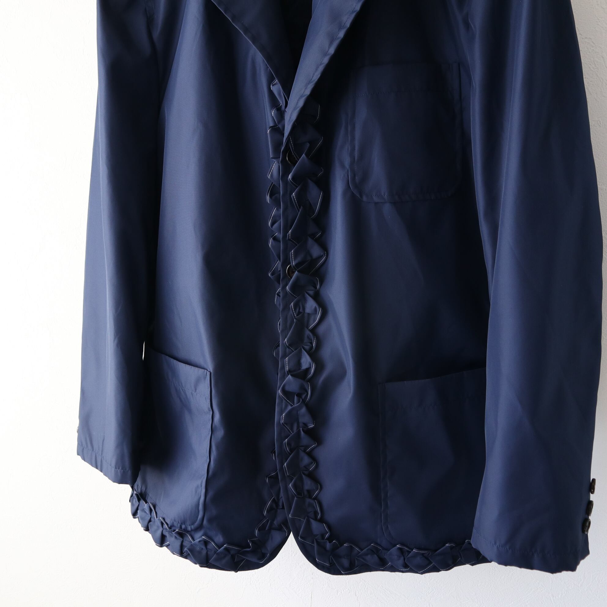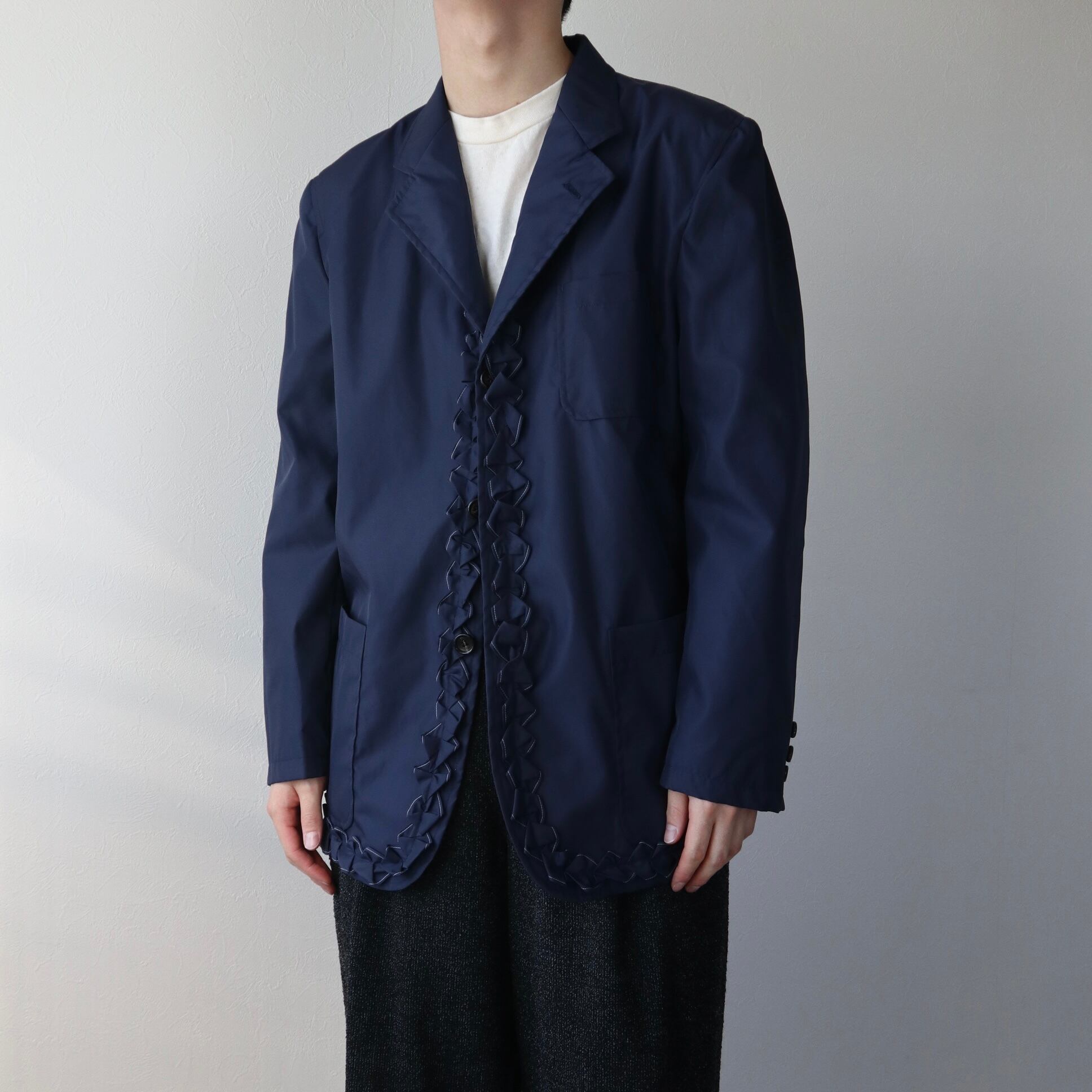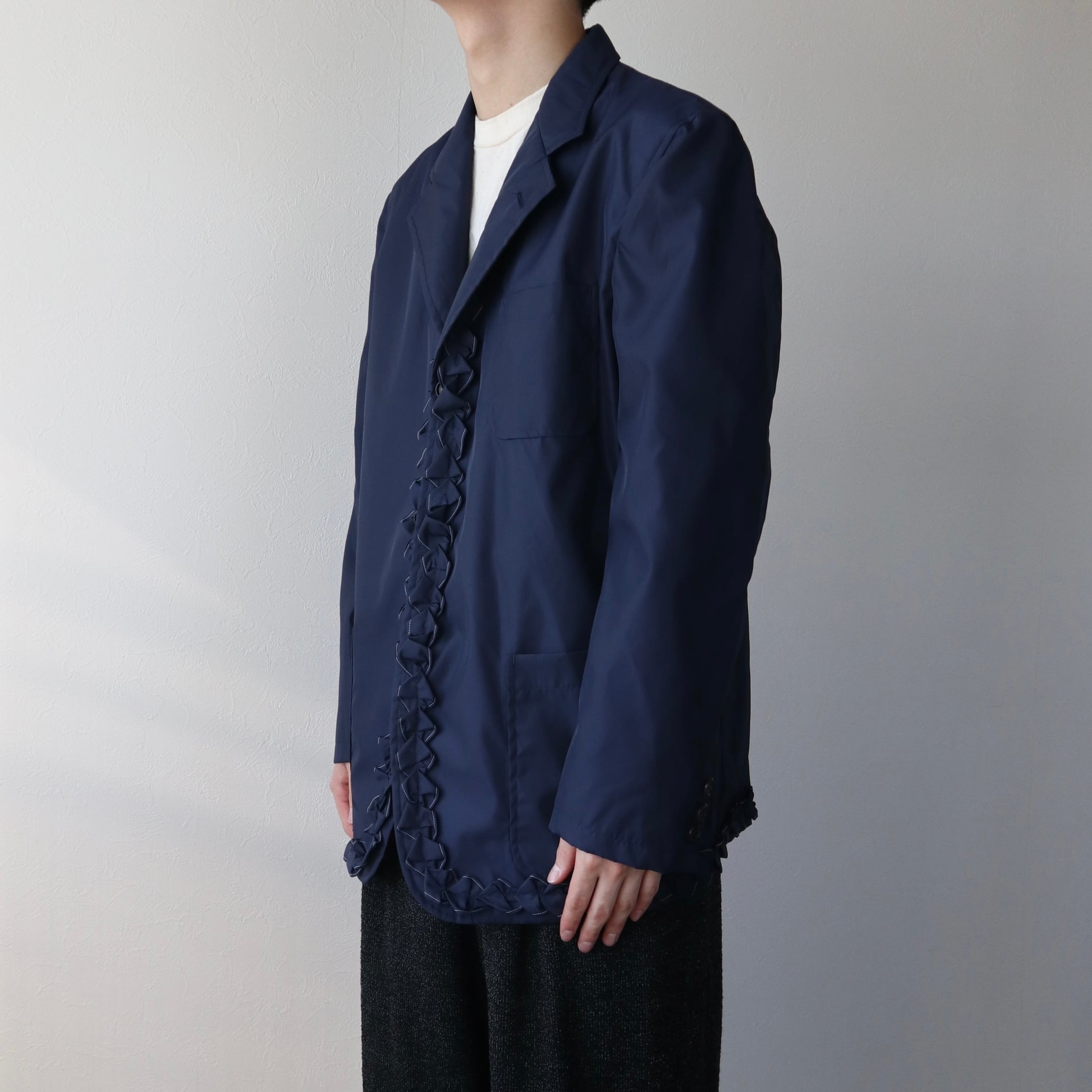HOMME PLUSのものはジャケットの裏側にフリルが付いていて、ルックではそれを裏返して着用していますが、こちらの個体のHOMMEのものはジャケットの表側にフリルが付いています