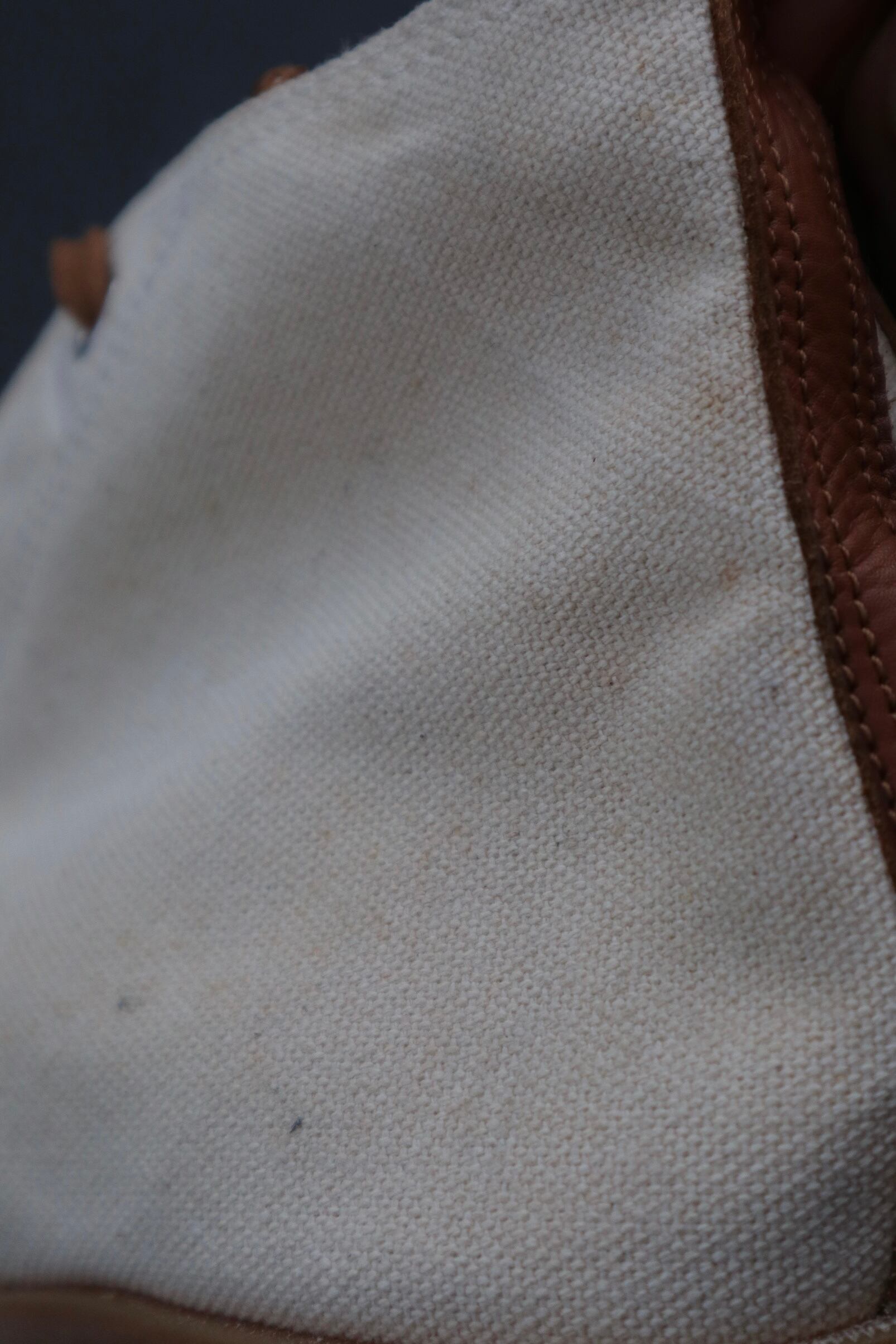 キャンバス部分の赤みのあるシミや、ガムソールの少し白味がかった部分からも、そのくらい古い雰囲気を感じます