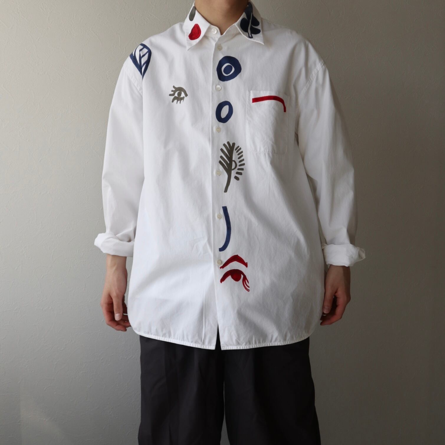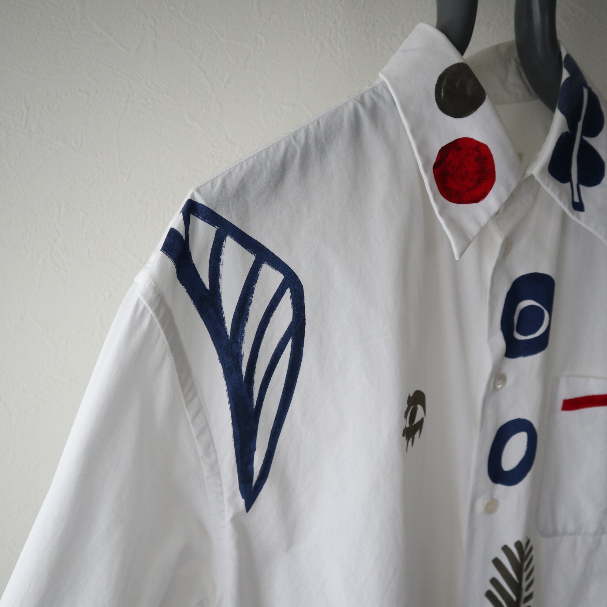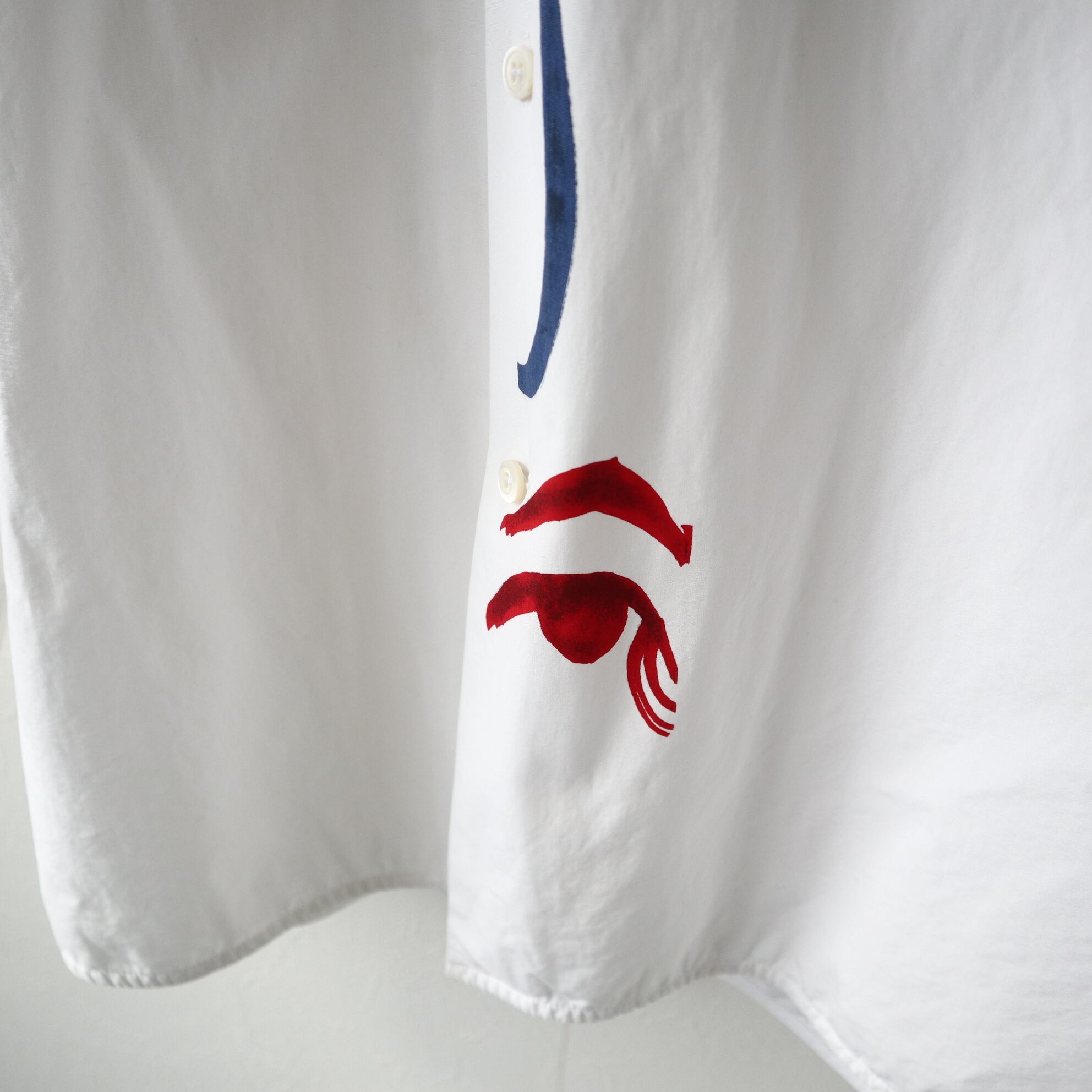 プレーンな白シャツにブルー、レッド、褪せたブラックのペイント