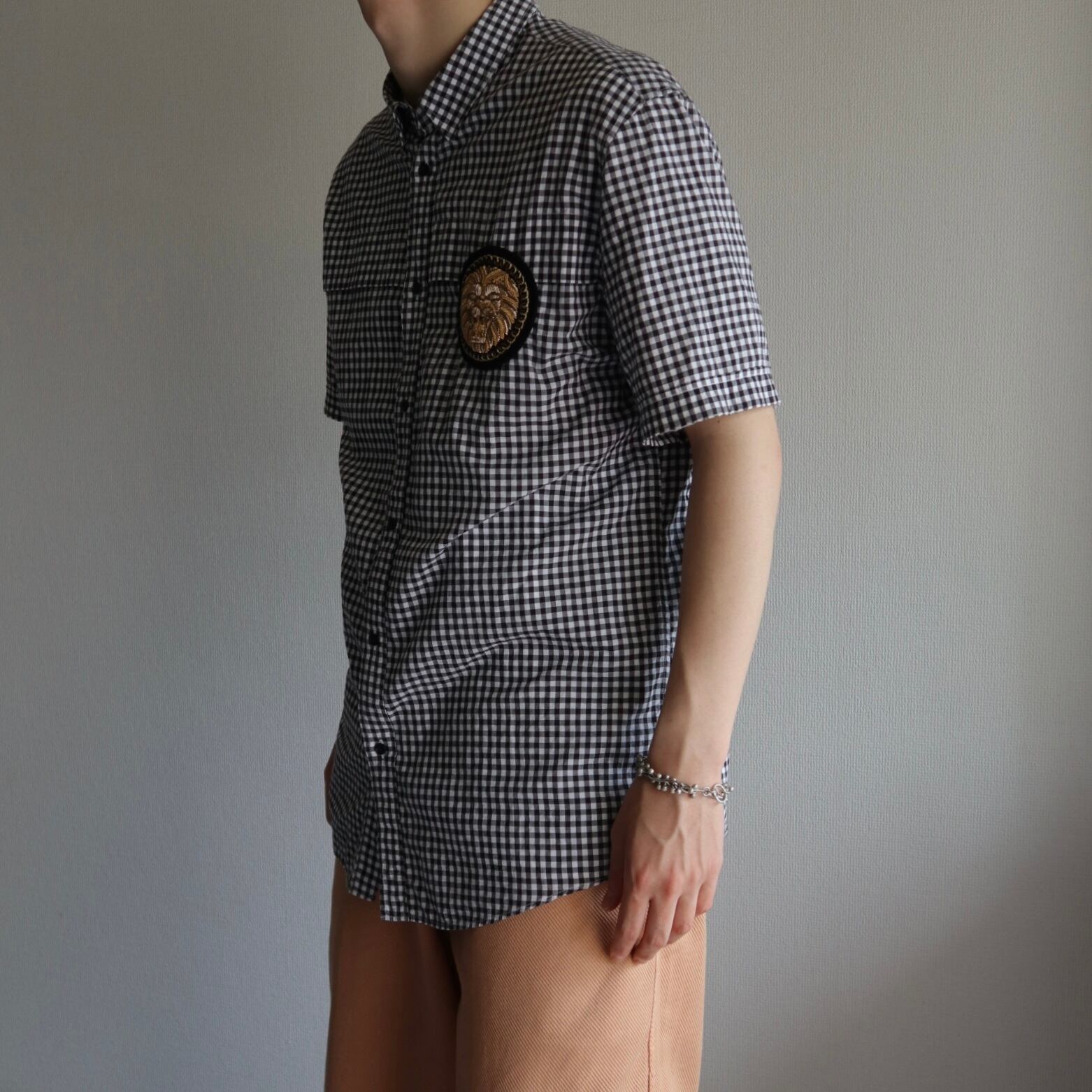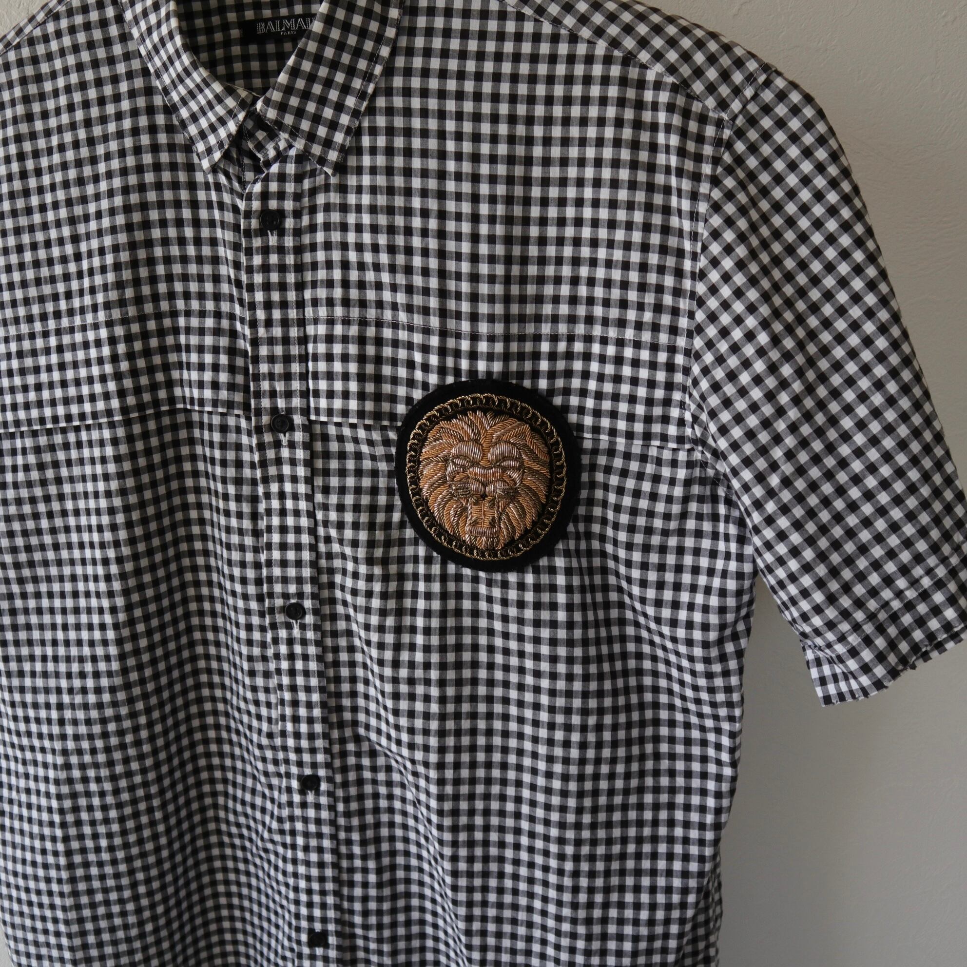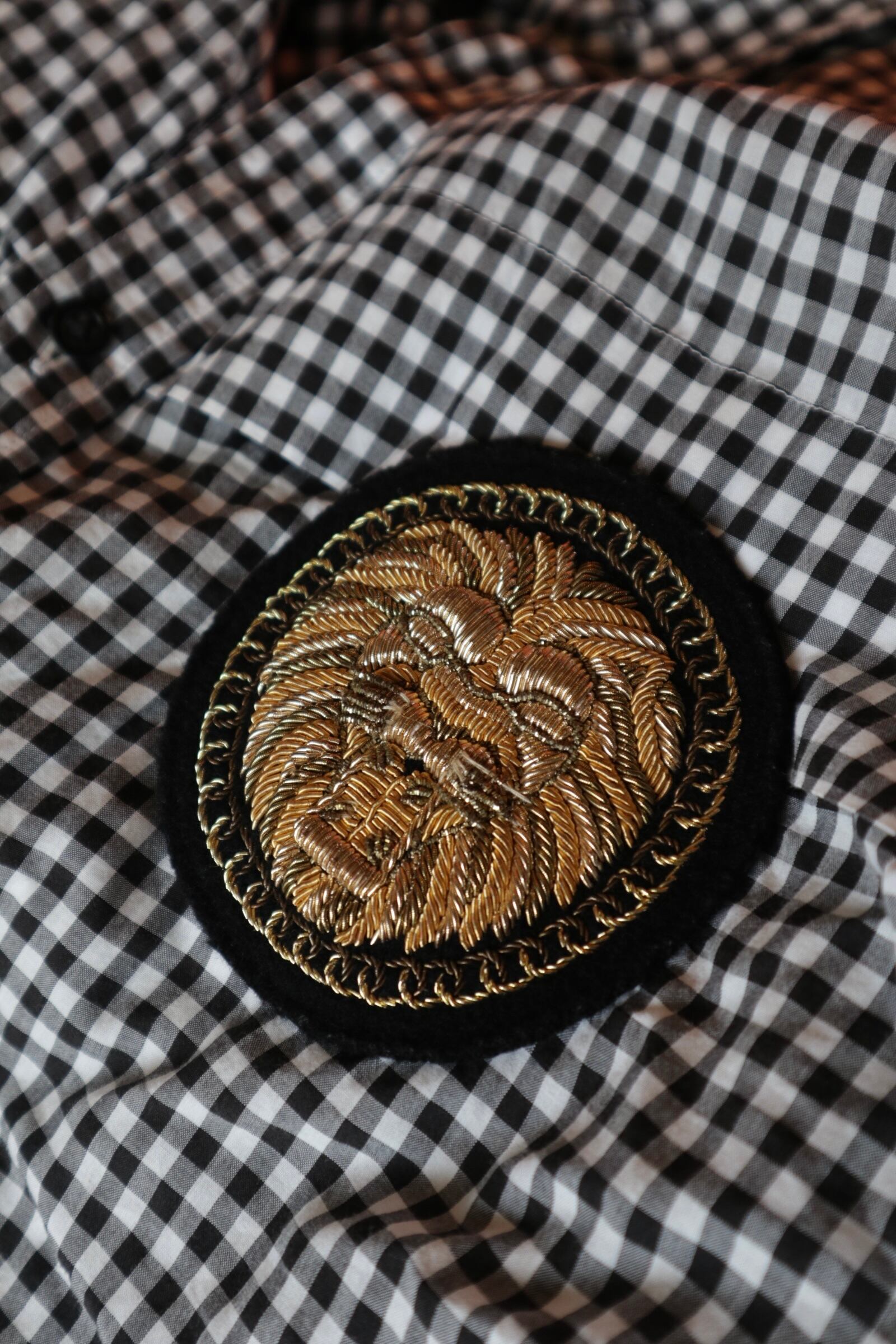 ギンガムチェックシャツに、黄金に輝くライオンのワッペン