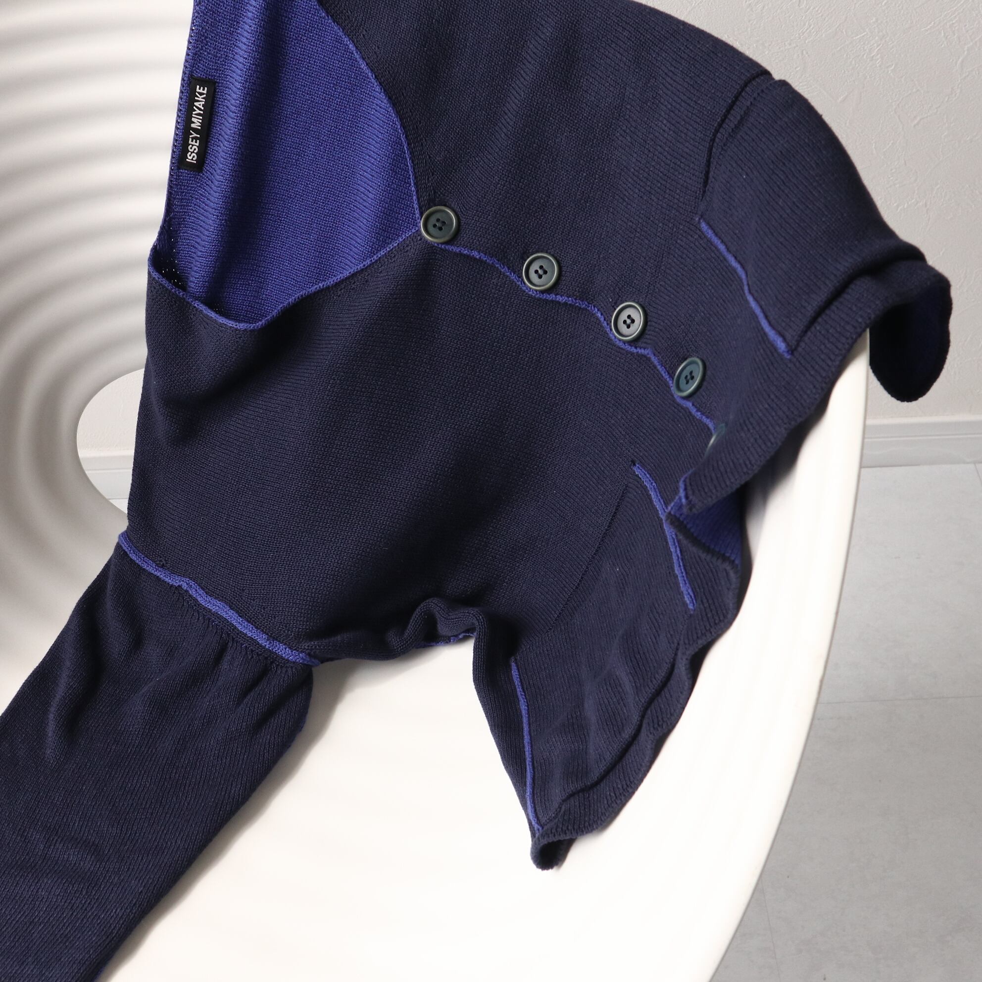 表はネイビー、裏はブルーのニット生地で、