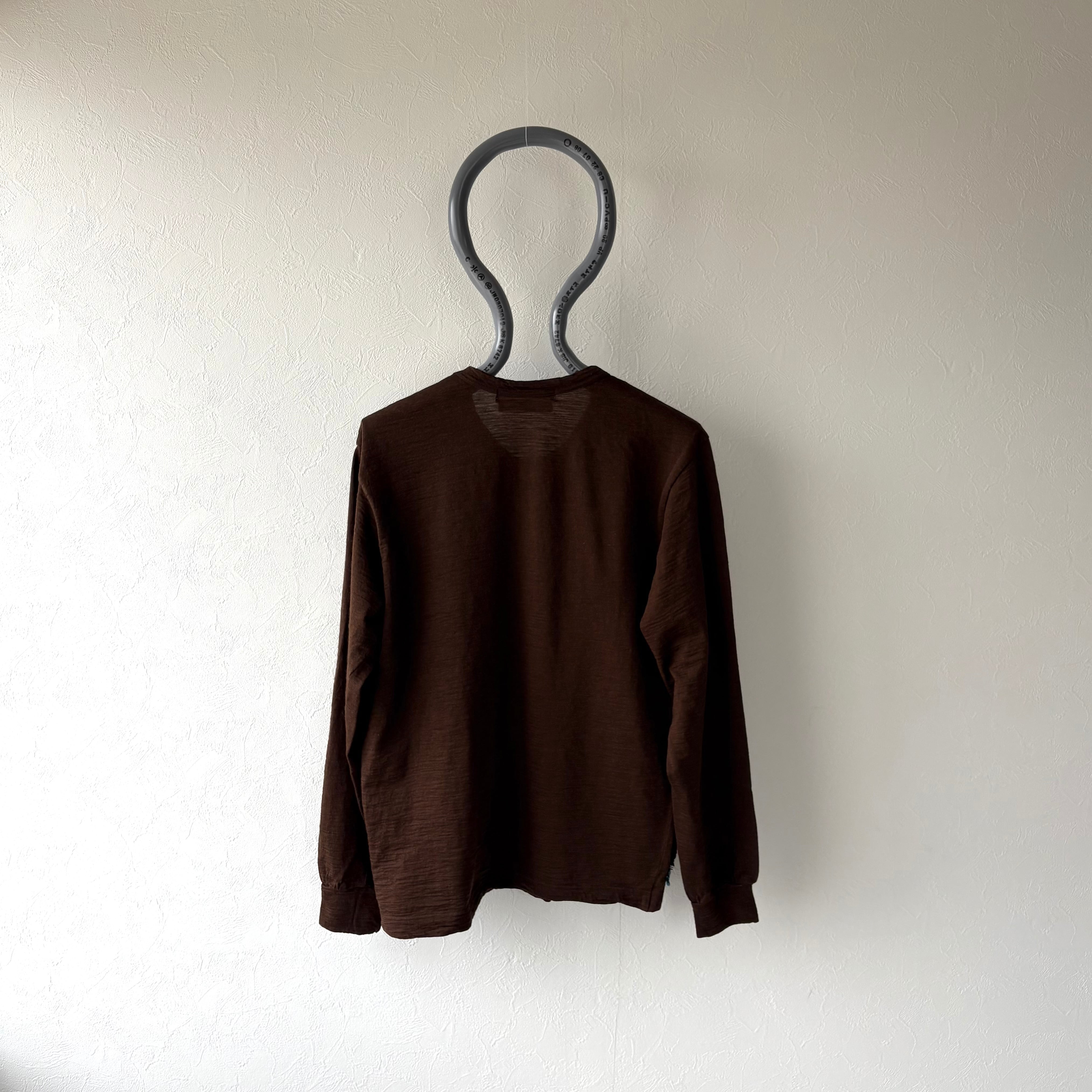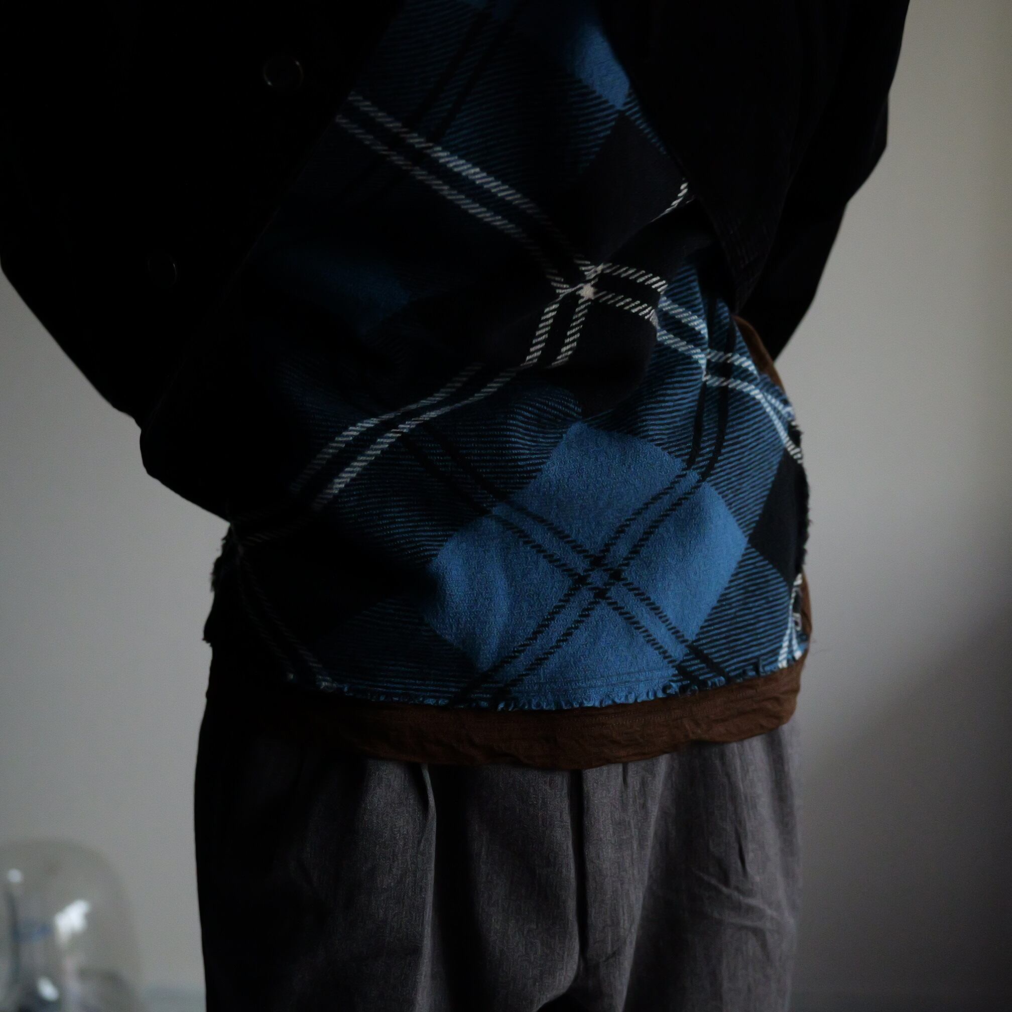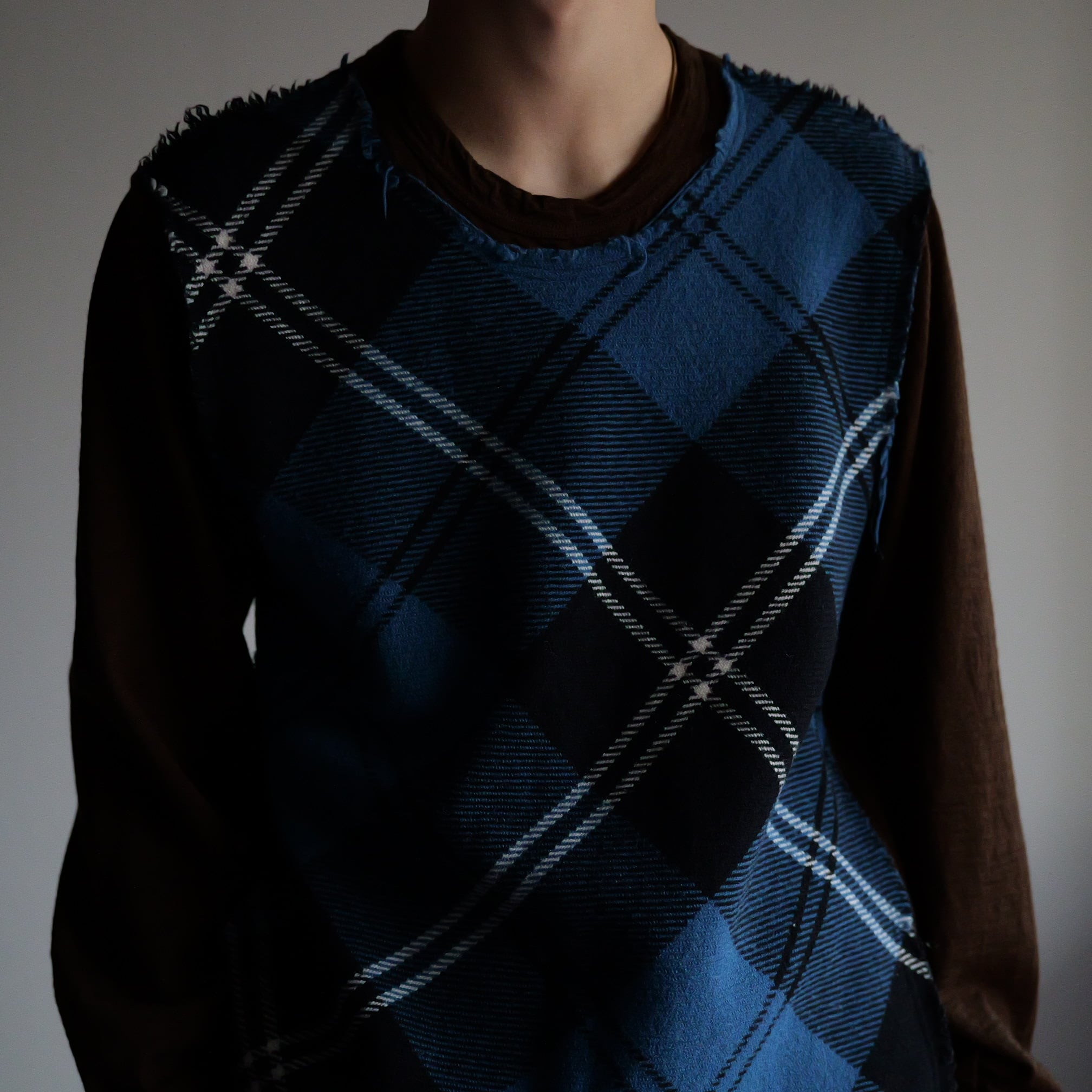ブラウンのボディに、ブルー/ブラック/ホワイトのバイアスのタータンチェックのニット生地が、縫い付けられています